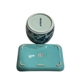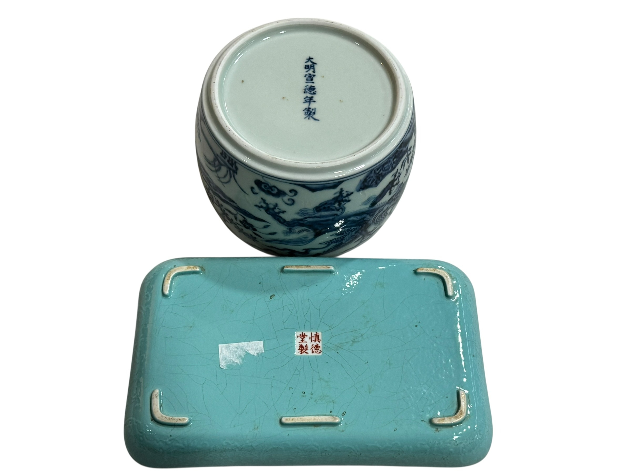 Chinese blue and white jar, and Chinese turquoise porcelain tray with raised decoration.