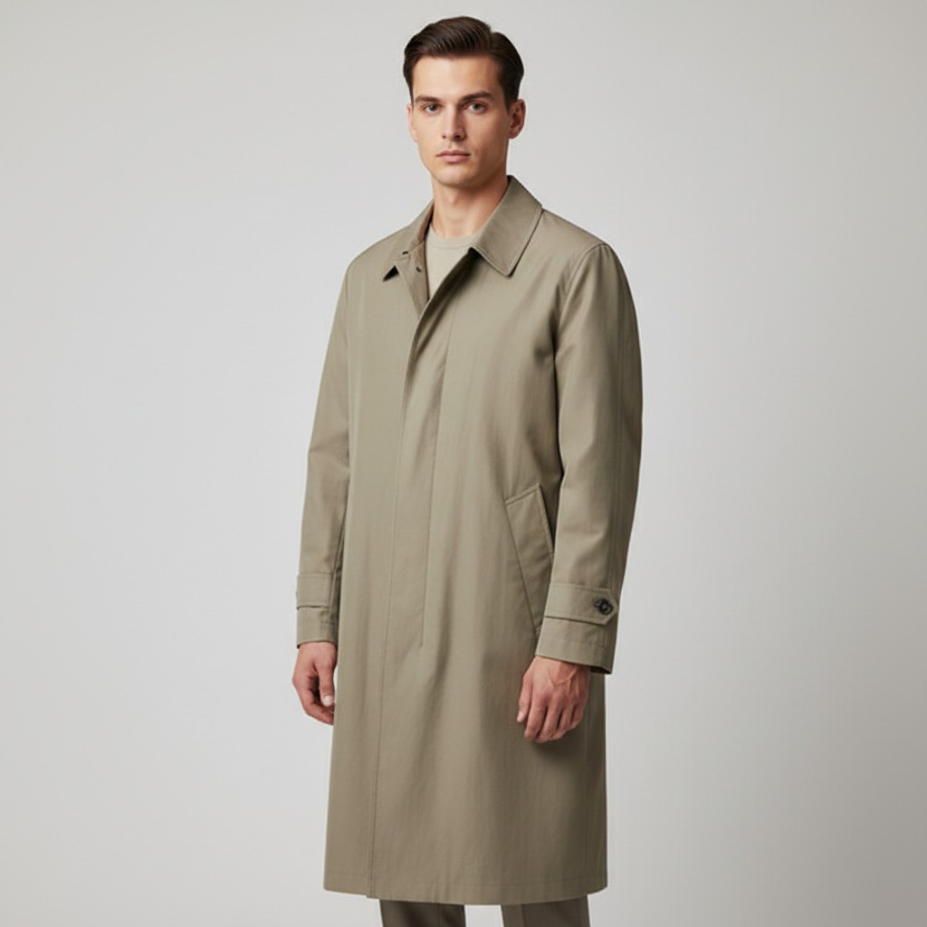 A Bugatti men’s olive green coat, of concealed button front with pointed collar, long sleeves and slant pockets, the interior with quilted lining and embroidered maker’s name. Approx. size - L - XL.