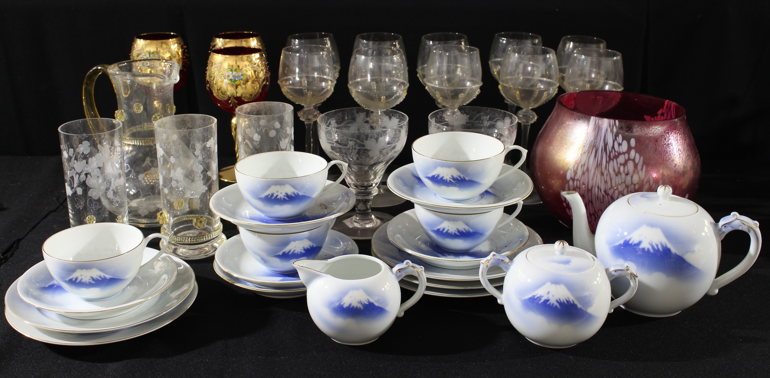 A set of ten Bavarian wine glasses; others, tumblers and jug; Bohemian wine glasses; a Royal Brierley Studio glass vase; a Japanese Fukagawa part tea service, qty