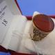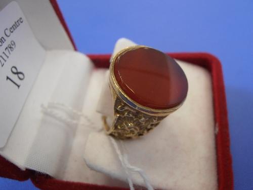 9 CT GOLD RING 7.5G HIGHLY ENGRAVED SEAL RING WITH BROWN STONE