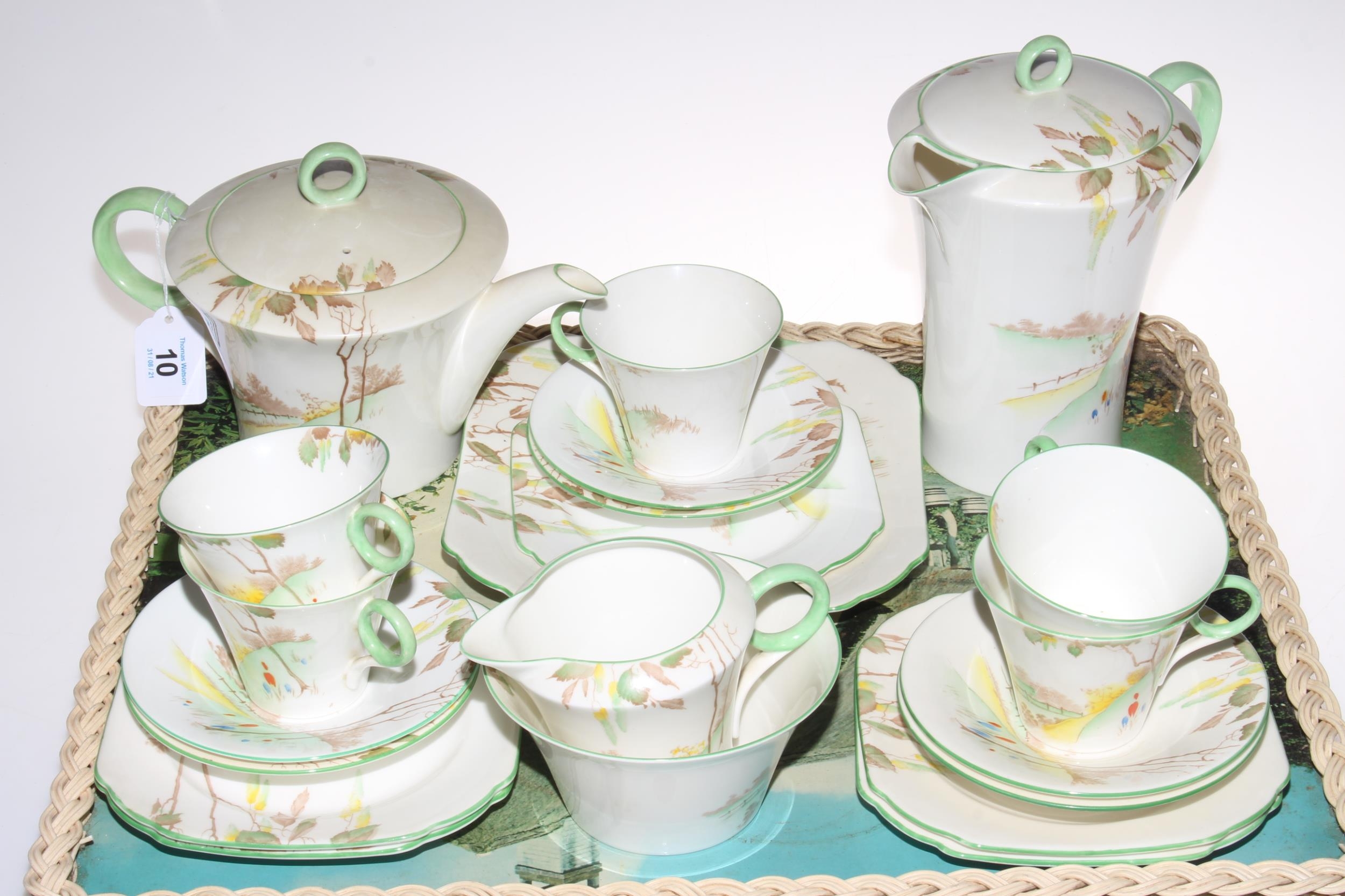 Shelley twenty one piece tea set with fenced landscape decoration, Reg No. 781613, Ideal China No. 067 (five cups and five tea plates).