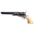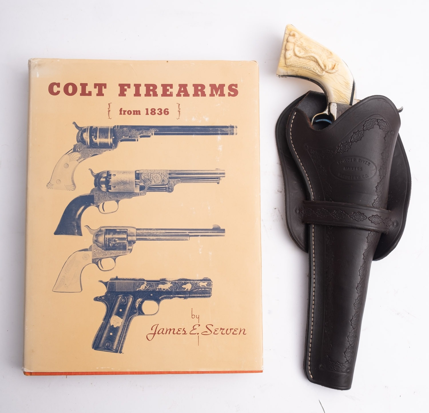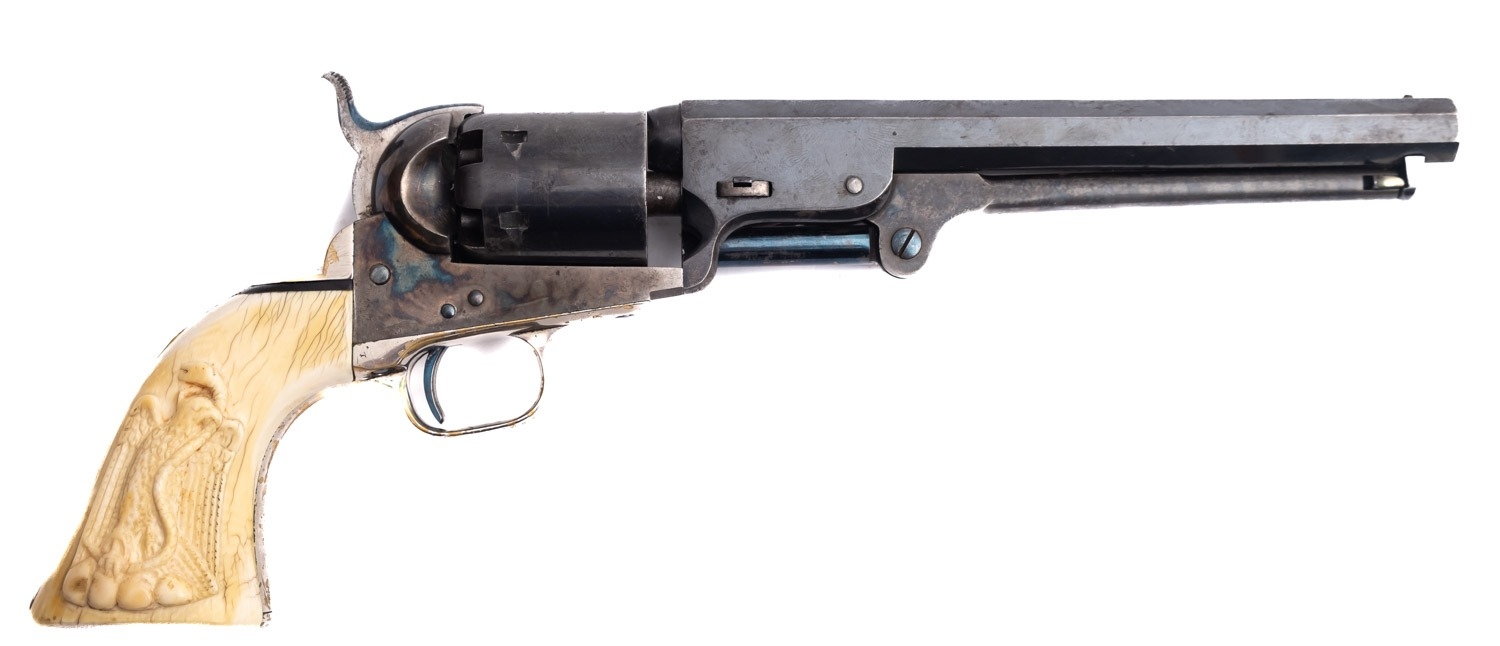 A Colt Navy 1851 model single action 6 shot revolver:, .36 calibre, 19cm blued sighted octagonal barrel stamped address 'Saml Colt, New York City', blued cylinder with Naval engagement scene, case hardened loading lever and frame, Colts Patent' stamped to frame, plated brass trigger guard and back strap, two piece ivory grips with eagle and snake relief to right hand grip, matching number 11630 throughout. in a later brown leather holster, together with a copy of Serven, J.'Colt Firearms from 1836', Stackpole Books 1981.. *Ivory Certificate RLWCFDCZ