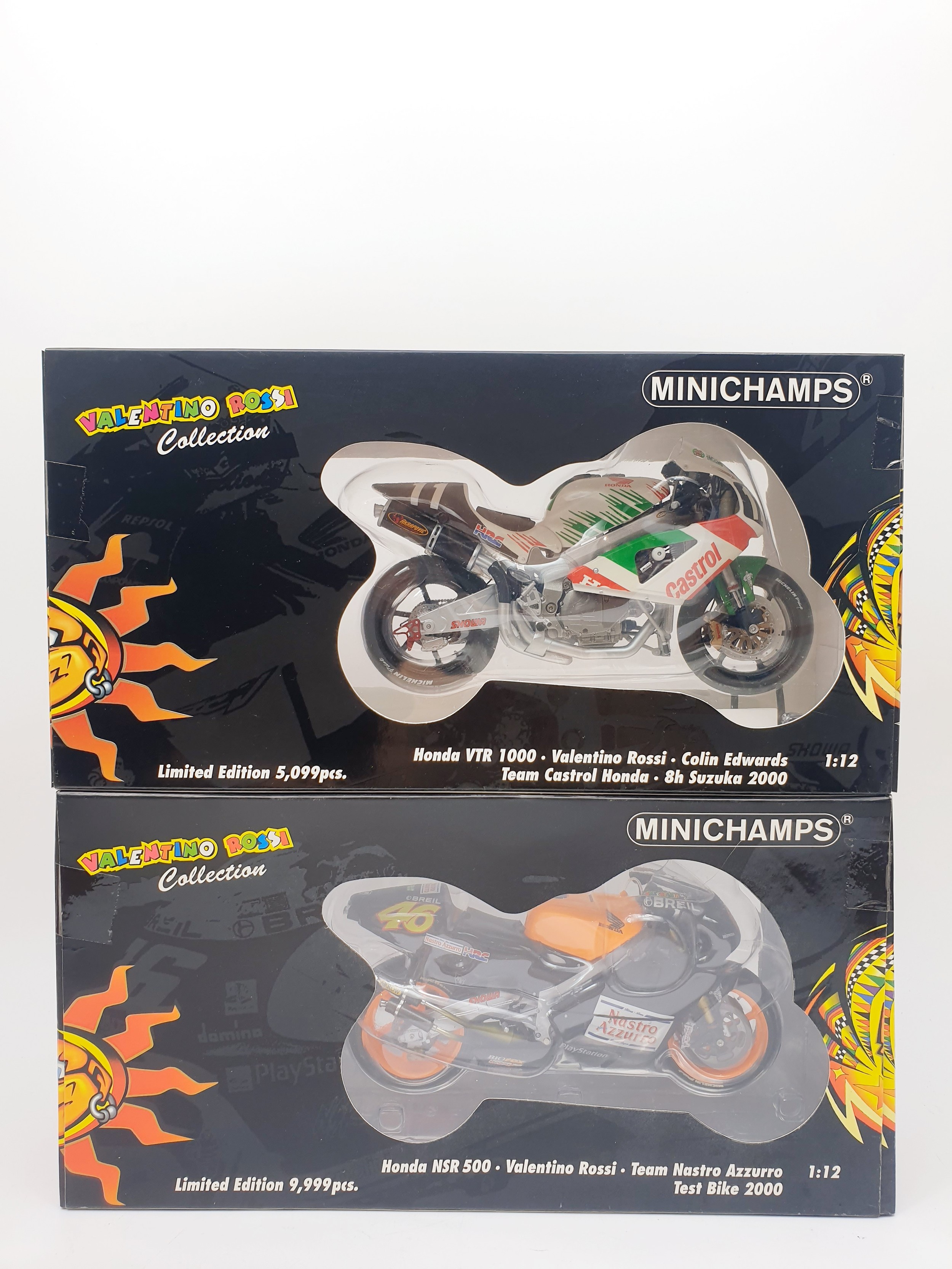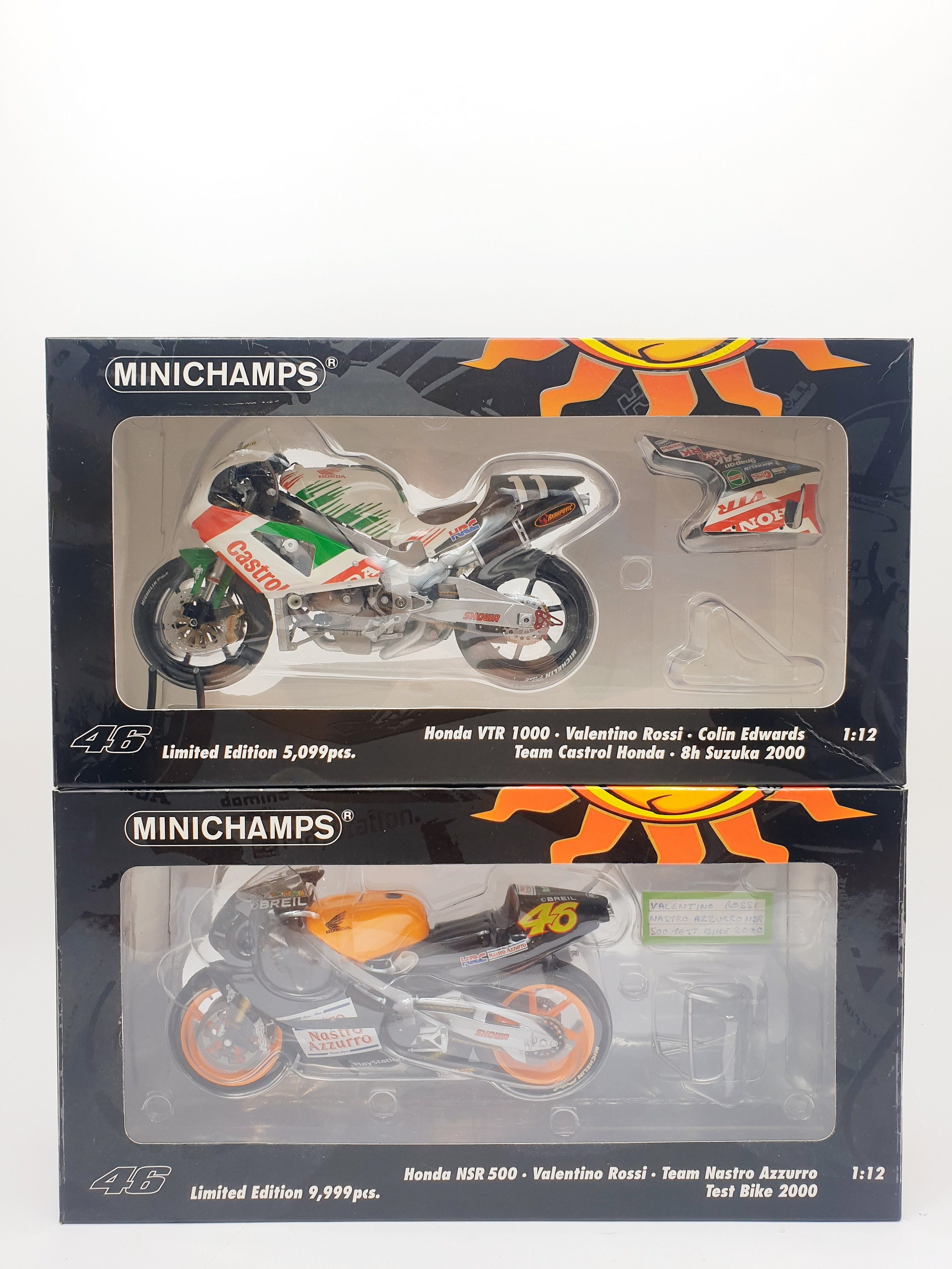 Minichamps Pauls Model 1:12 scale Valentino Rossi Honda NSR 500 Team Nastro Azzuro Test Bike 2000 & Honda VTR 1000 Colin Edwards Team Castrol Honda 8H Suzuka 2000 bike.