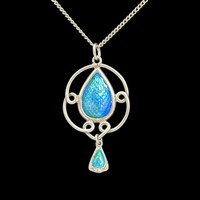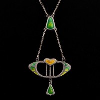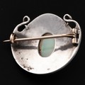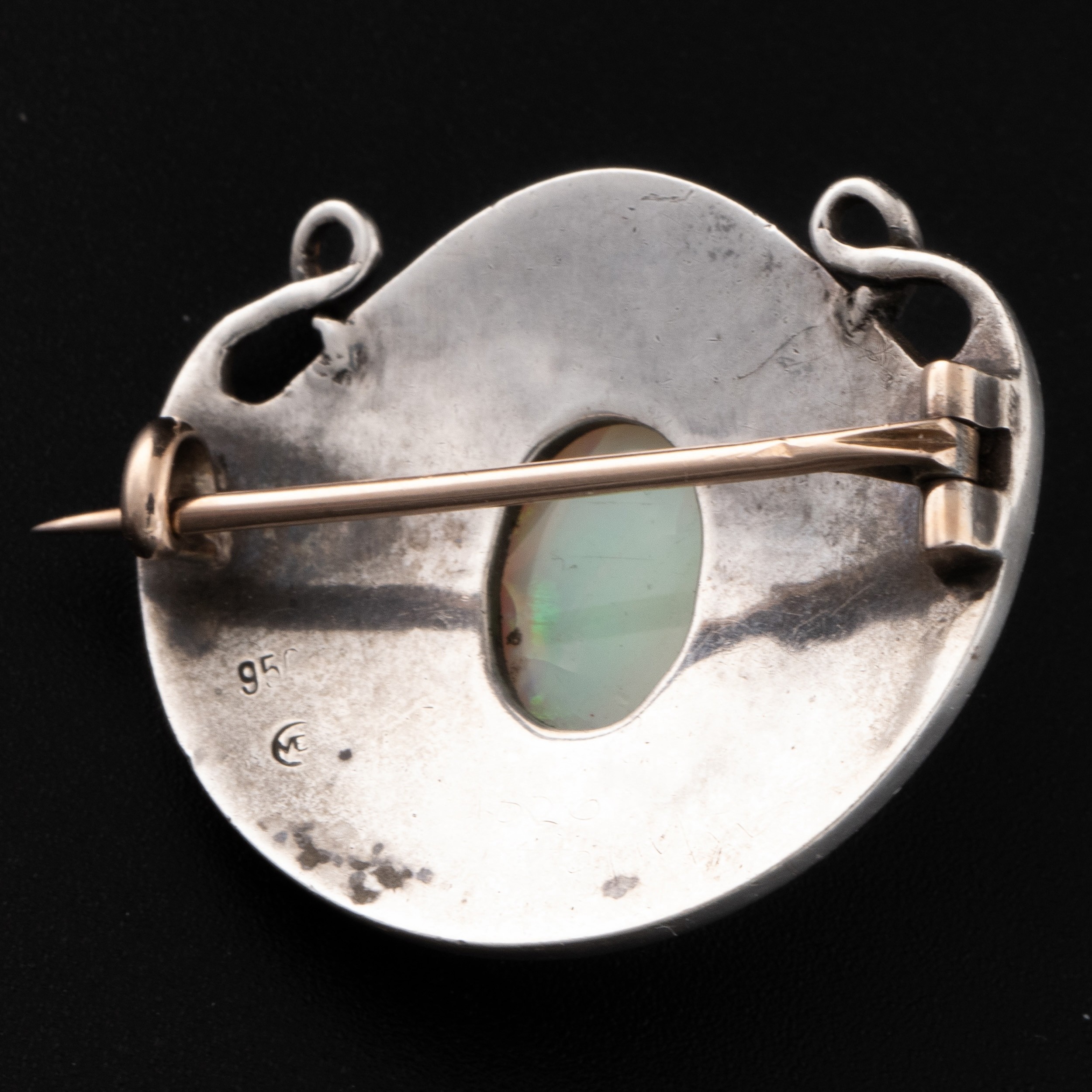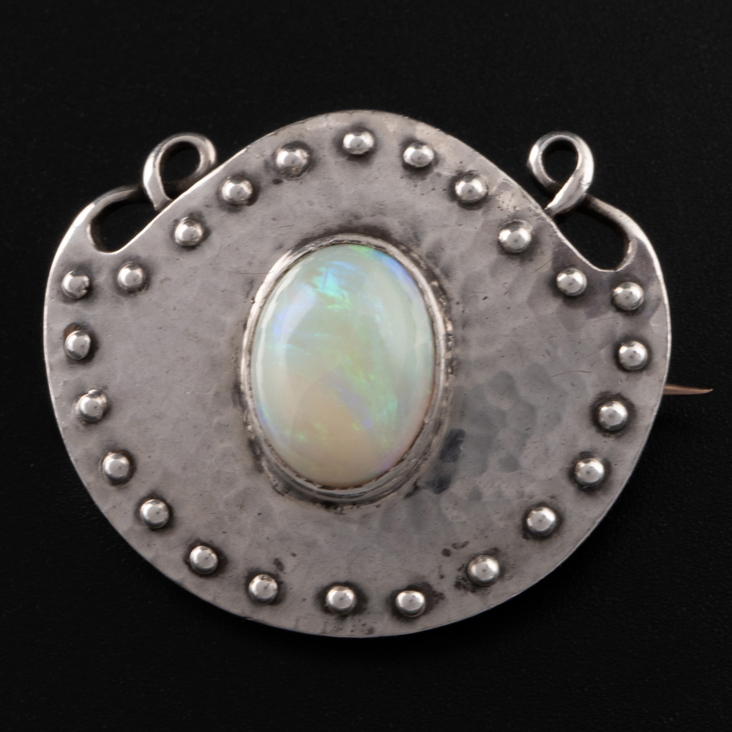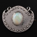 A Murrle Bennett Arts and Crafts silver and opal brooch, c.1900, shield-shaped brooch decorated with studded detail and wirework, opal cabochon with good green and blue colouration, with maker's mark 'M.B. CO' and '950' denoting that this is a higher grade of silver than 925 sterling, 2.8cm width, 2.4cm depth, 7.7g weight. (LDC14431)