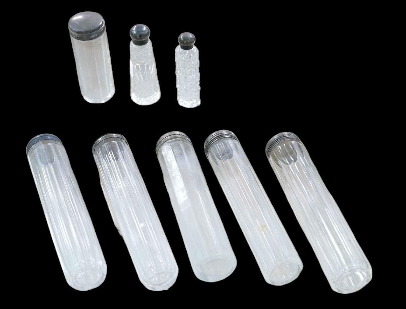 Eight silver topped scent bottles, largest, 3.3 by 17.5cm long 1.6toz weighable silver. (8)