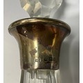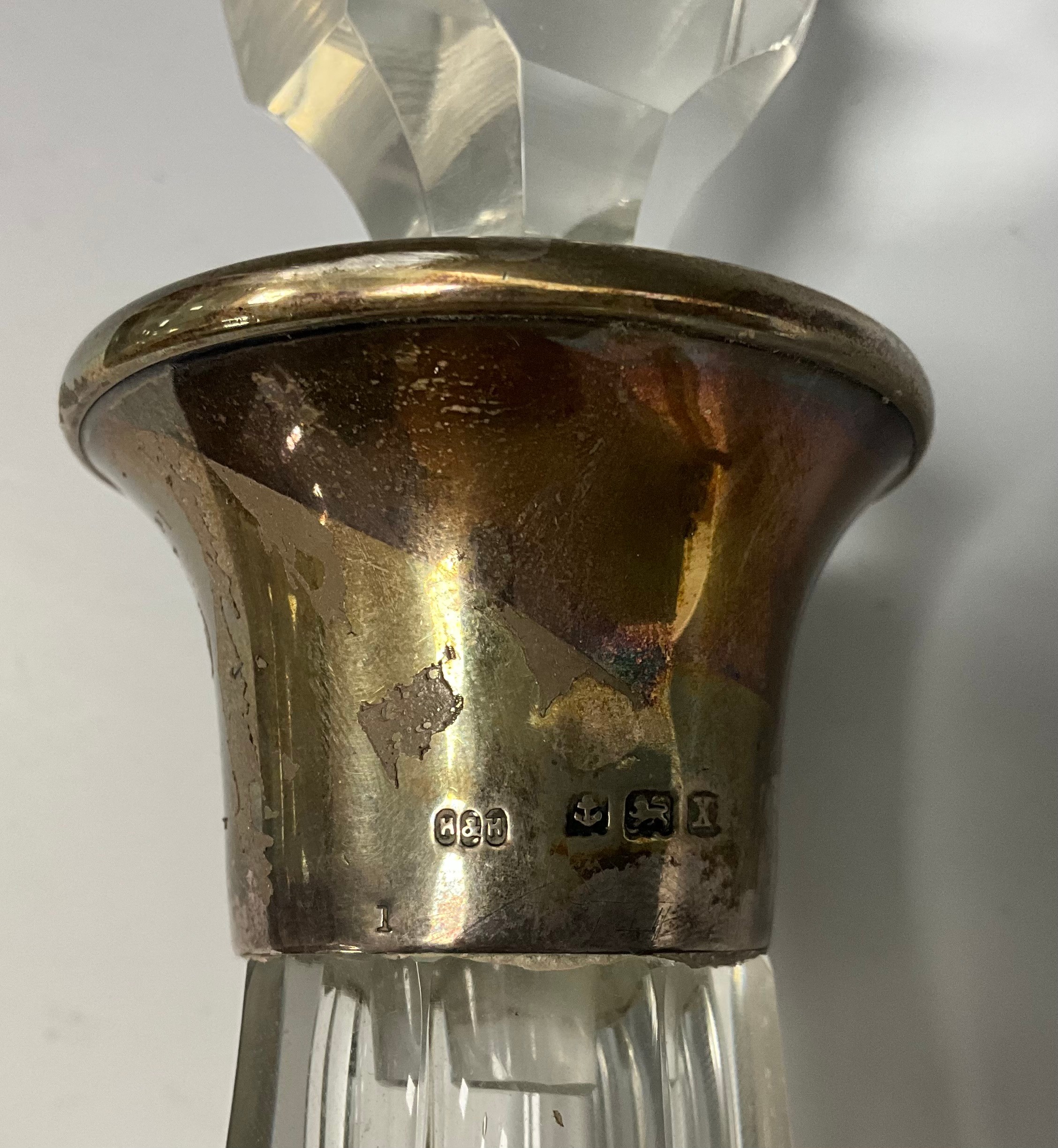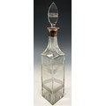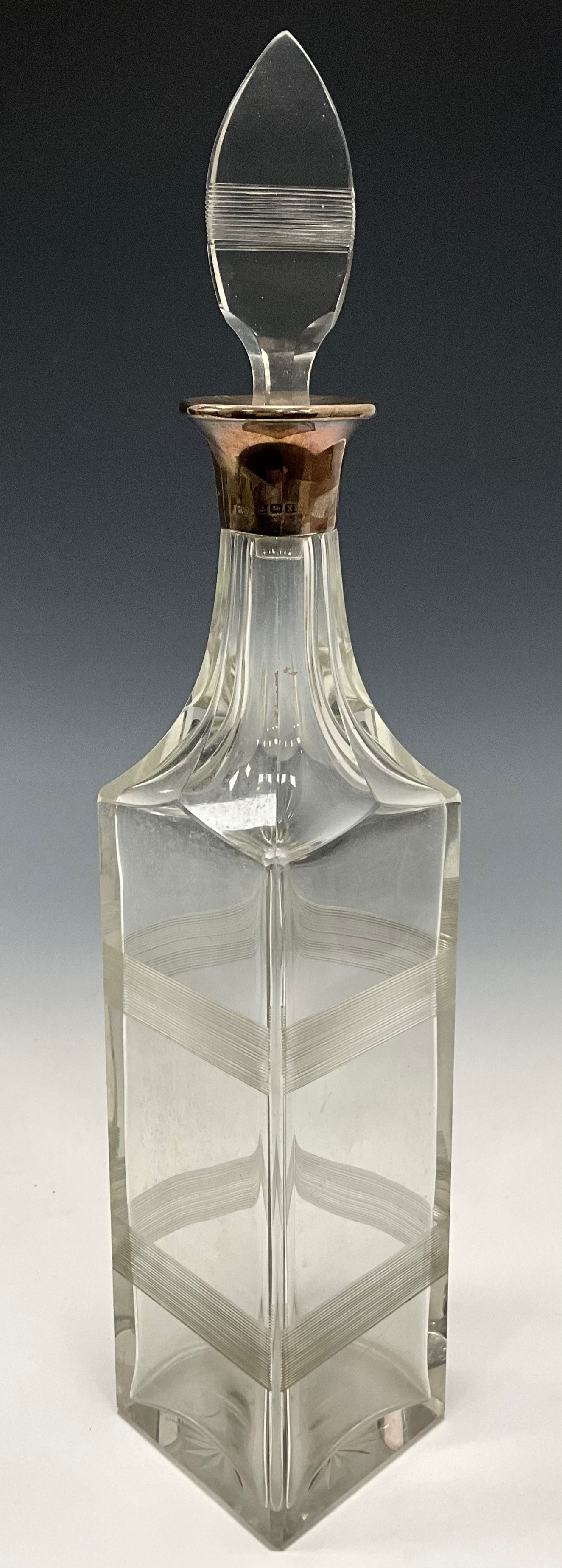 An Art Deco silver mounted cut glass decanter, the square body line divided with faceted neck and silver collar, 38.5cm high, Hukin & Heath Ltd, Birmingham 1922.