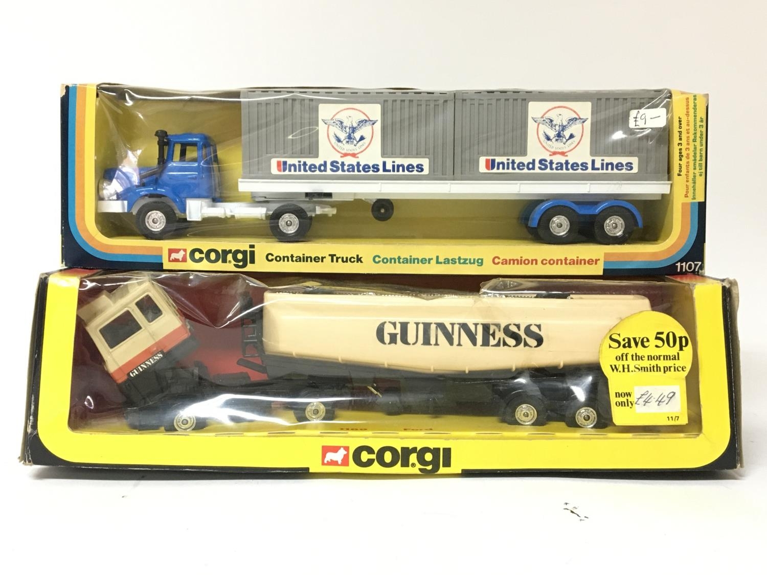 Corgi toys, #1107 Container truck and #1169 Ford Guinness tanker, boxed
