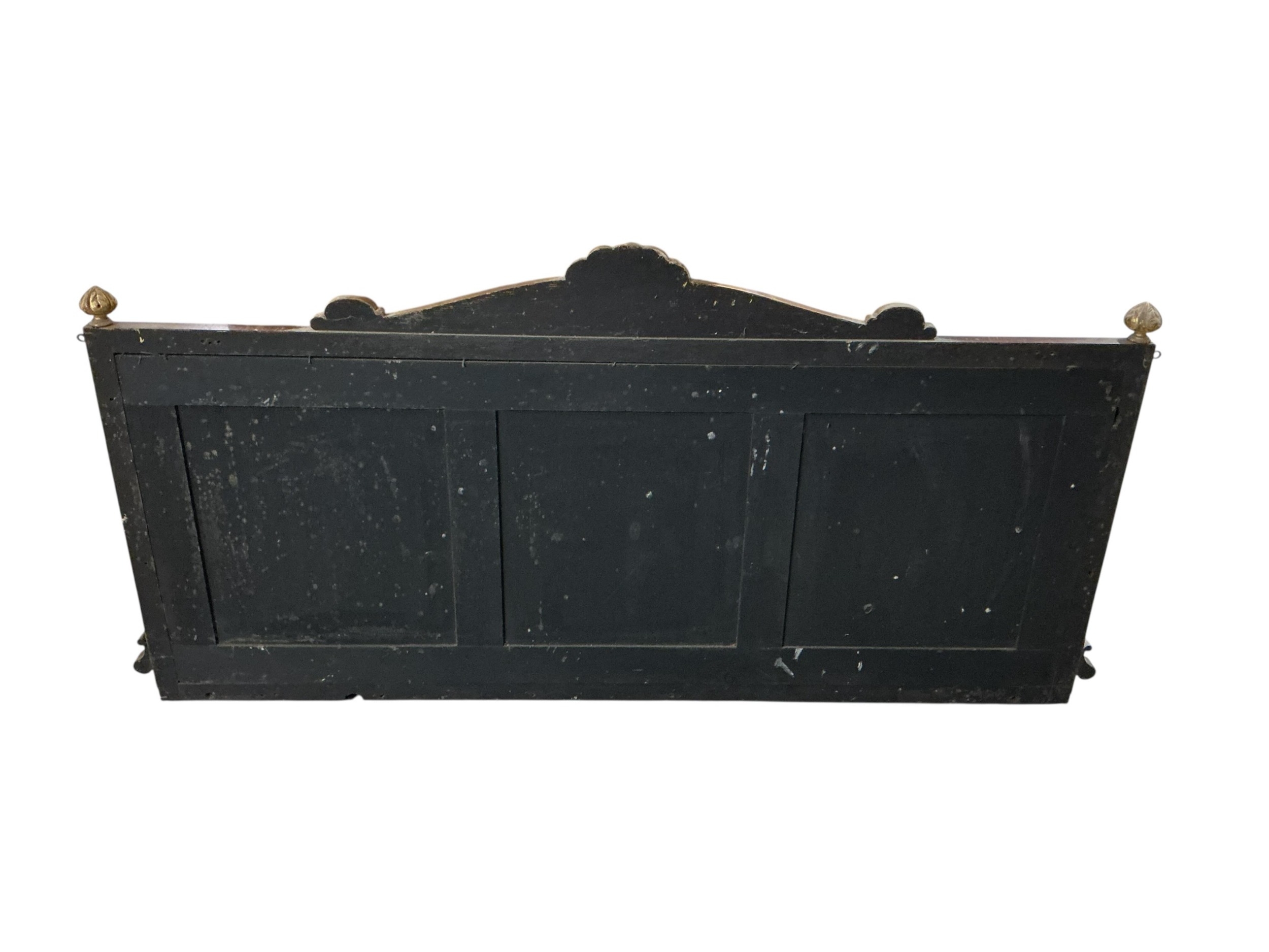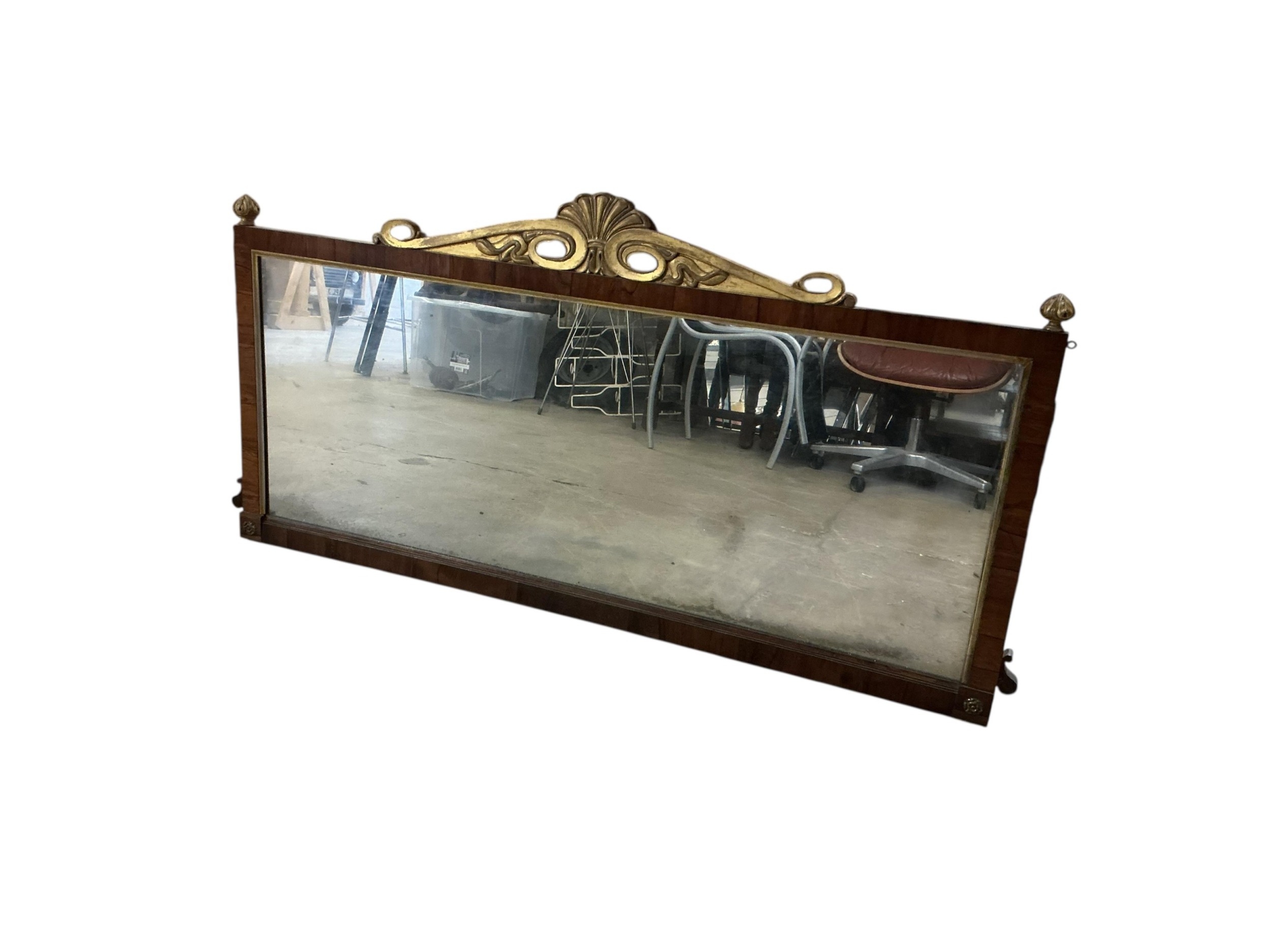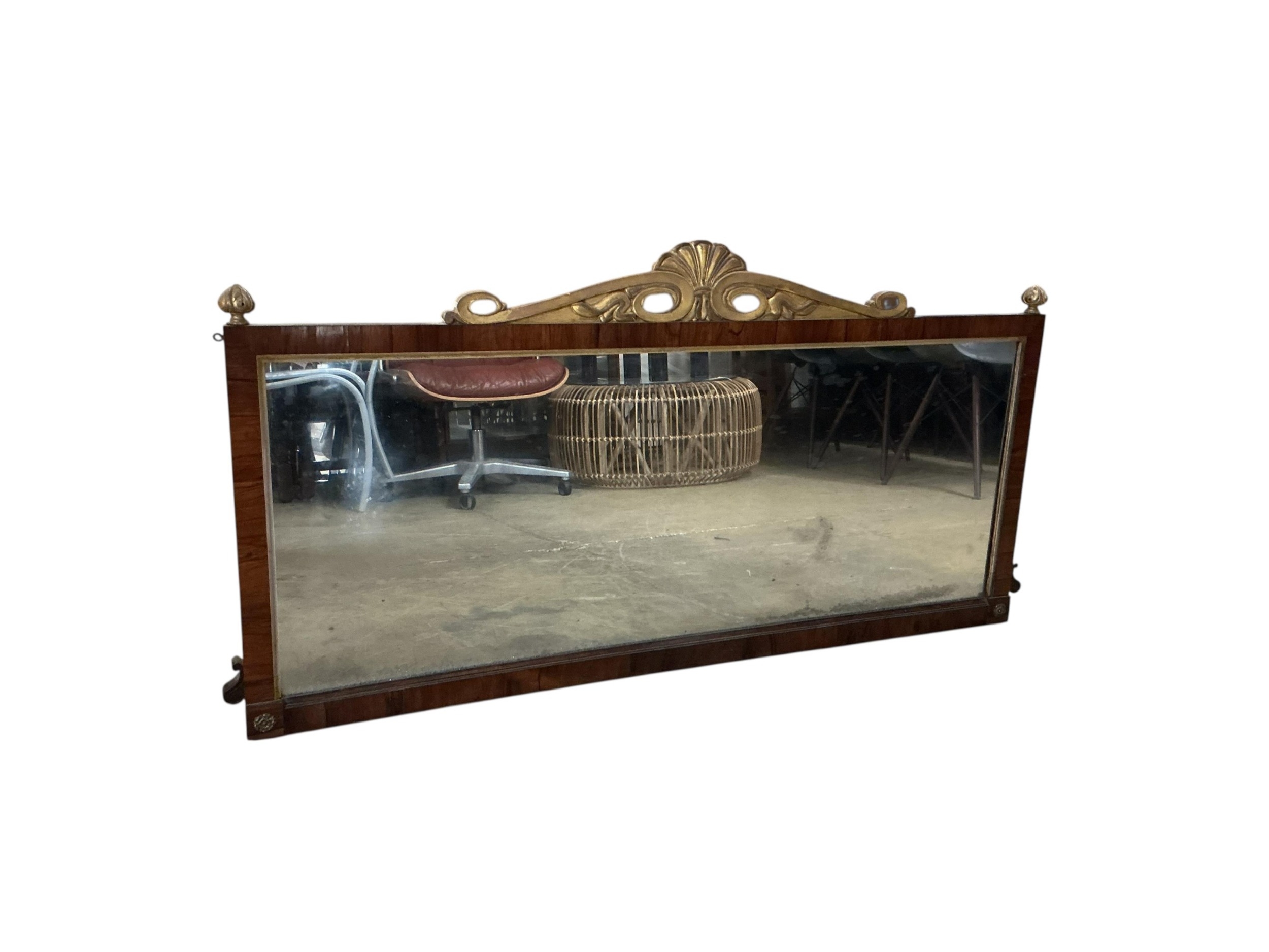 A Regency style rosewood and parcel gilt overmantel mirror, width 137cm, height 67cm