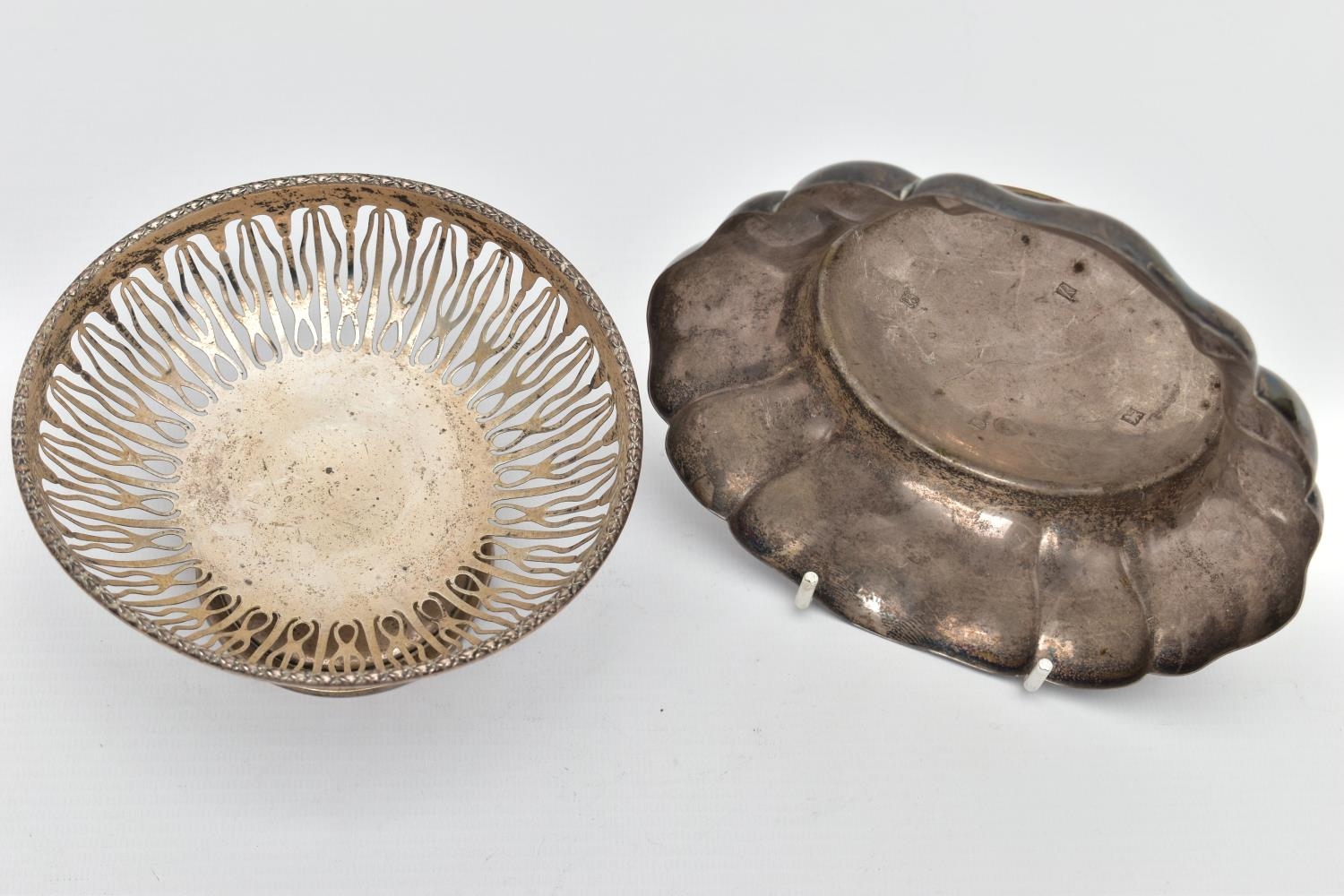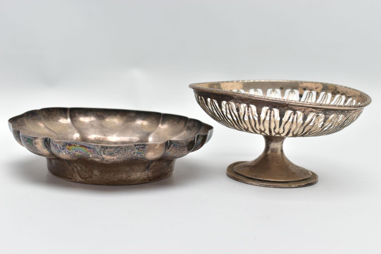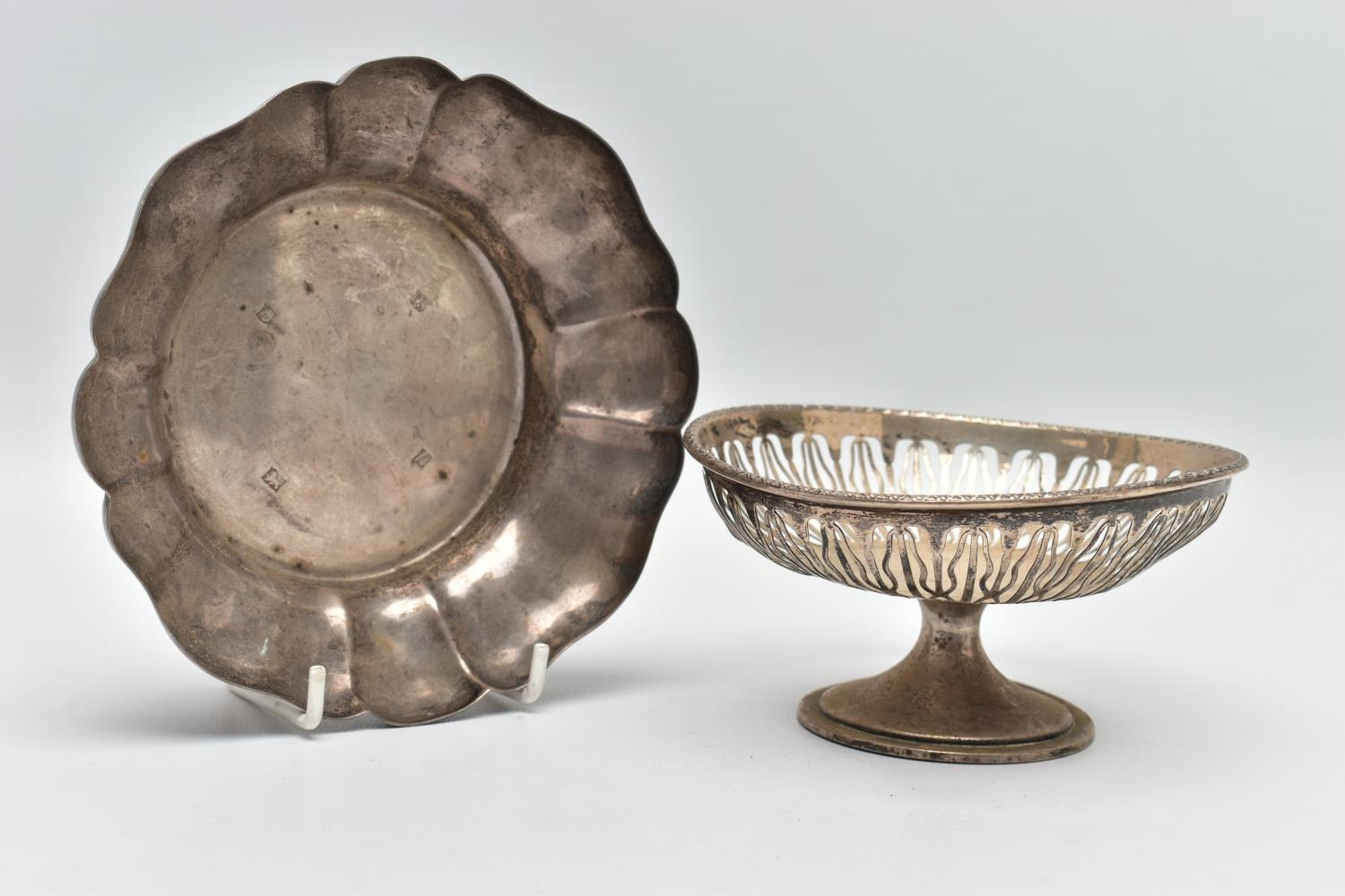 AN ELIZABETH II SILVER DISH OF WAVY OUTLINE AND A GEORGE V PIERCED SILVER PEDESTAL DISH, the wavy dish with large hallmarks to the interior base, makers Barker Ellis Silver Co, Birmingham 1966, 5.57ozt, 173.2 grams, the pierced pedestal bowl with cast husk rim, circular foot, maker E S Barnsley & Co, Birmingham 1912, 3.36ozt, 104.4 grams (2) (Condition report: both pieces are heavily tarnished, the wavy bowl rocks slightly on a level surface, the pierced bowl is bent out of shape)