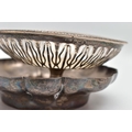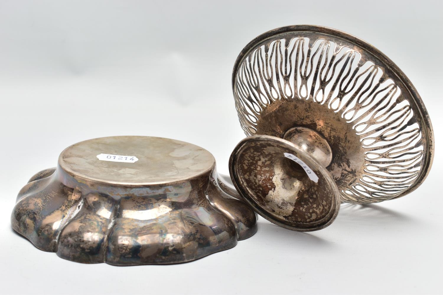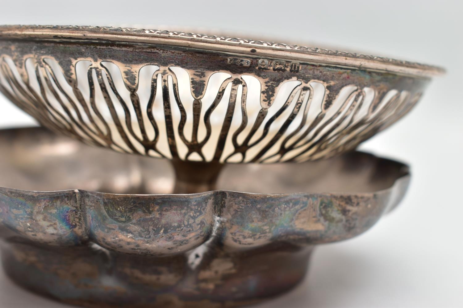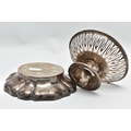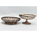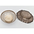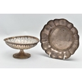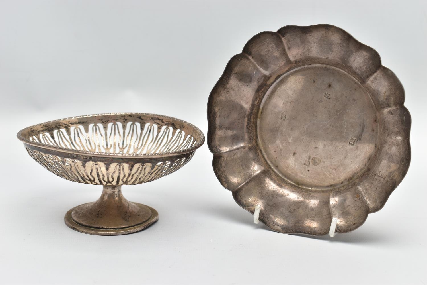 AN ELIZABETH II SILVER DISH OF WAVY OUTLINE AND A GEORGE V PIERCED SILVER PEDESTAL DISH, the wavy dish with large hallmarks to the interior base, makers Barker Ellis Silver Co, Birmingham 1966, 5.57ozt, 173.2 grams, the pierced pedestal bowl with cast husk rim, circular foot, maker E S Barnsley & Co, Birmingham 1912, 3.36ozt, 104.4 grams (2) (Condition report: both pieces are heavily tarnished, the wavy bowl rocks slightly on a level surface, the pierced bowl is bent out of shape)