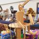 WOODEN JOINTED FIGURE ON SMALL CIRCULAR SLATTED PINE TABLE