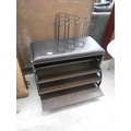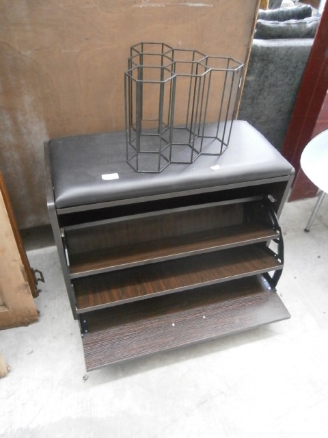 A padded storage box seat and a wire wine rack