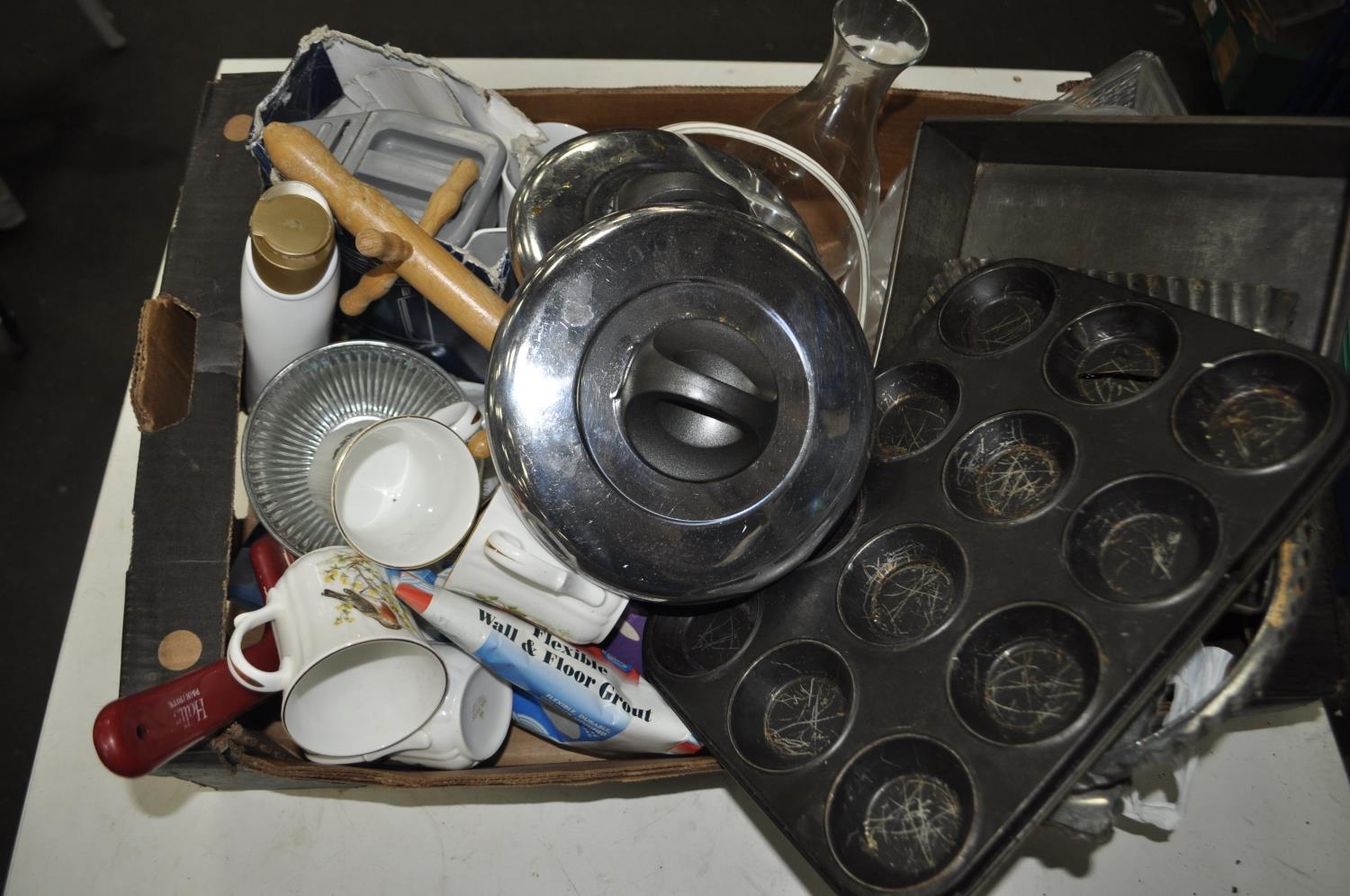 MIXED BOX OF KITCHENALIA AND CHINA MUGS