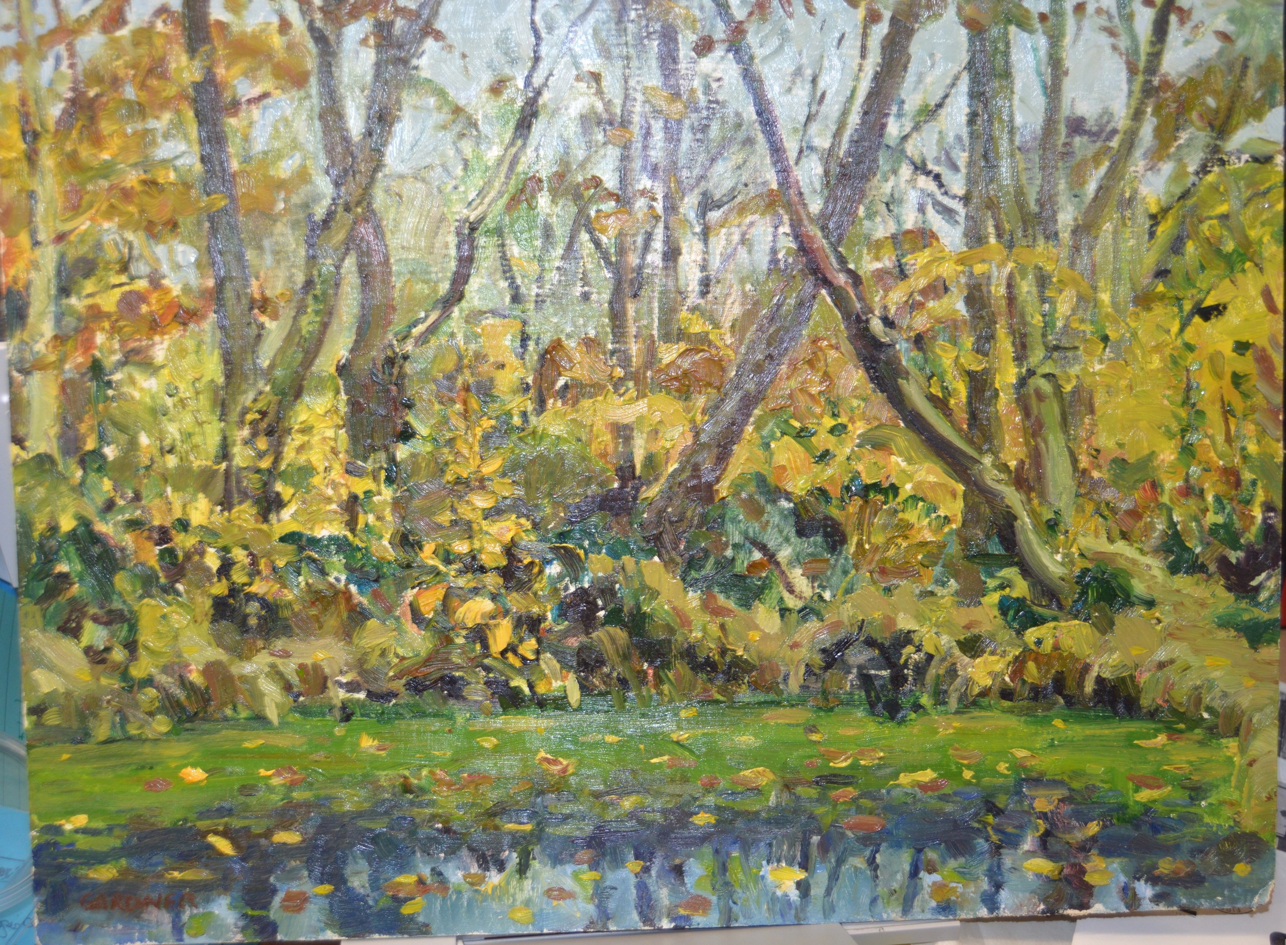 Unframed Oil Painting by the Late Keith Gardner RCA (1930-2025) 16"x12" Edge of Pond Arrowe Park Wirral