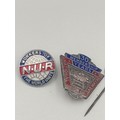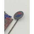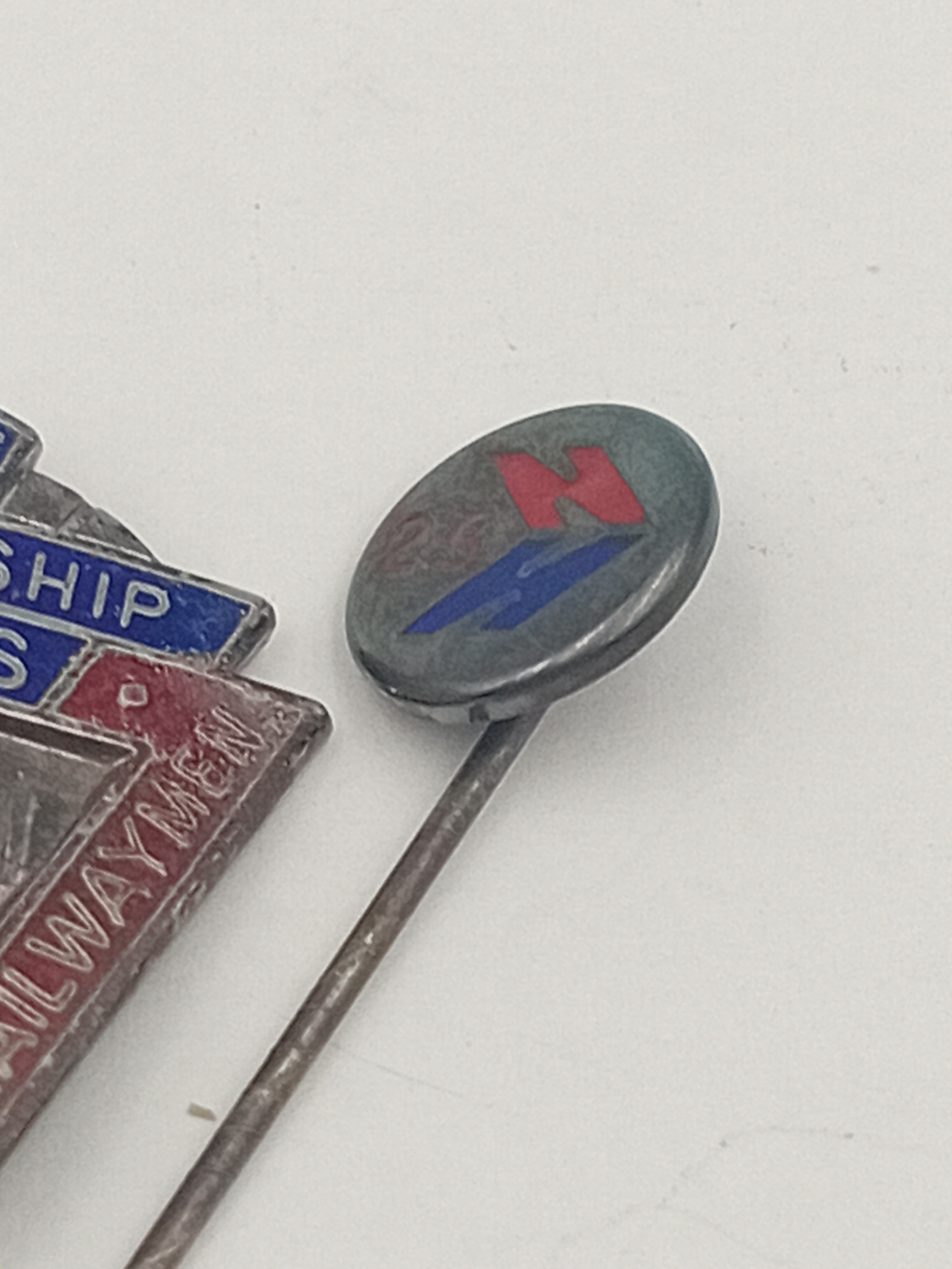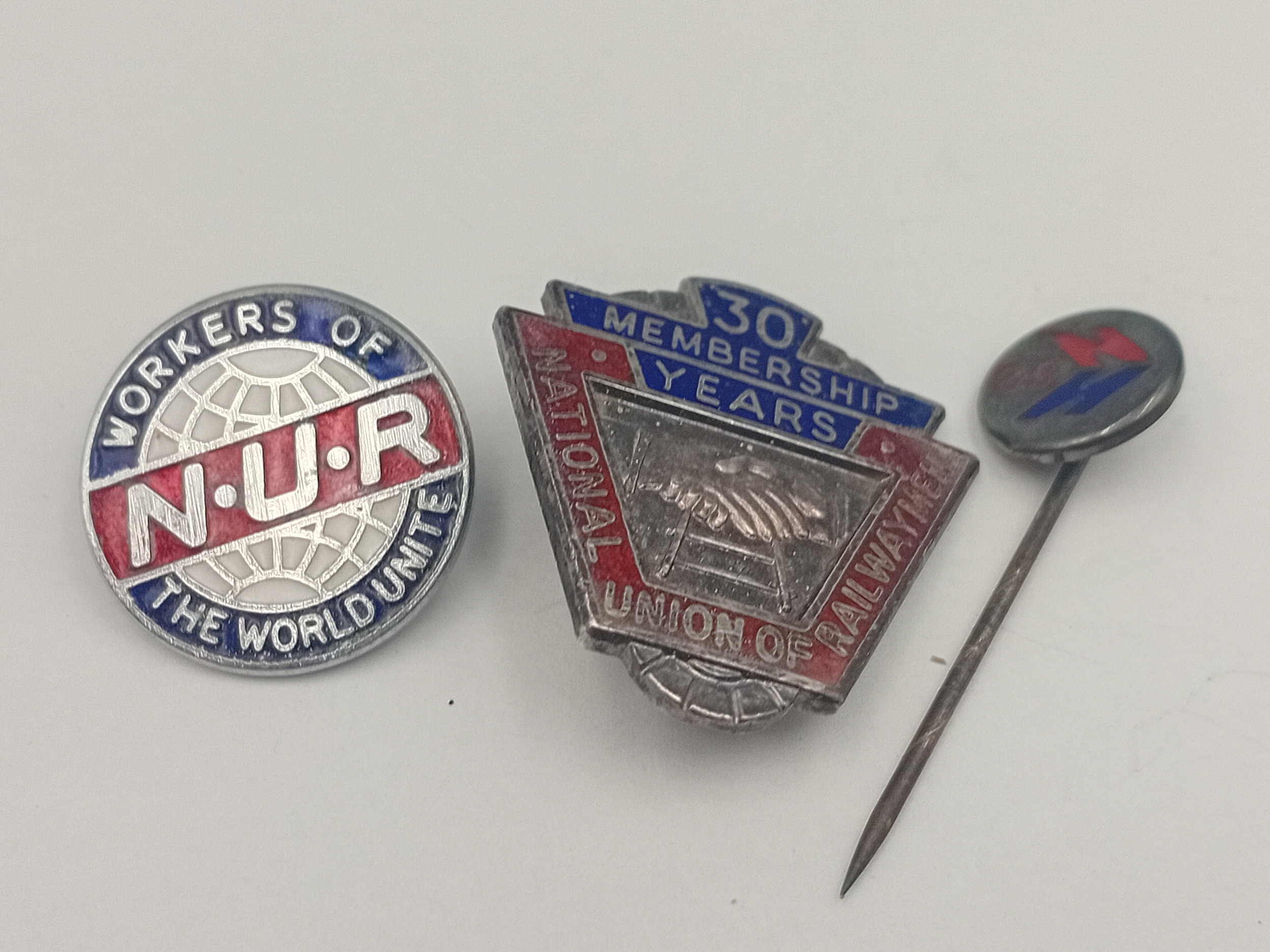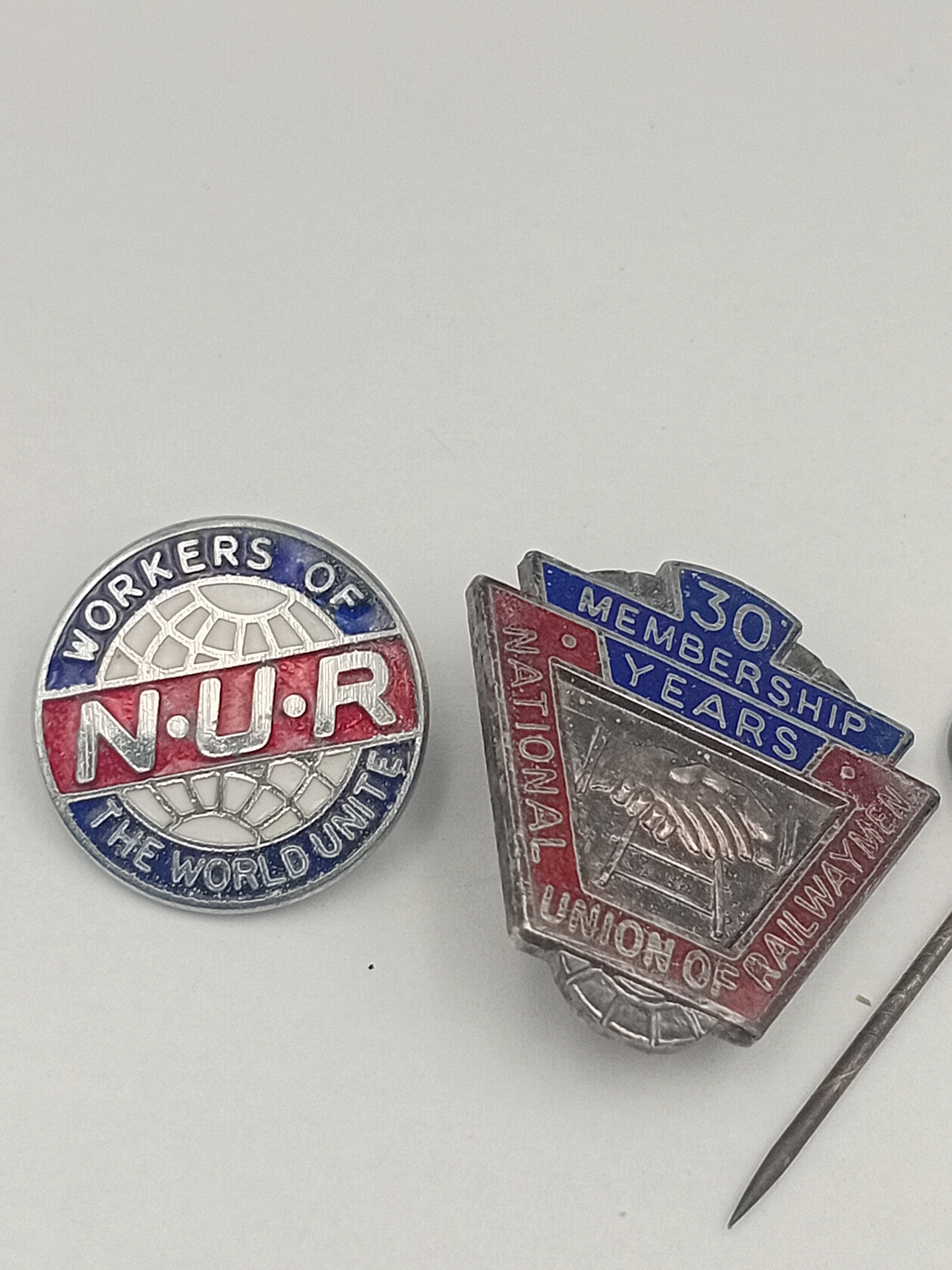 Three vintage railway related enamelled pin badges. 2 are hallmarked silver. 30 years membership national union of railwaymen, workers of the world unite N.U.R and 25 years national express service.