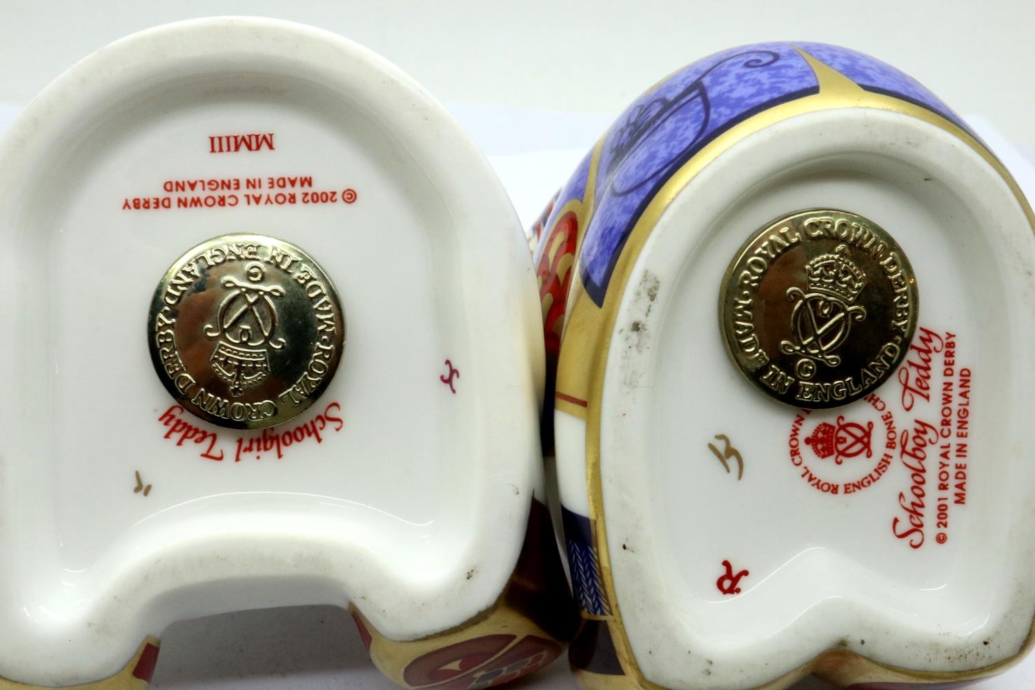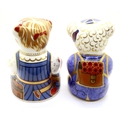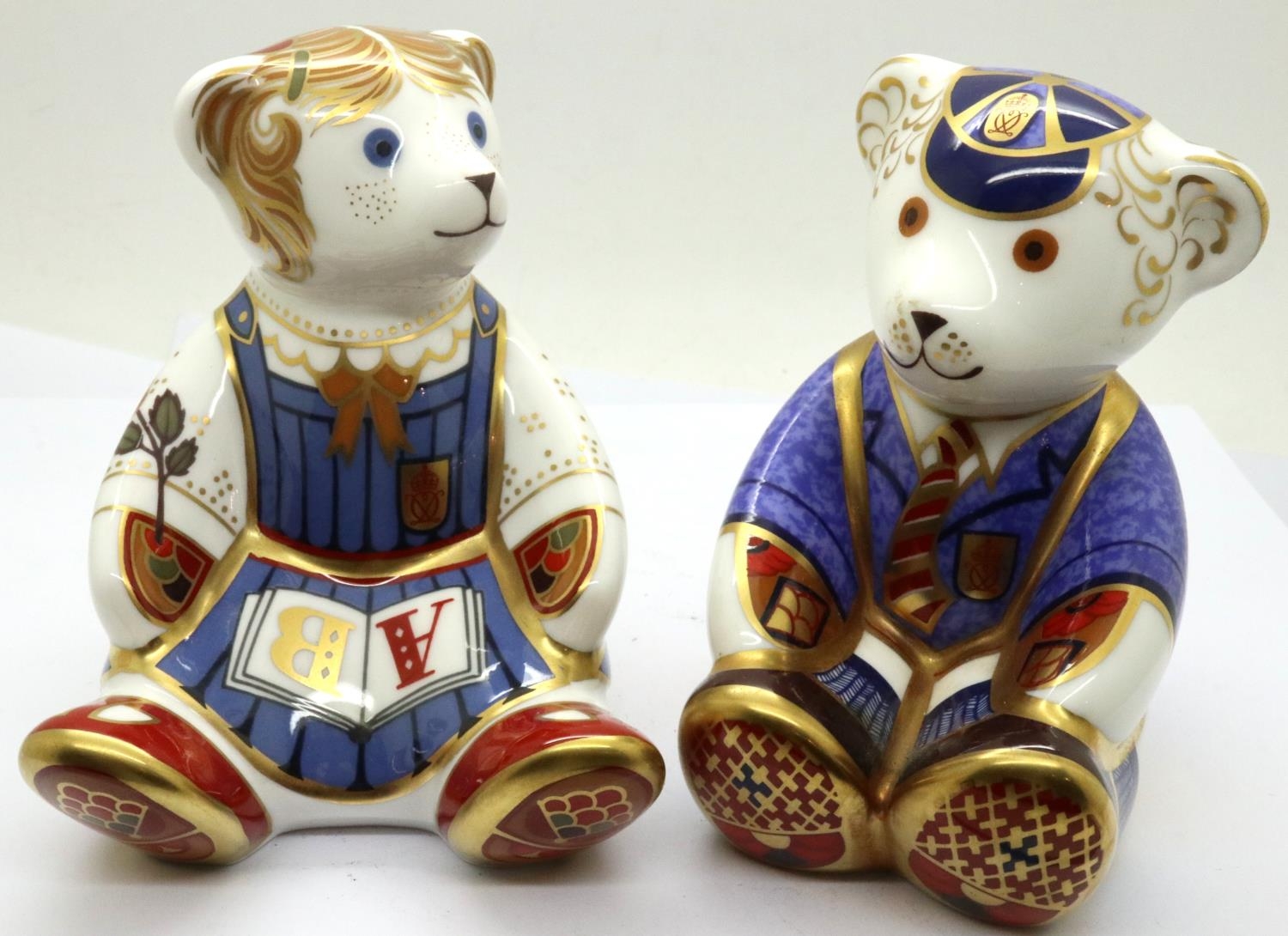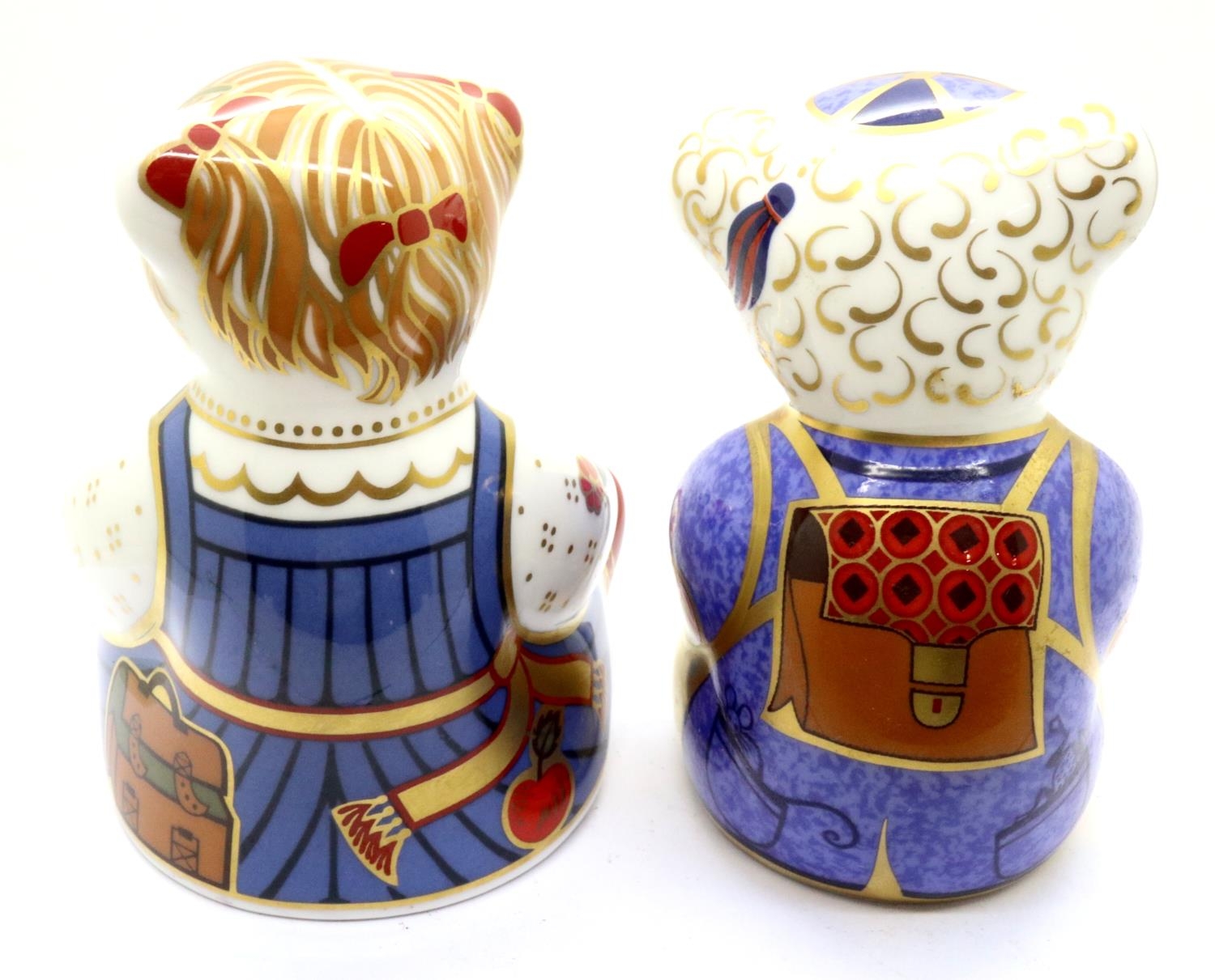 Royal Crown Derby schoolboy teddy and schoolgirl teddy, both with gold stoppers, each H: 90 mm. No cracks, chips or visible restoration. P&P Group 1 (£14+VAT for the first lot and £1+VAT for subsequent lots)