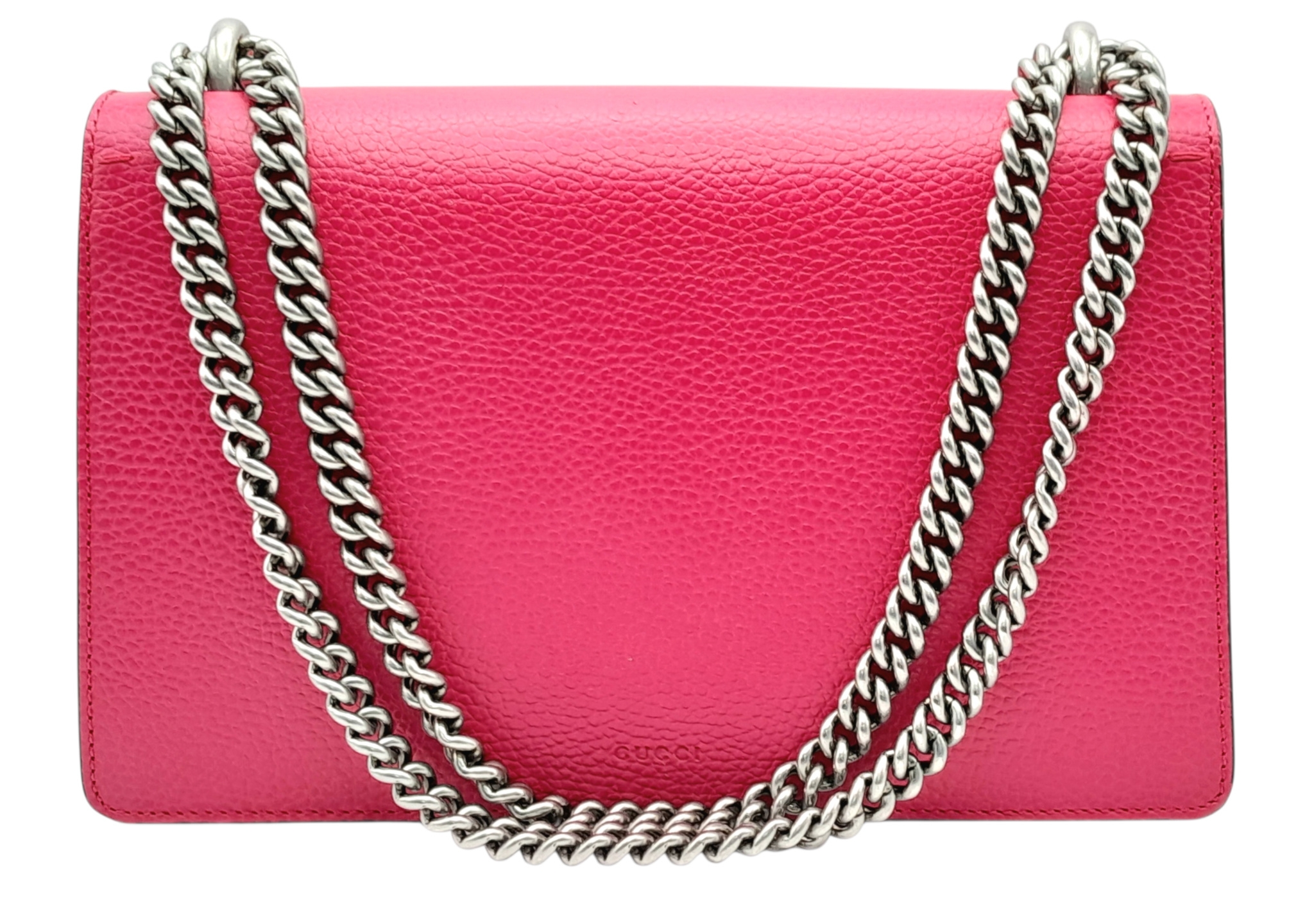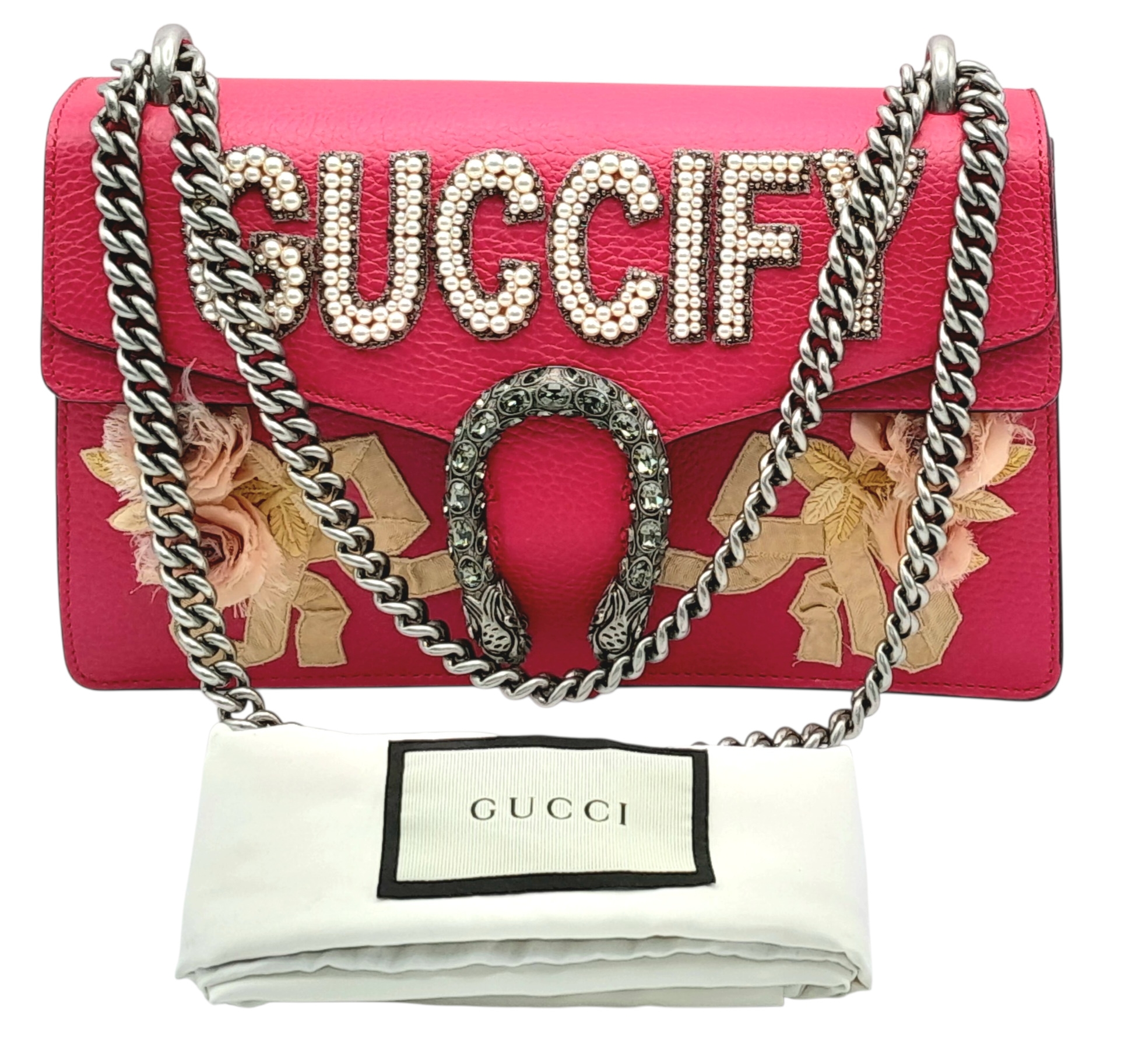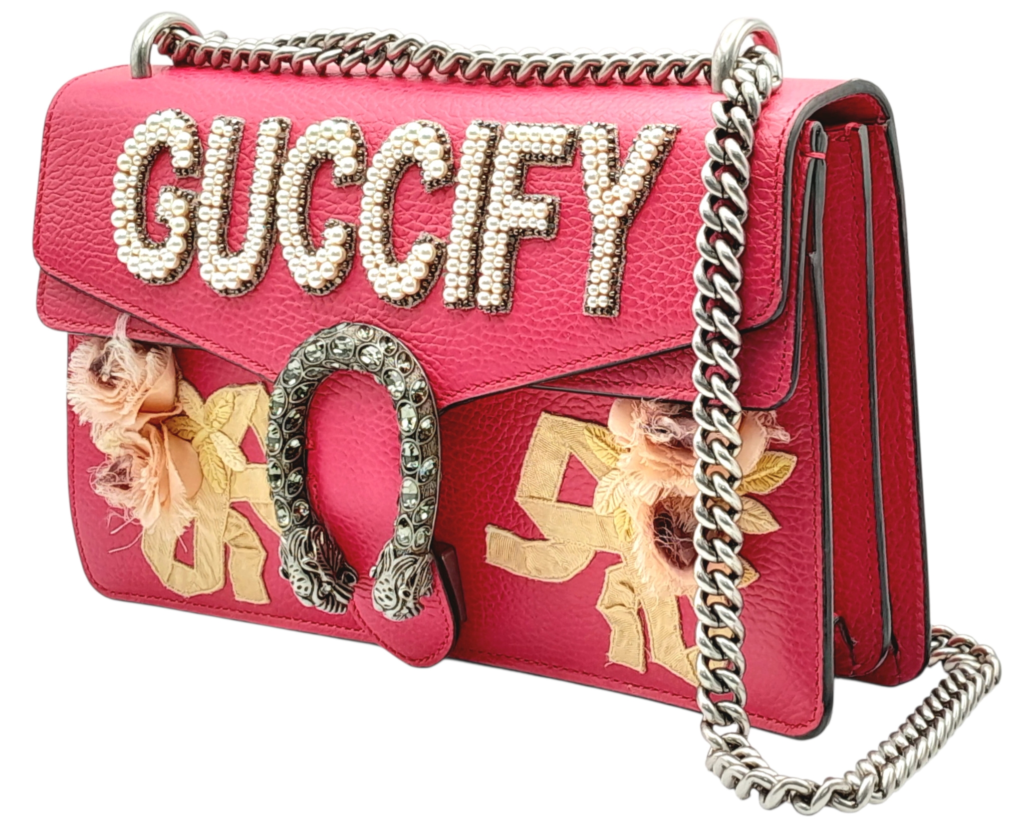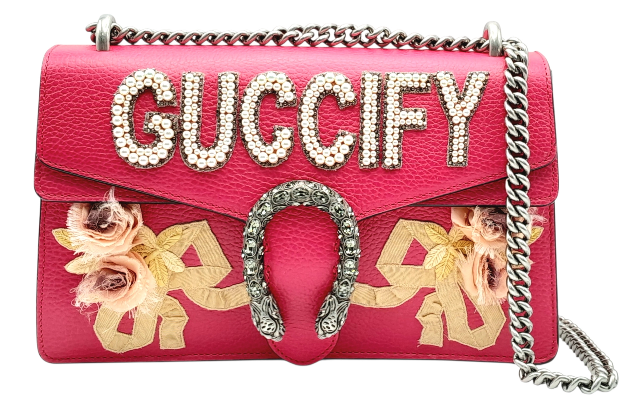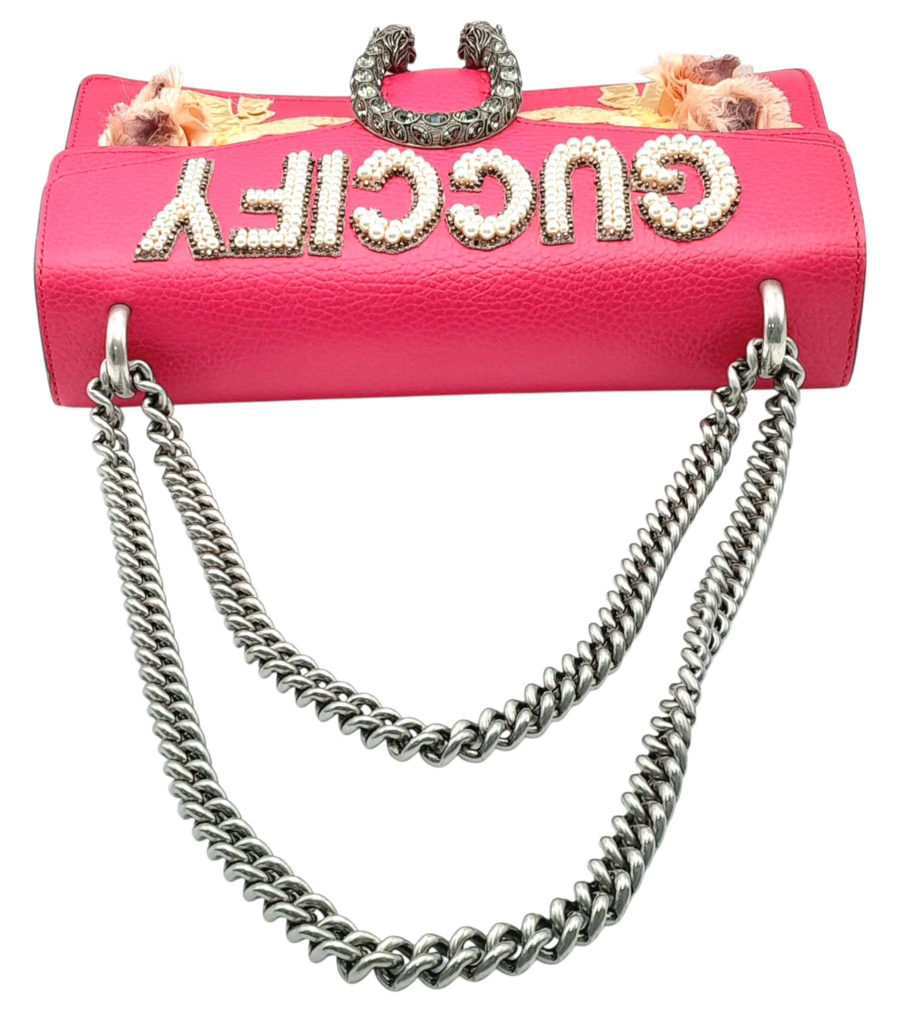 A Gucci Dionysus Embellished Leather Shoulder Bag. Crafted in vibrant pink textured leather, featuring the iconic Dionysus tiger head closure in antiqued silver-tone hardware. The flap is adorned with “GUCCIFY” pearl embellishment lettering and floral embroidery detailing, adding a distinctive and playful finish. Completed with a silver-tone chain shoulder strap for shoulder or crossbody wear. Flap closure opening to a structured interior with multiple compartments and a central zipped section for organisation. In good overall condition with light signs of use. Please see photos for details or request a condition report. Measurements: L28 X W19 cm. Come with dust bag. Ref: 11504