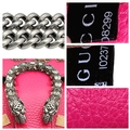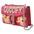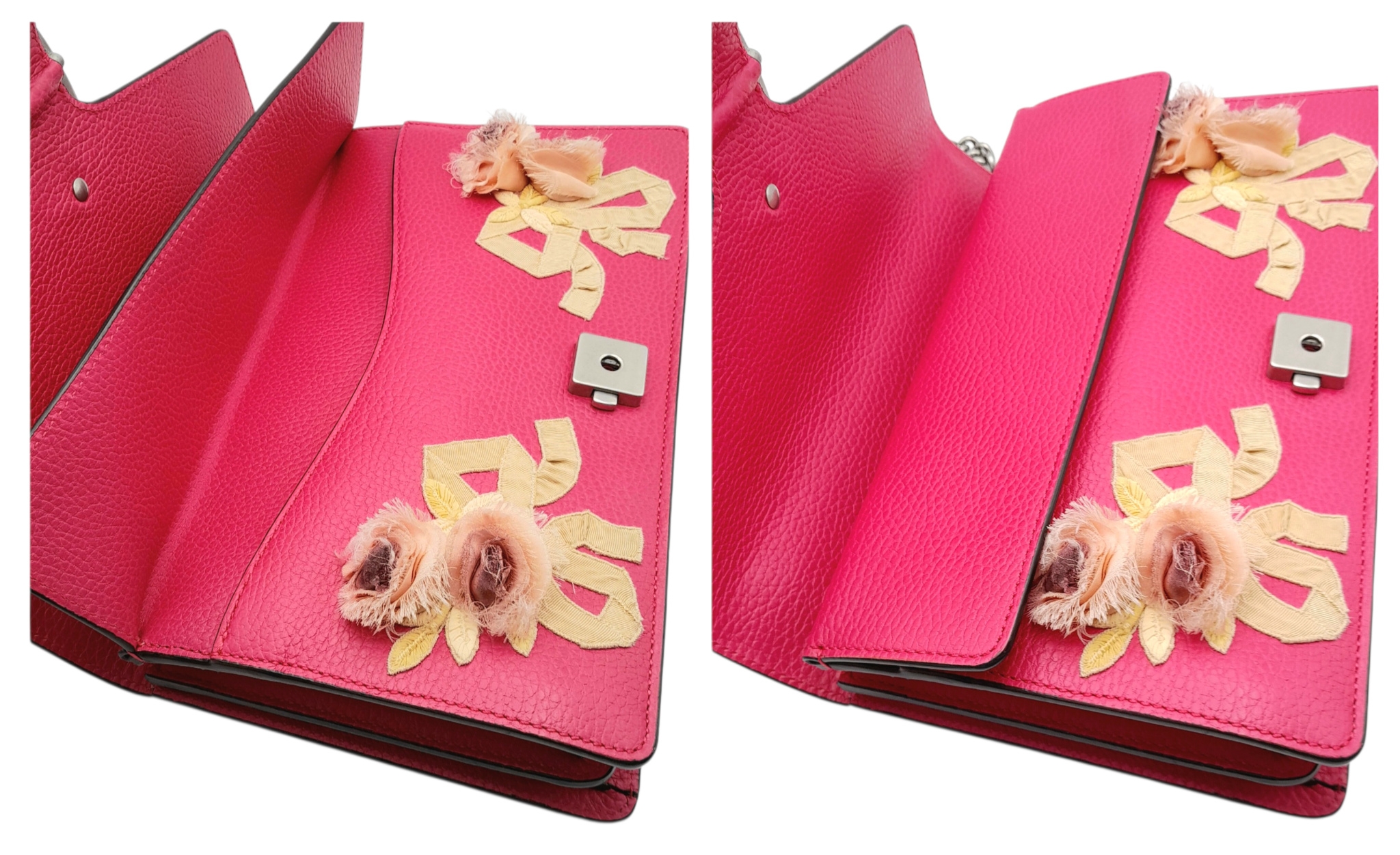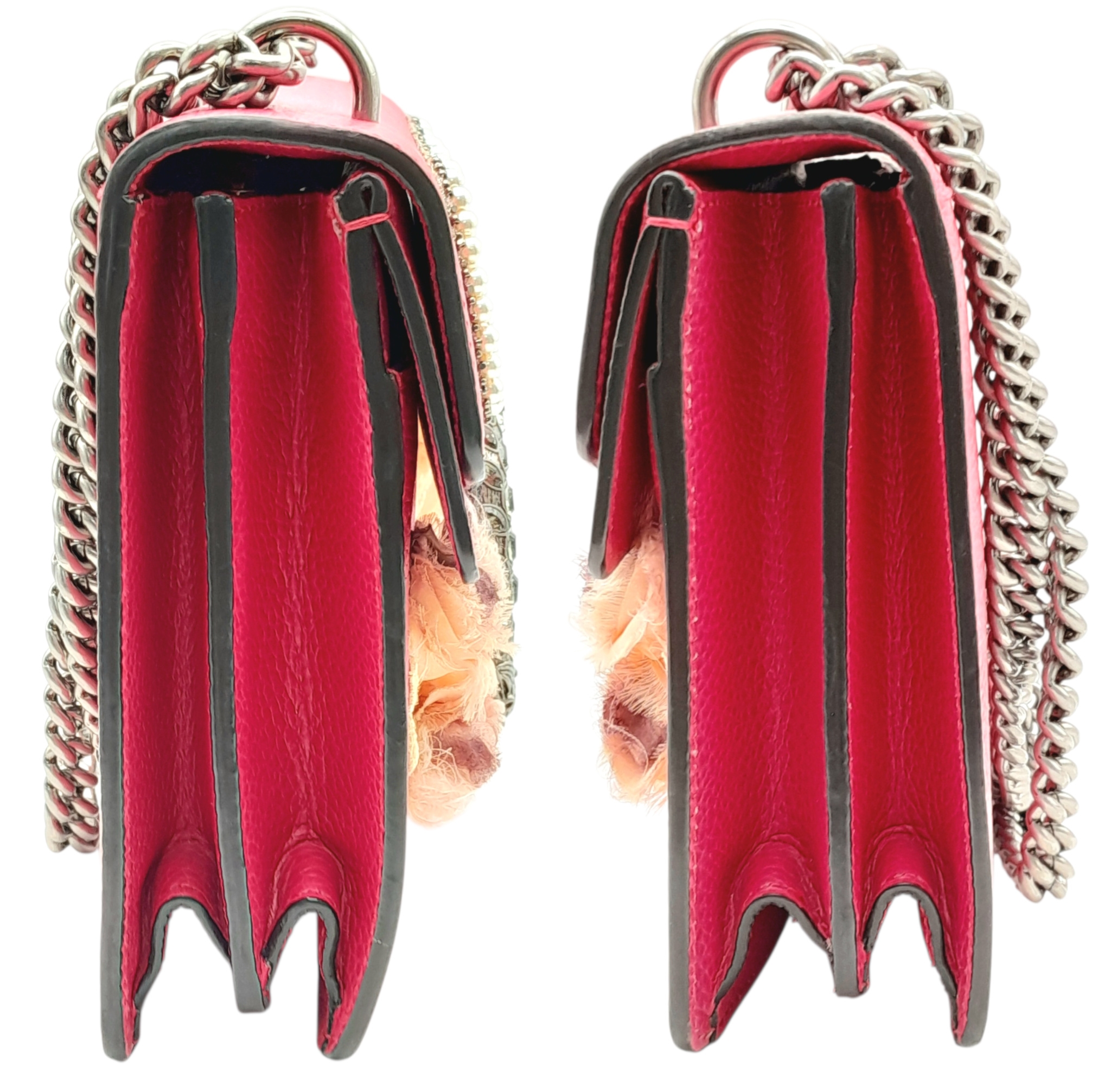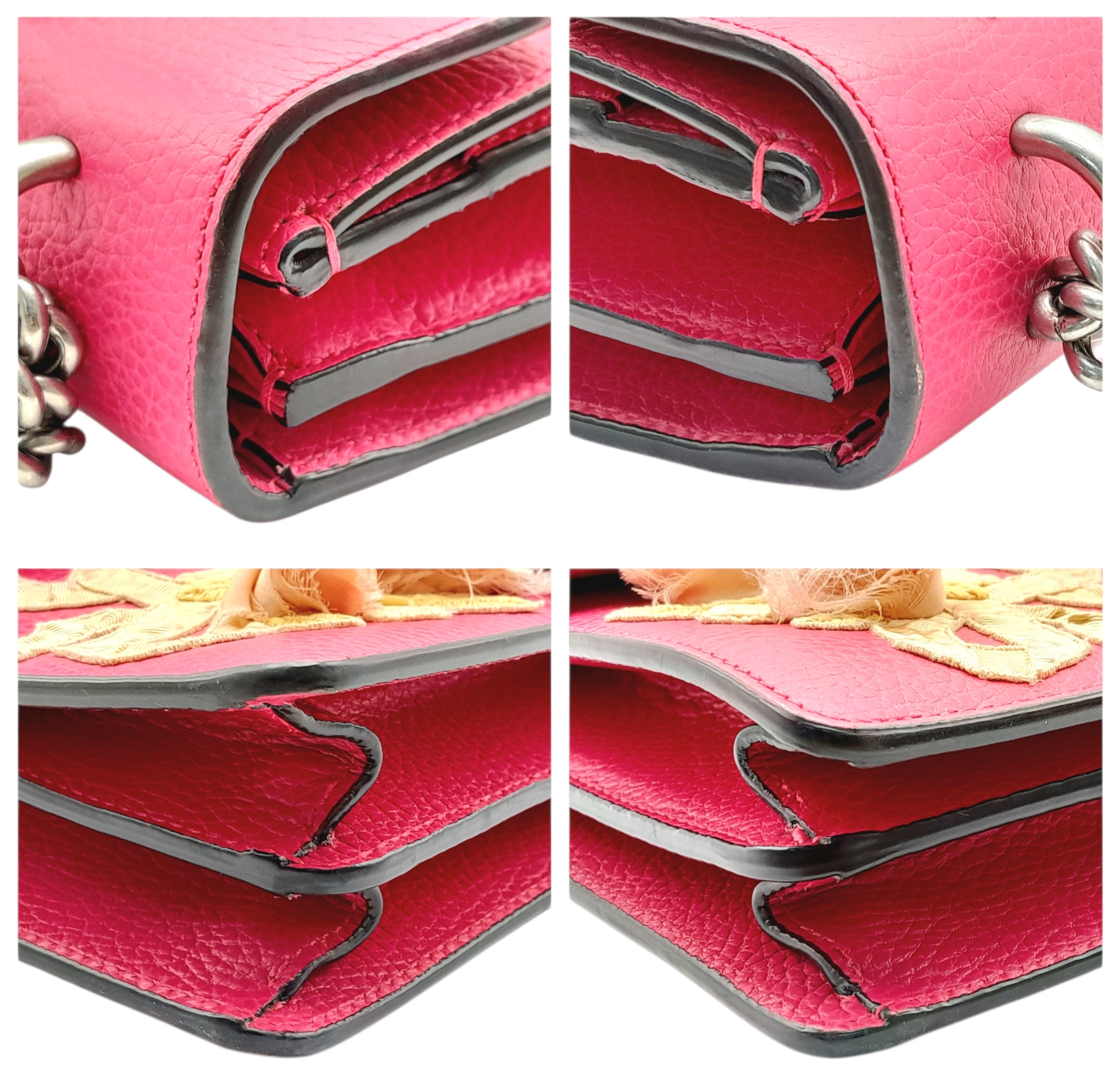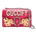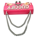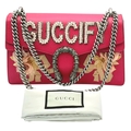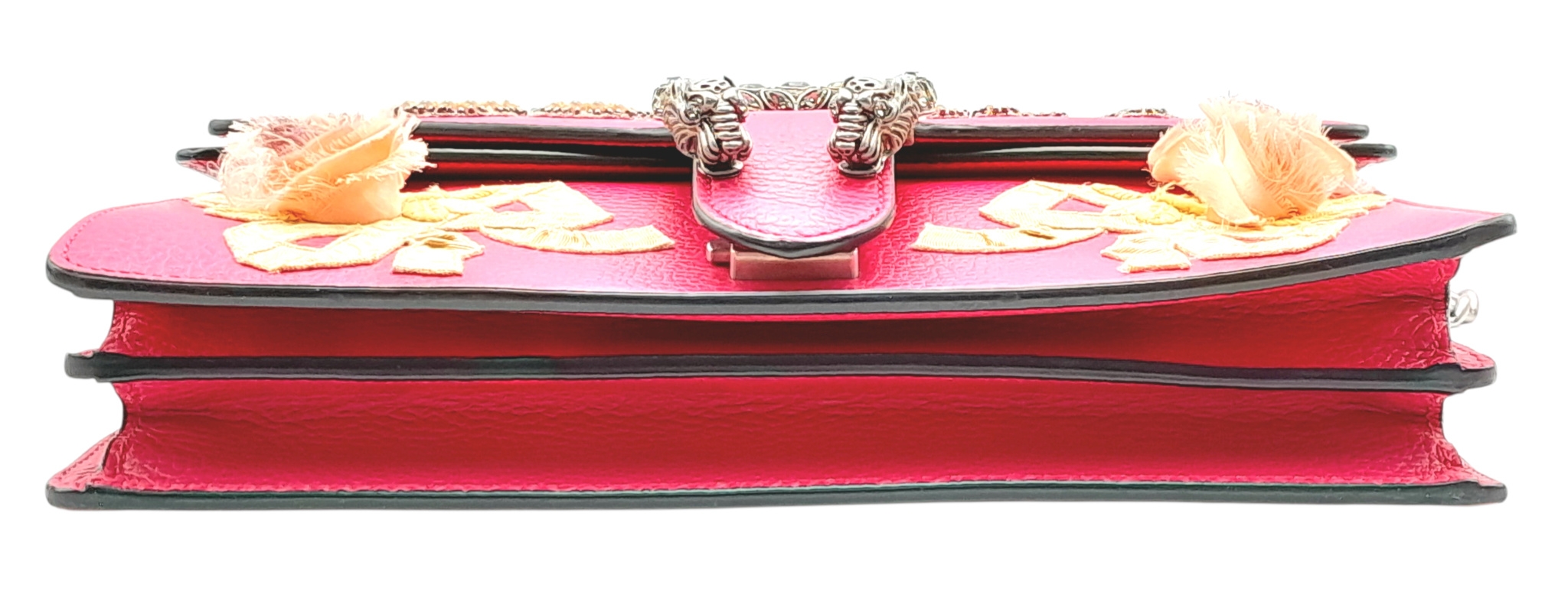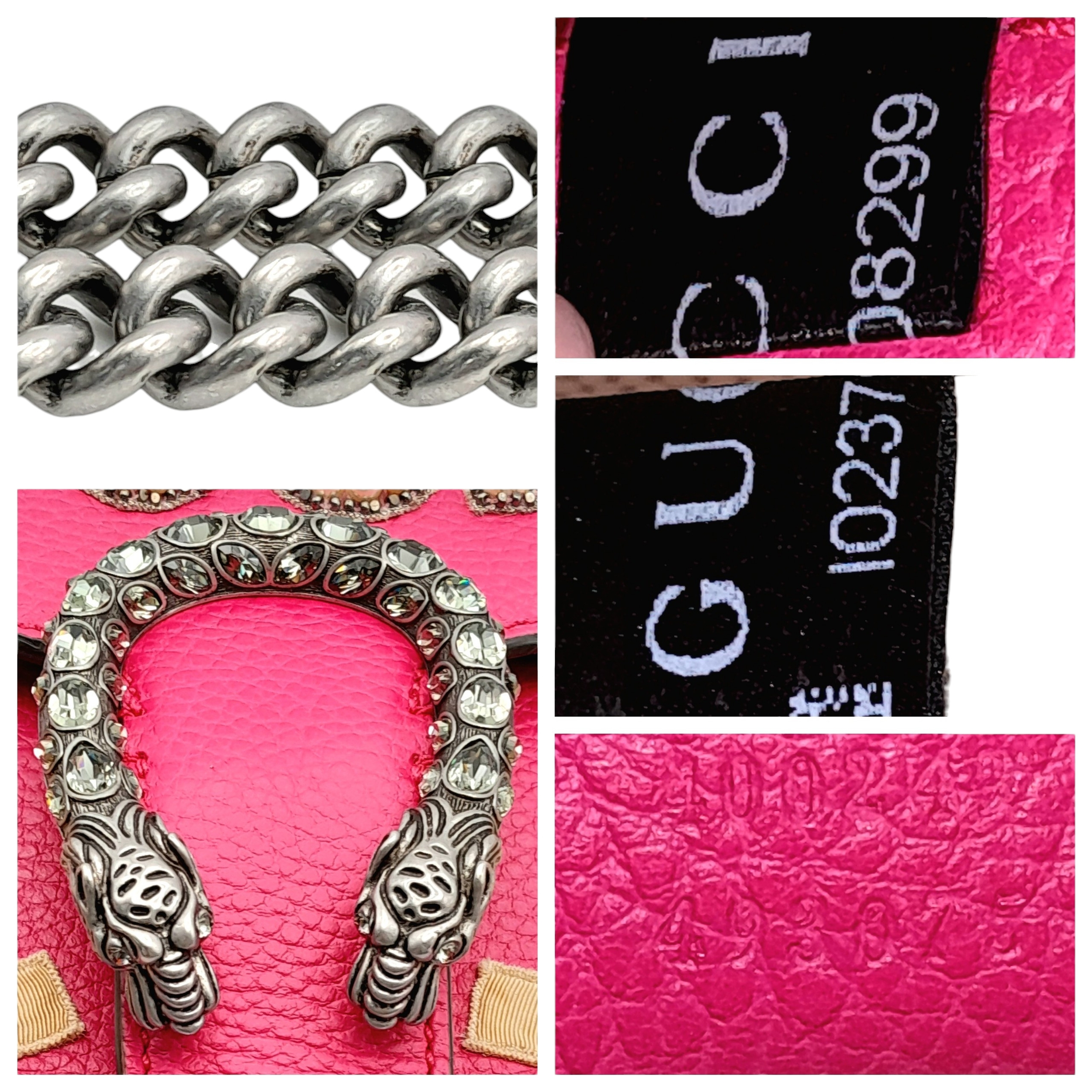 A Gucci Dionysus Embellished Leather Shoulder Bag. Crafted in vibrant pink textured leather, featuring the iconic Dionysus tiger head closure in antiqued silver-tone hardware. The flap is adorned with “GUCCIFY” pearl embellishment lettering and floral embroidery detailing, adding a distinctive and playful finish. Completed with a silver-tone chain shoulder strap for shoulder or crossbody wear. Flap closure opening to a structured interior with multiple compartments and a central zipped section for organisation. In good overall condition with light signs of use. Please see photos for details or request a condition report. Measurements: L28 X W19 cm. Come with dust bag. Ref: 11504