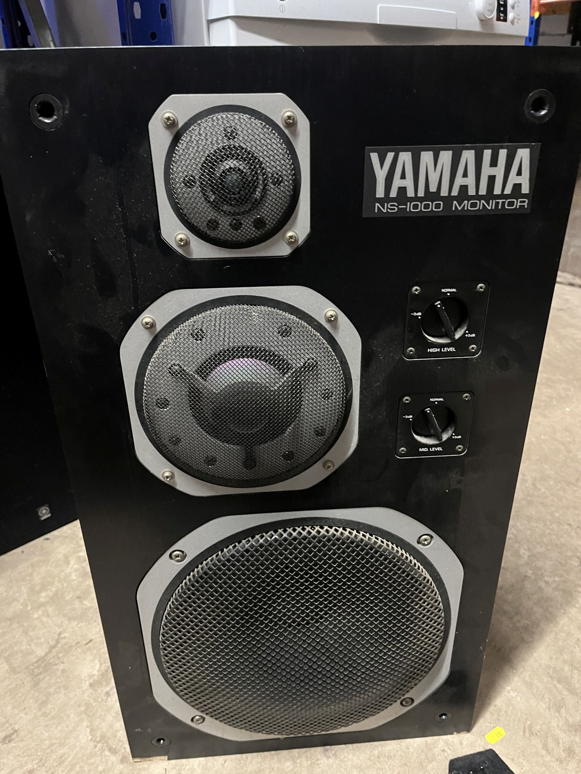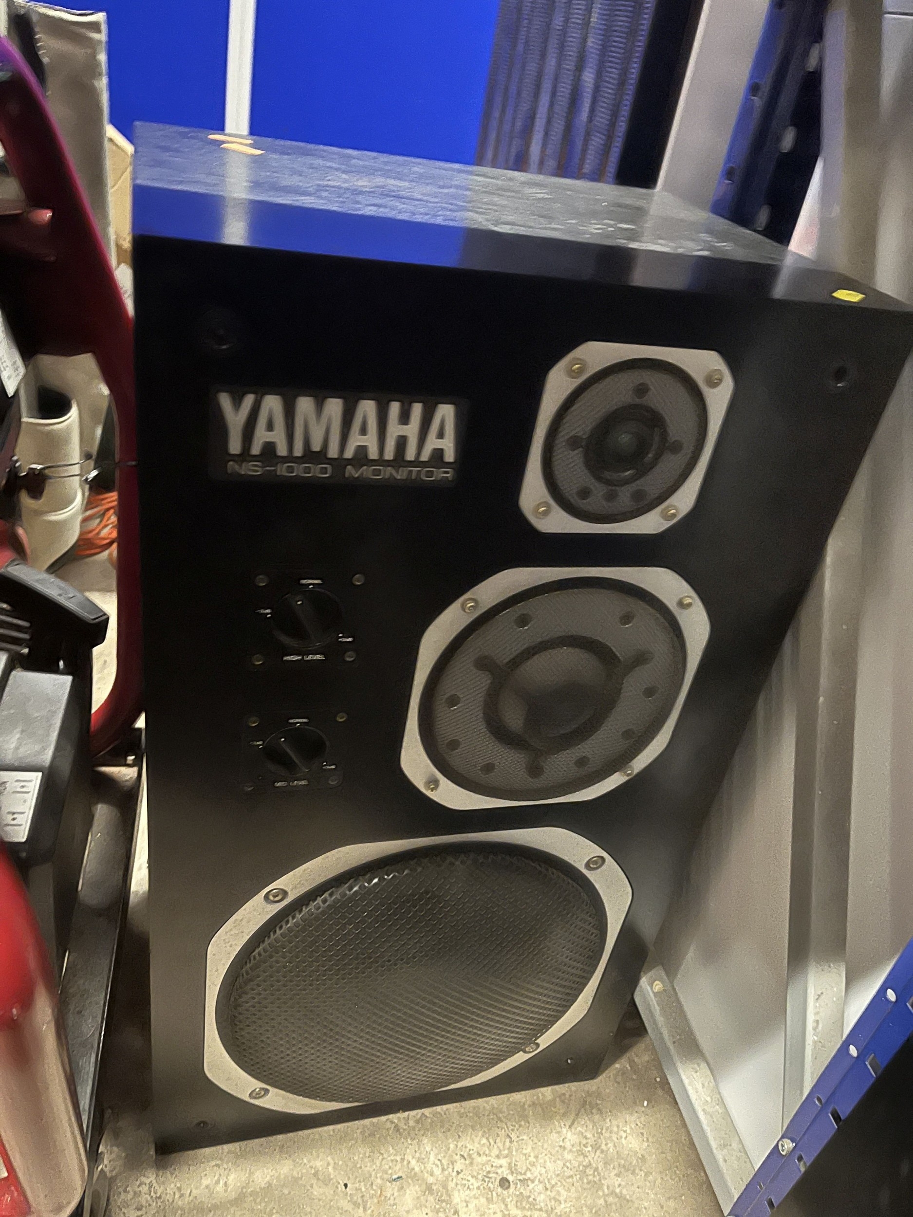 A PAIR OF VINTAGE YAMAHA NS 1000 MONITOR SPEAKERS with high and mid-level controls. Condition Report: all drivers working, small chip to one speaker case