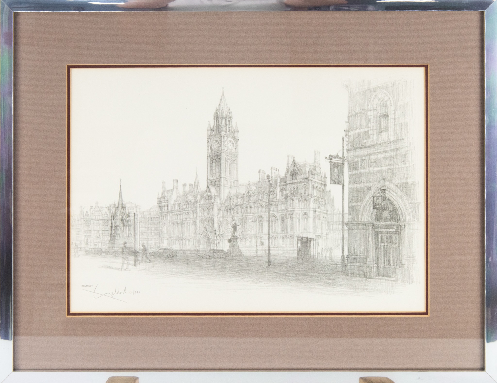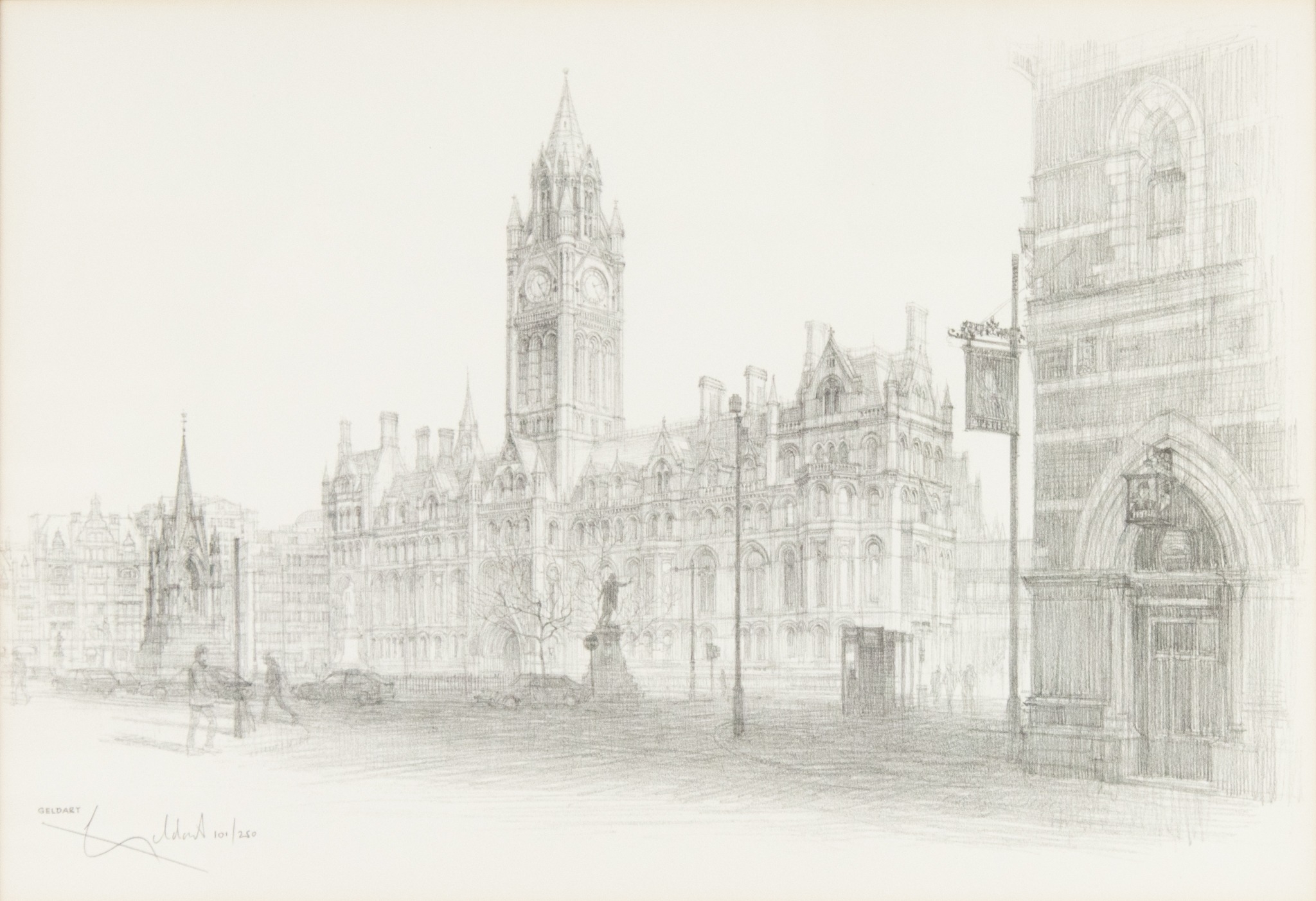 and a limited edition print from a pencil drawing after WILLIAM GELDART (b.1936), of MANCHESTER TOWN HALL, numbered 101/250 (3)