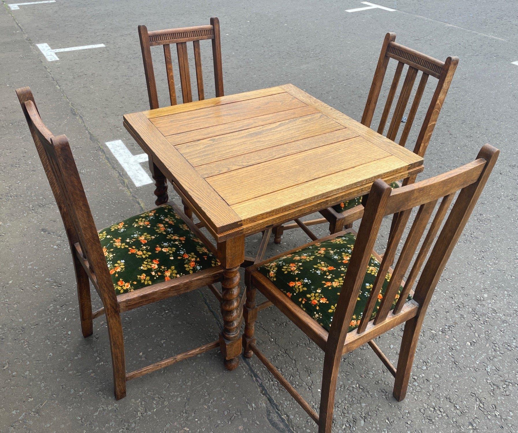 A c1930's/40's extending dining table and four chairs, table unextended 3ft square approx