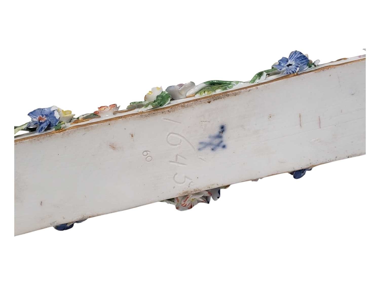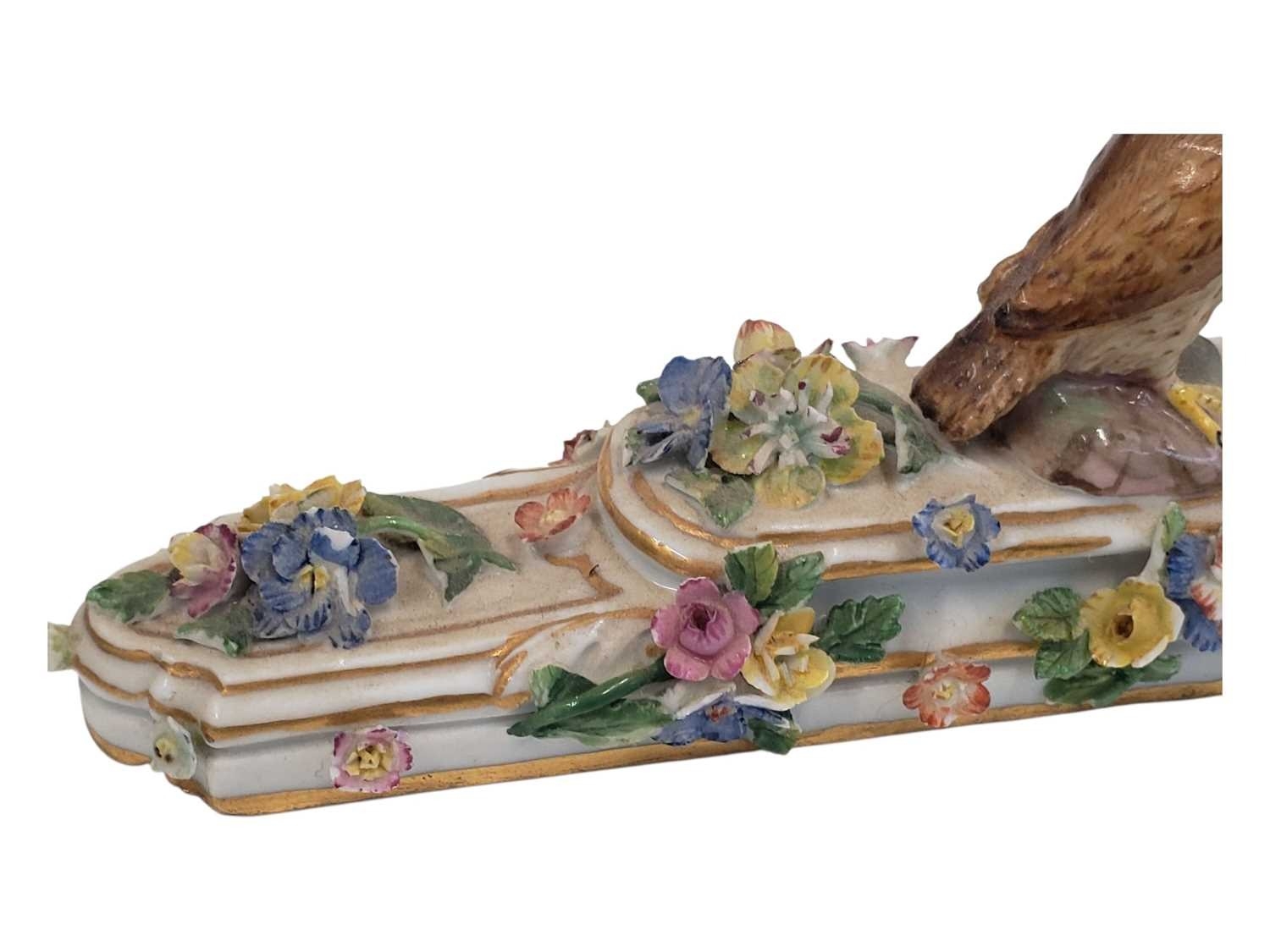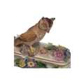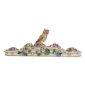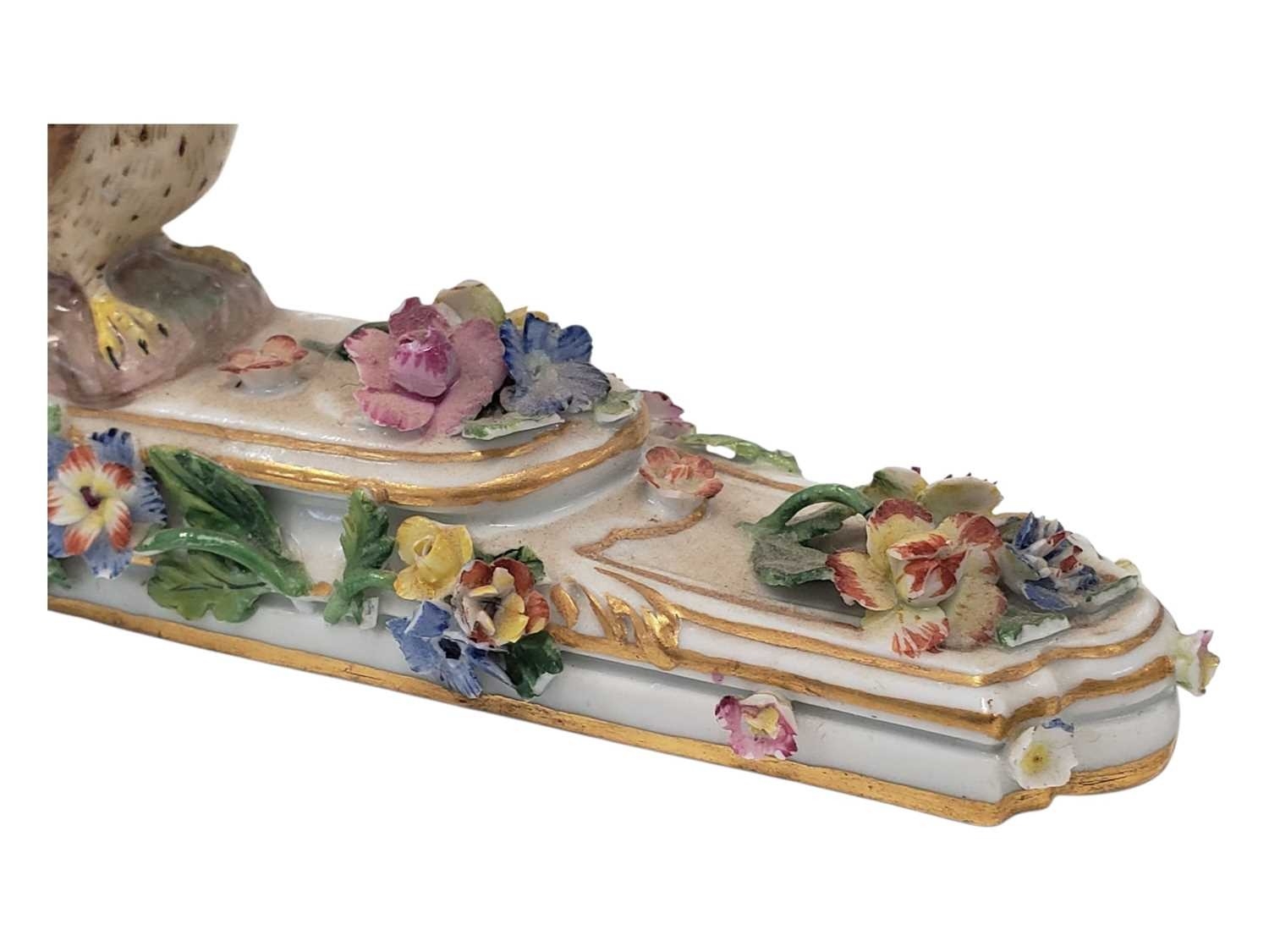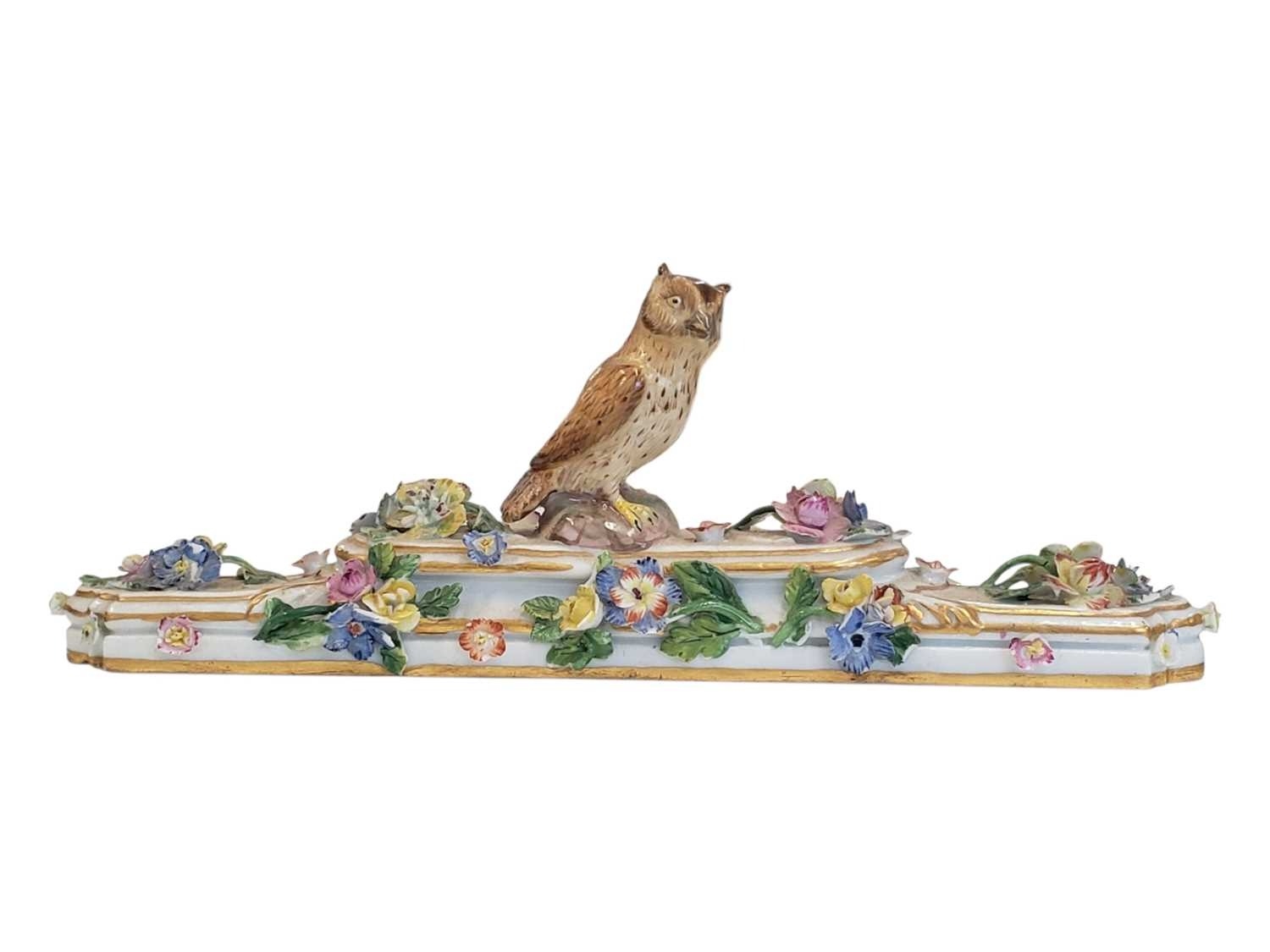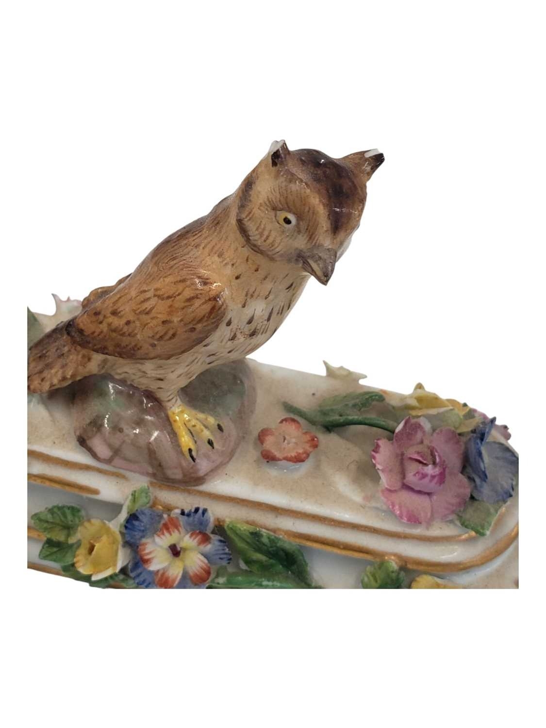 Meissen, Germany - An 18th century porcelain china figure / ornament. Having an owl figure to top on a stepped base with hand crafted enamelled flowers and gilt borders. With crossed swords maker's mark to underside.