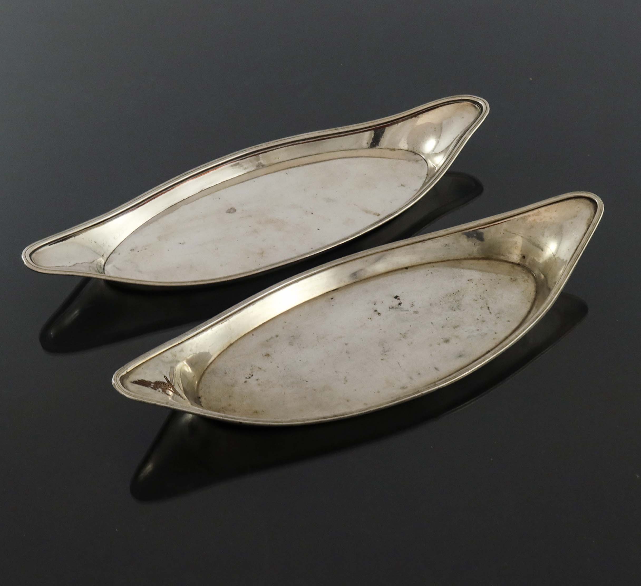 Two George III Old Sheffield Plate candle snuffer trays, oval form with reeded borders, 26cm long (2)