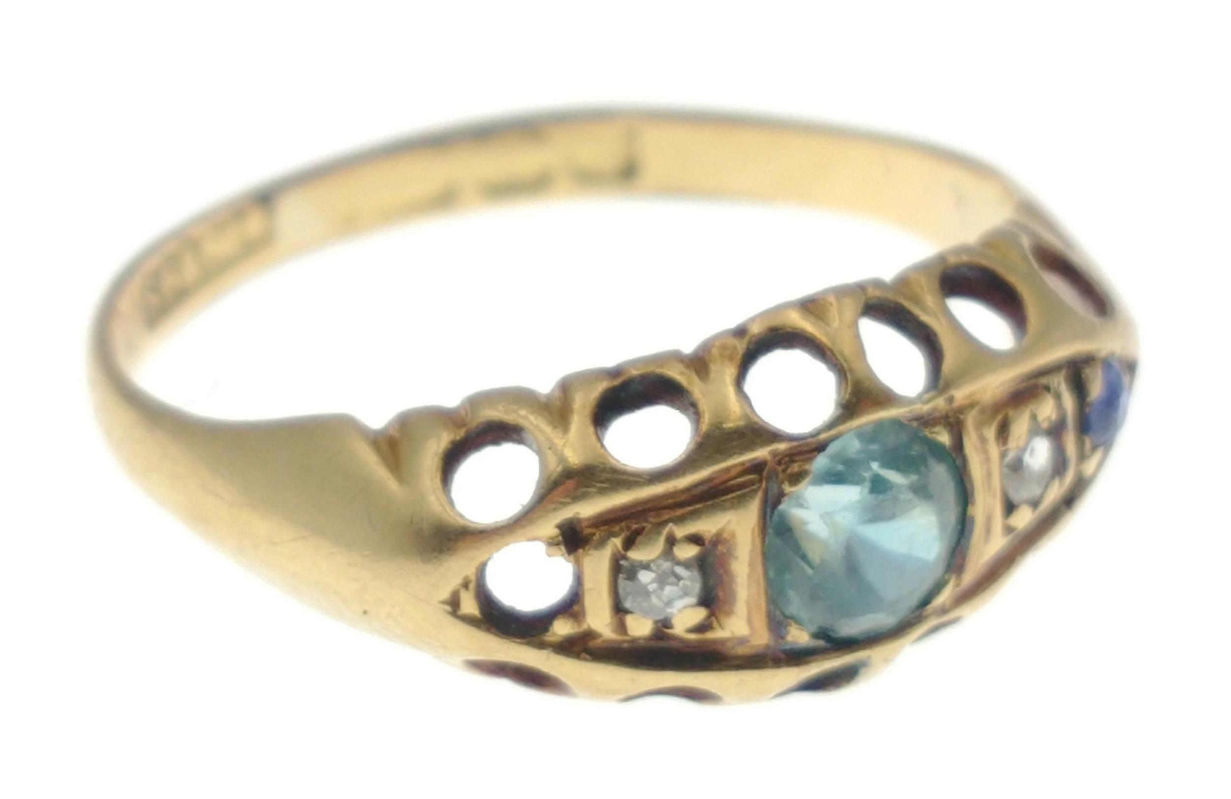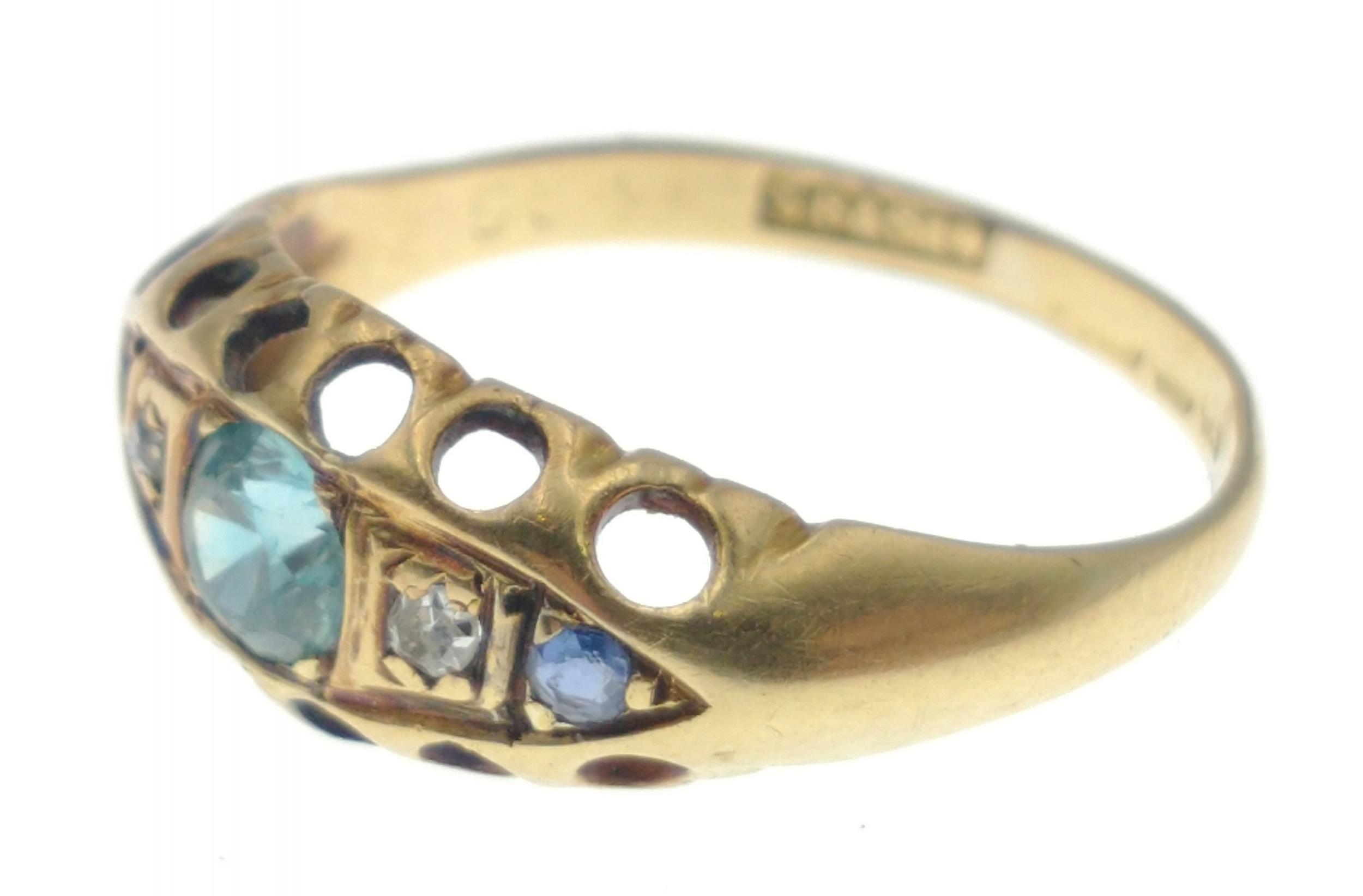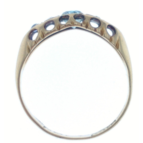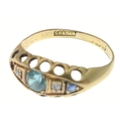 PRETTY RING! A 9ct stamped yellow gold ring size L with an aqua marine stone centred and flanked with 2 small diamonds (tested) - gross weight 1.84g approx
