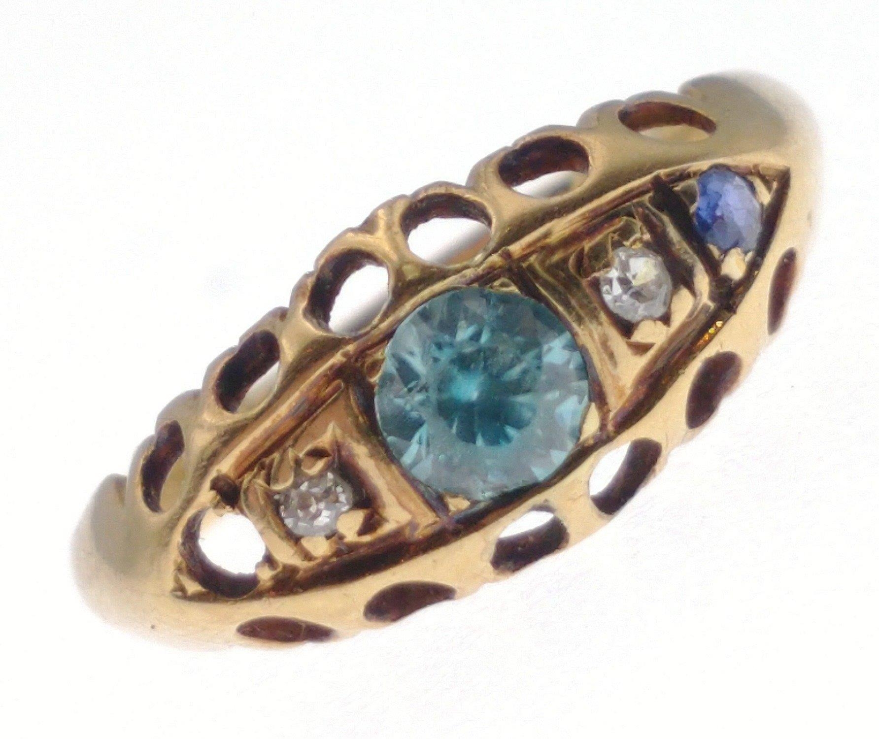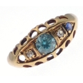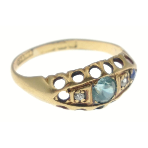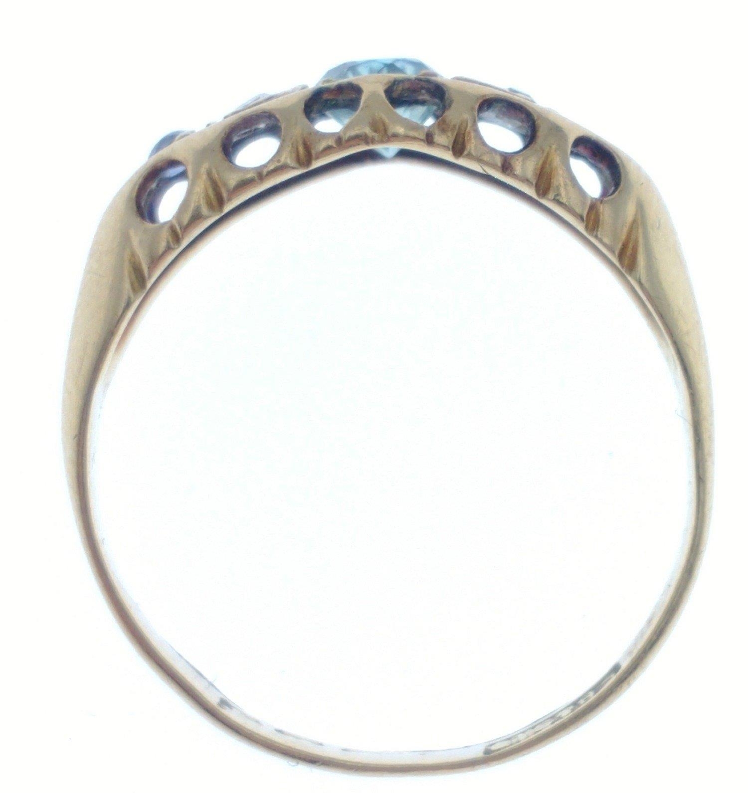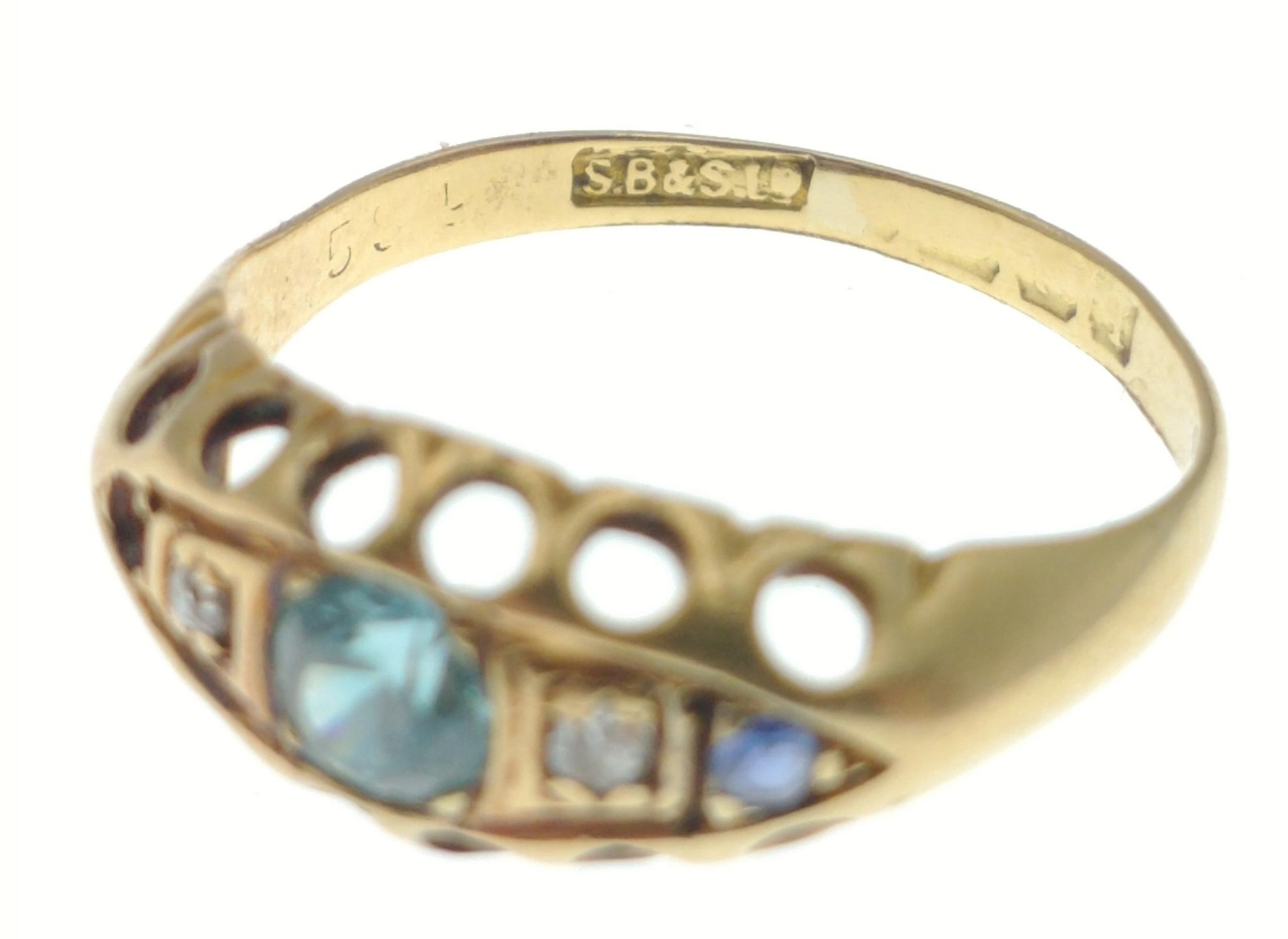 PRETTY RING! A 9ct stamped yellow gold ring size L with an aqua marine stone centred and flanked with 2 small diamonds (tested) - gross weight 1.84g approx