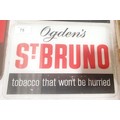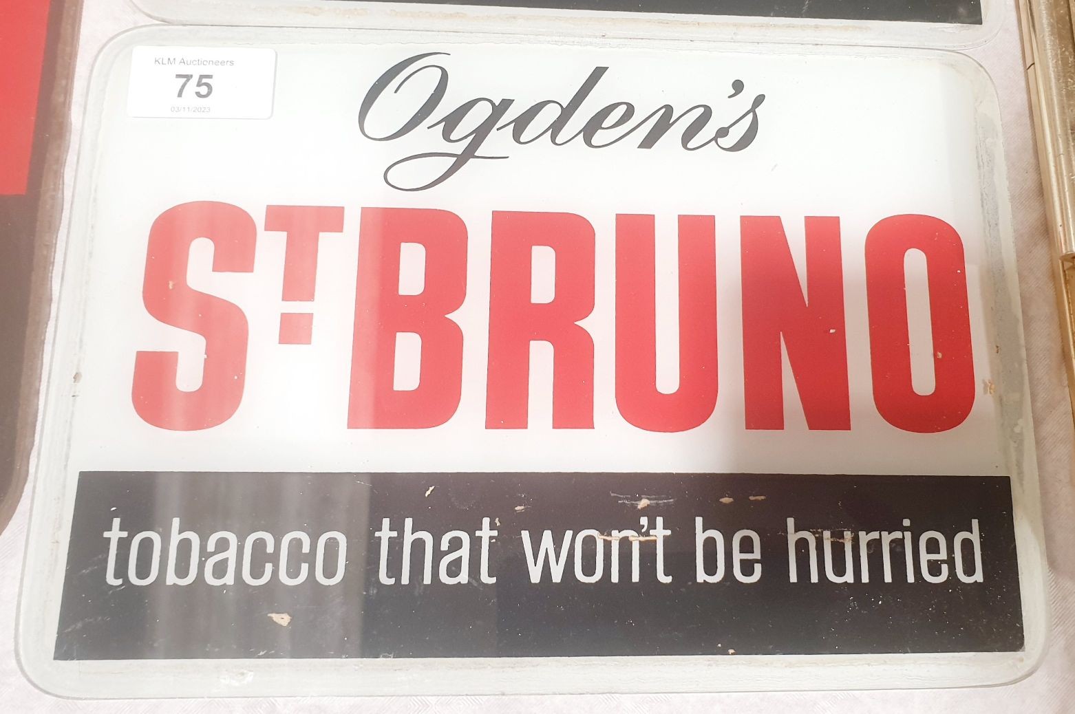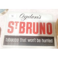 A vintage glass Ogden's St. Bruno tobacco advertising sign, 7"x10". No shipping. Arrange collection or your own packer and shipper, please.