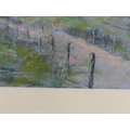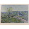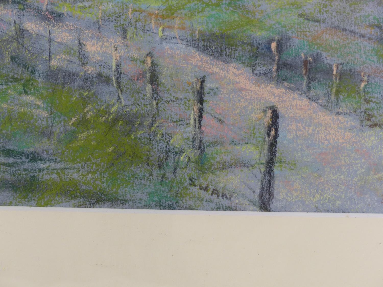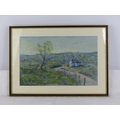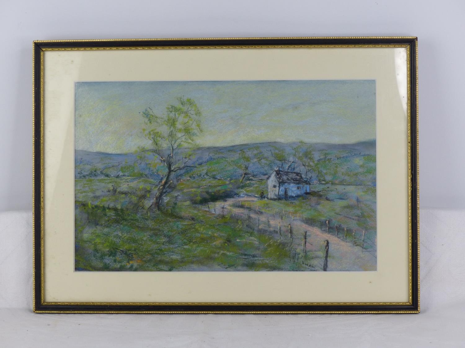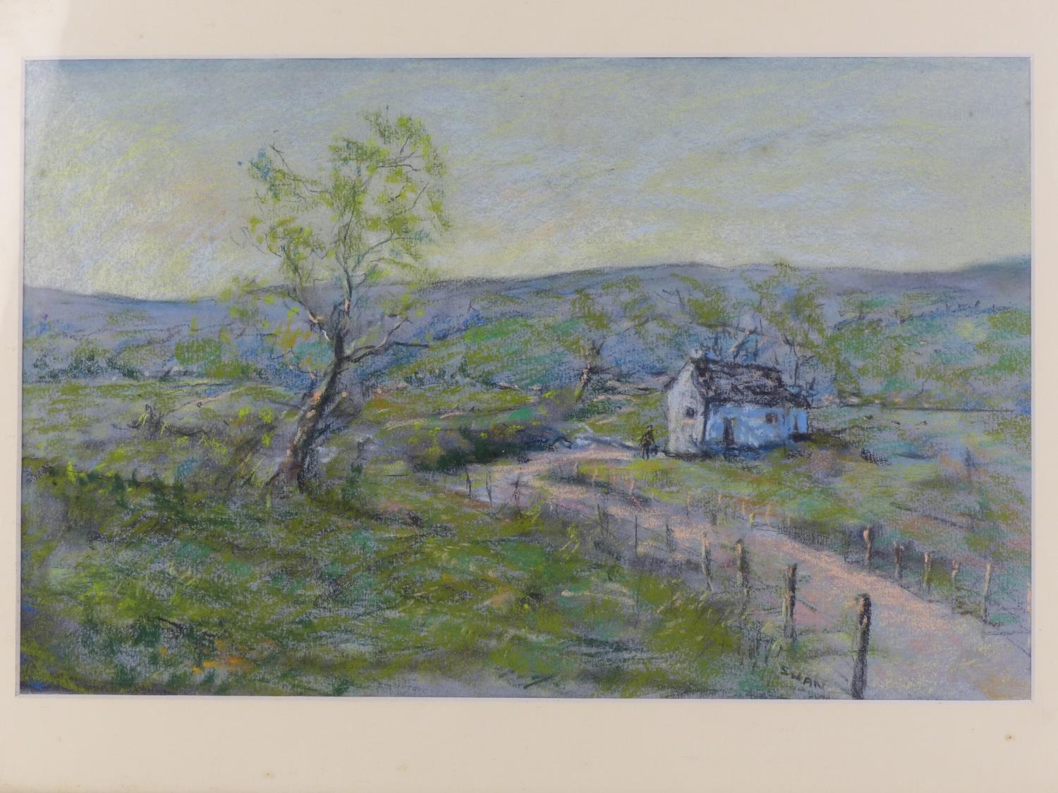 A framed chalk drawing of a rural dwelling, signed Swan.