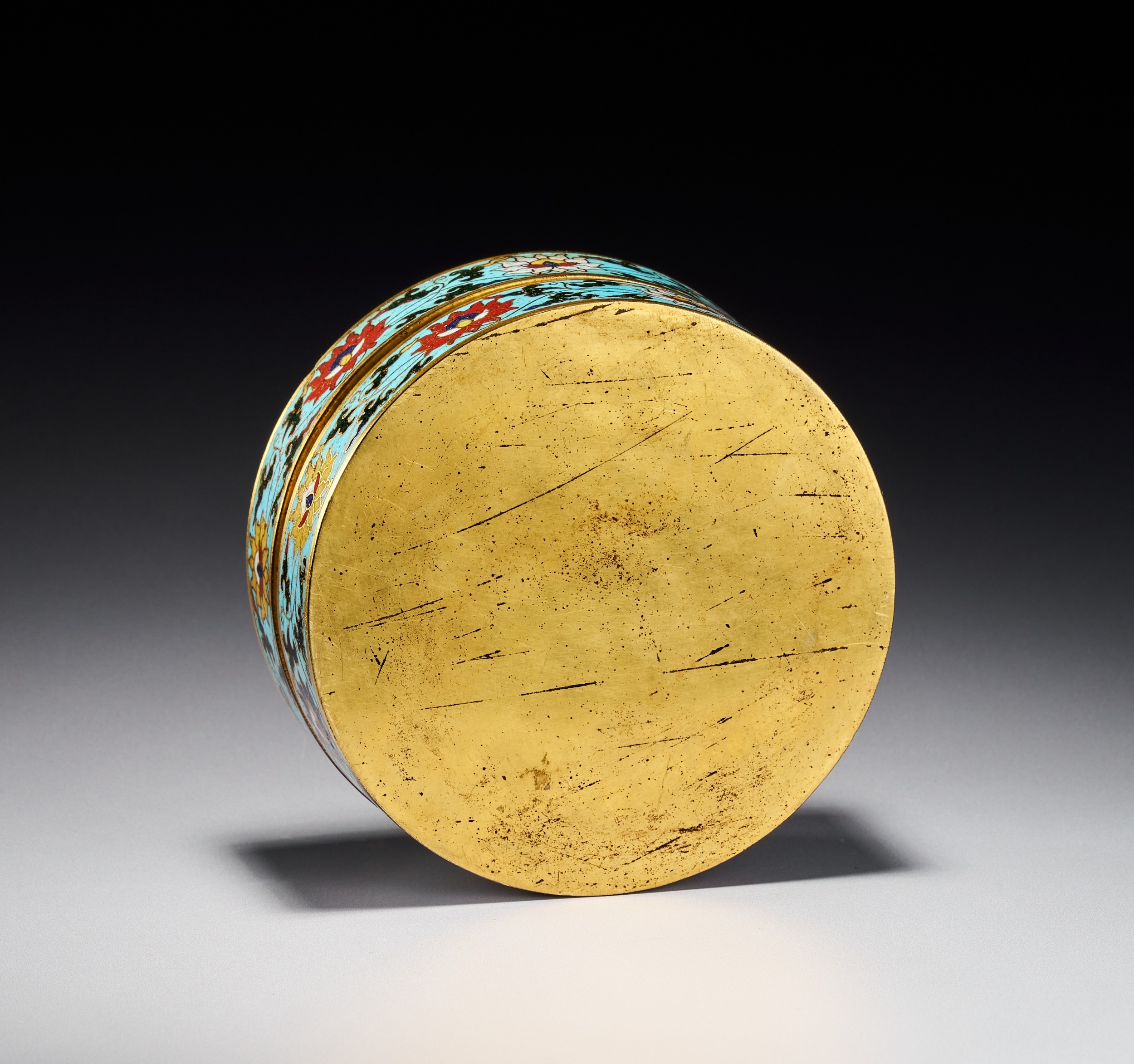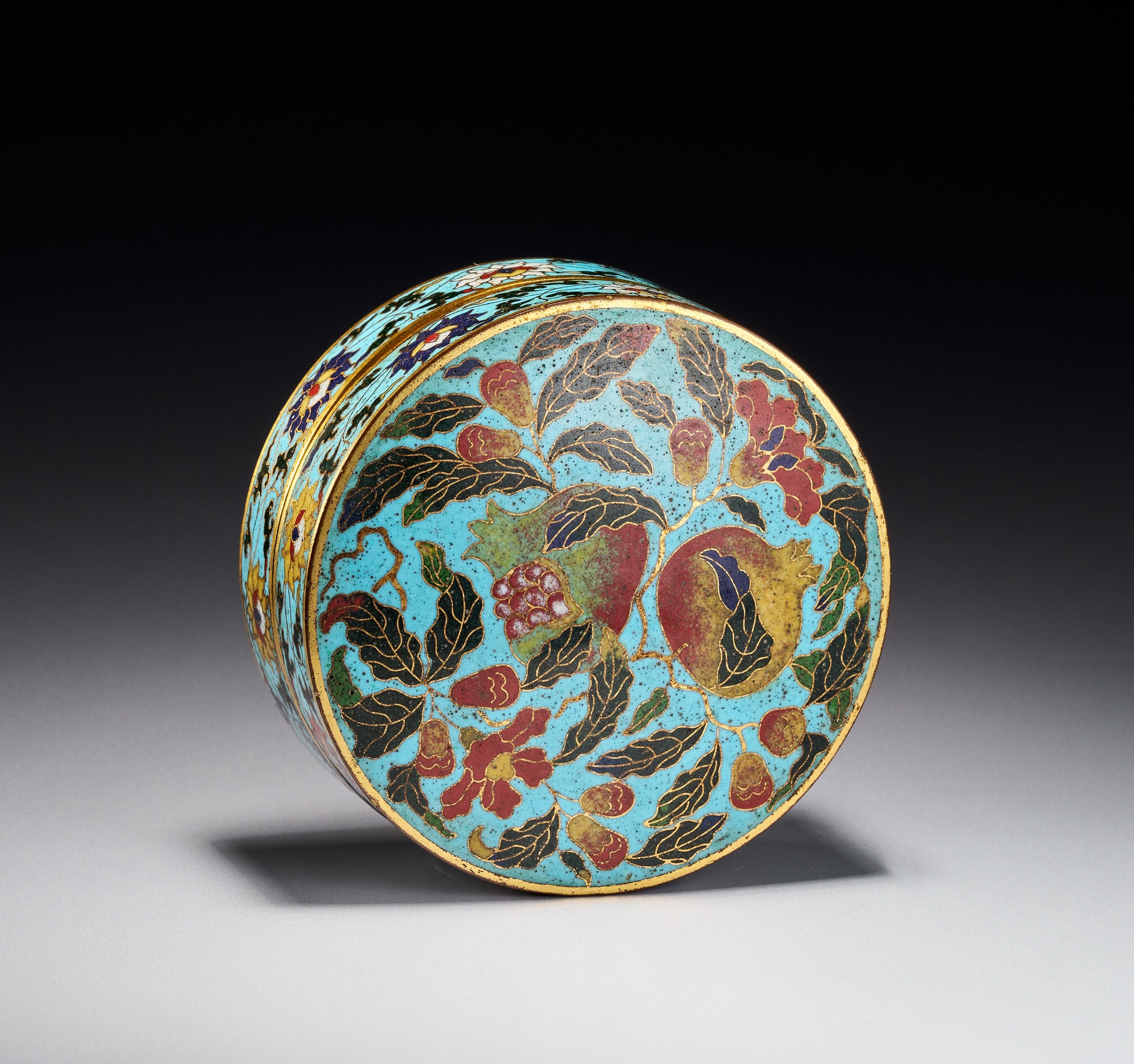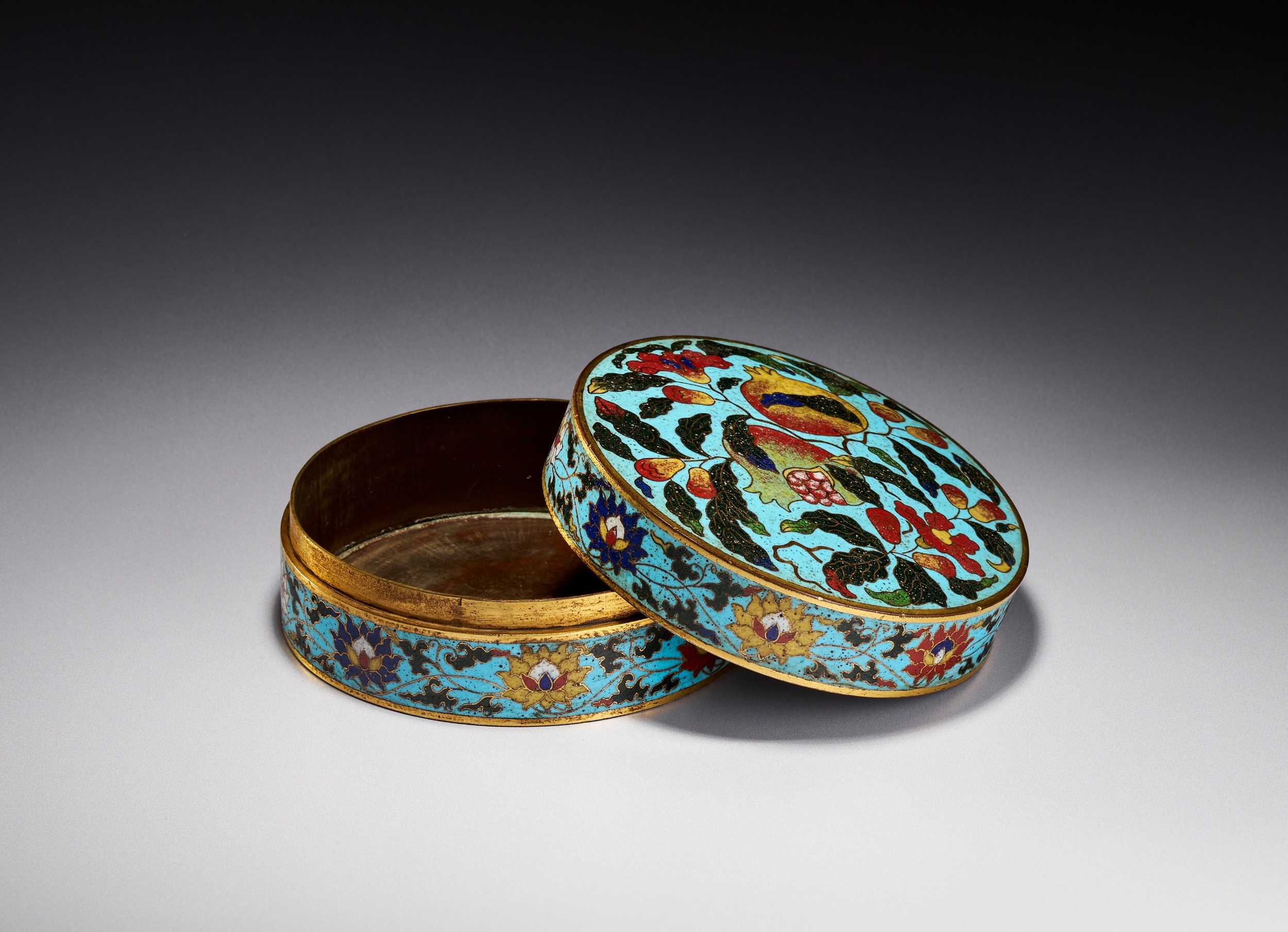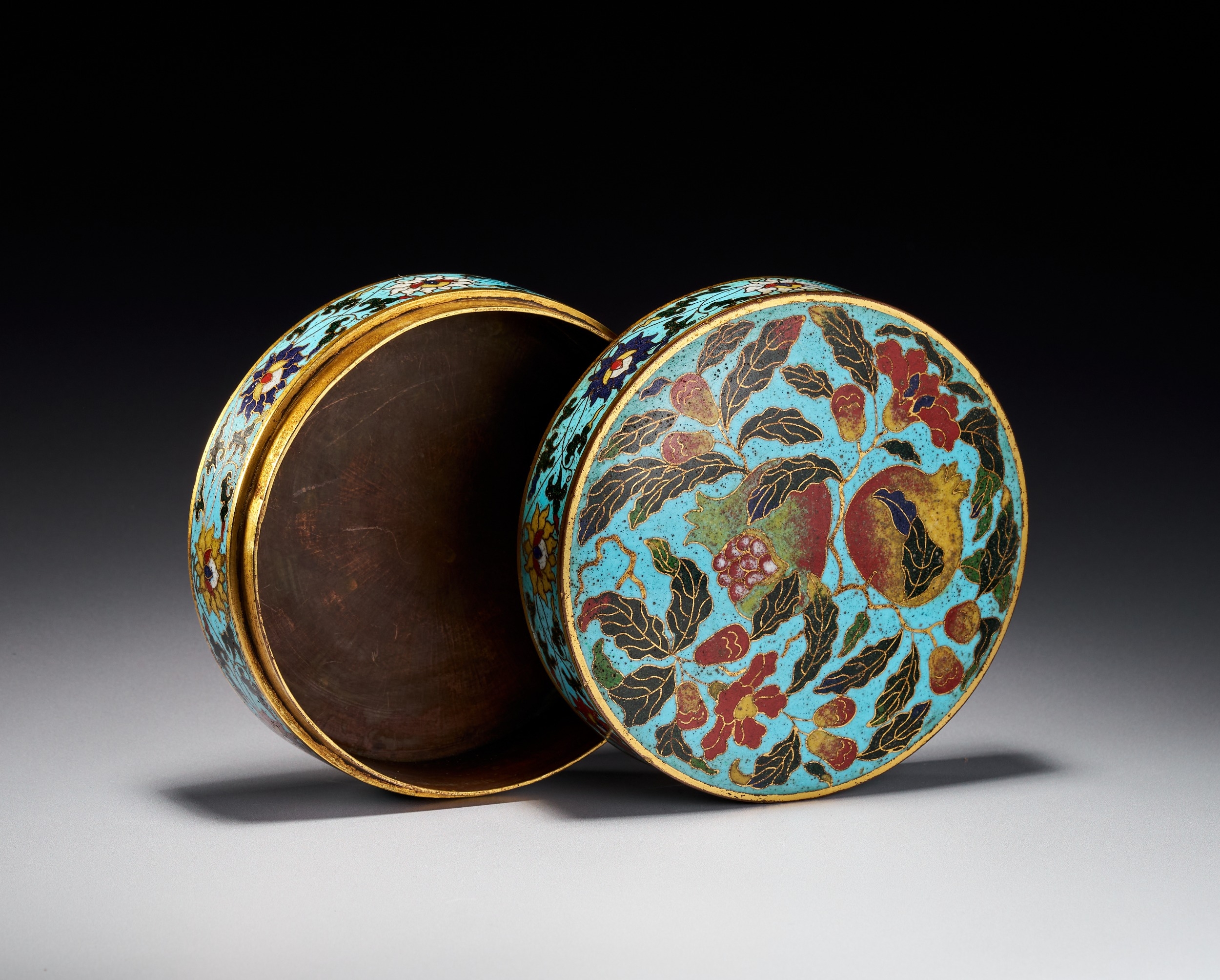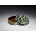 This Chinese circular covered box is constructed from a gilded base metal decorated with cloisonne enamel. The slightly domed lid features a fruiting and flowering pomegranate branch set against a vibrant turquoise blue ground. The design includes ripe pomegranates, some burst open to reveal seeds, alongside foliage in shades of green, yellow, and red. The cylindrical sides of both the lid and the base are decorated with a continuous scrolling floral and foliate band, likely representing lotus blossoms, on a matching turquoise ground. Both the interior of the box and the exterior base are finished with gilding. The construction involves the application of thin metal wires to create cells for colored vitreous pastes. While the design and color palette are reminiscent of Ming Dynasty prototypes, no maker marks or reign marks are present on the base or body of the item.