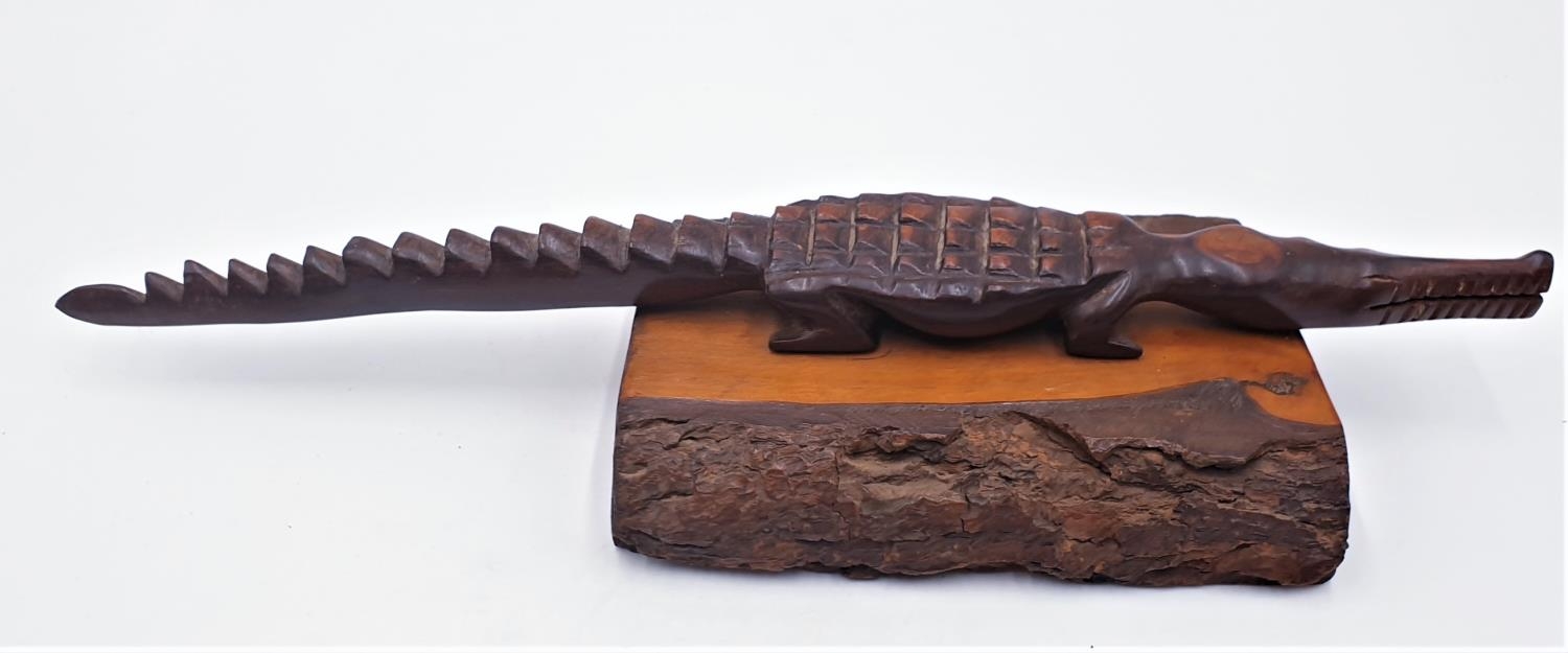 WOODEN CARVED 47cm MODEL OF A CROCODILE ON BASE
