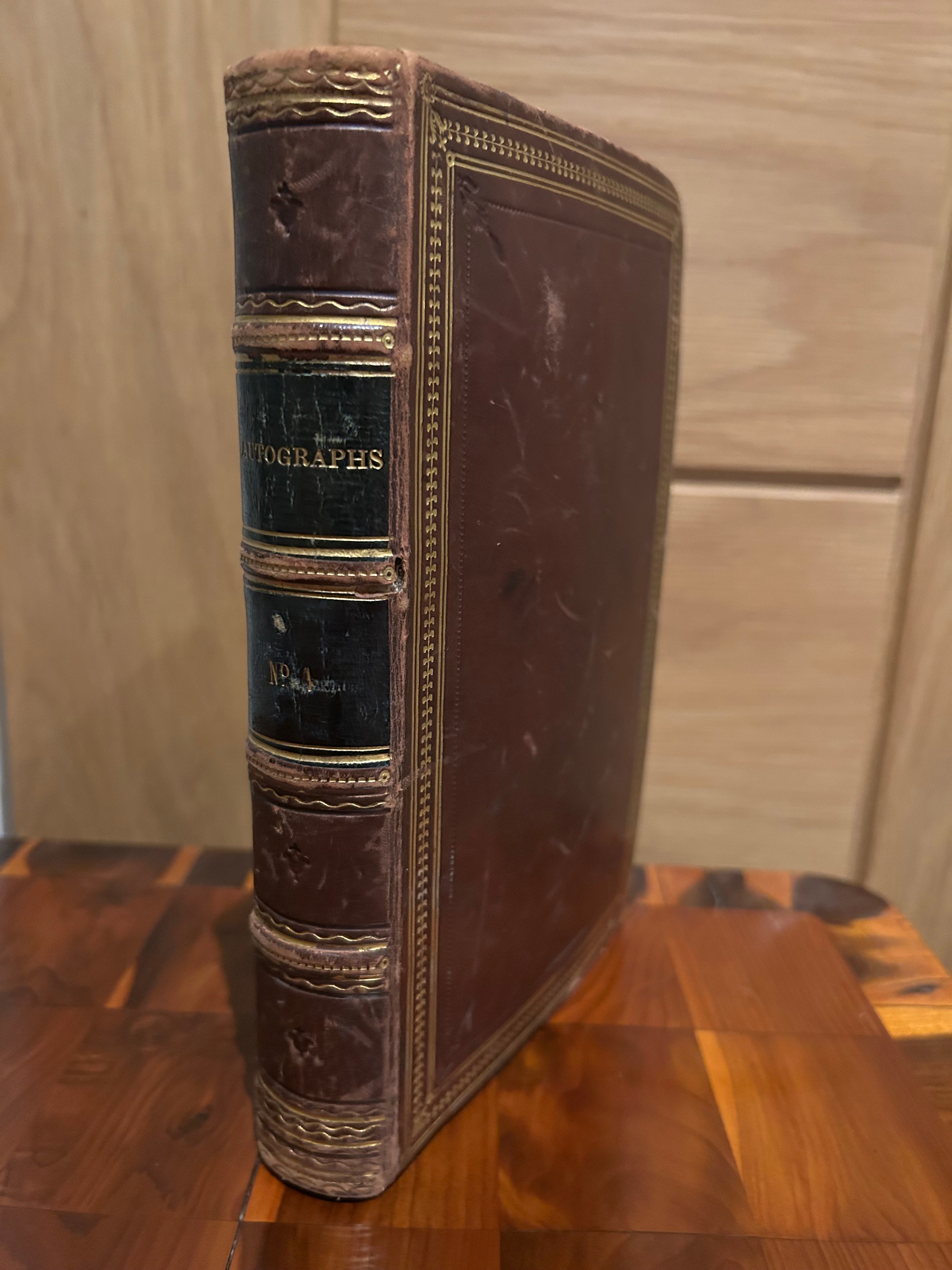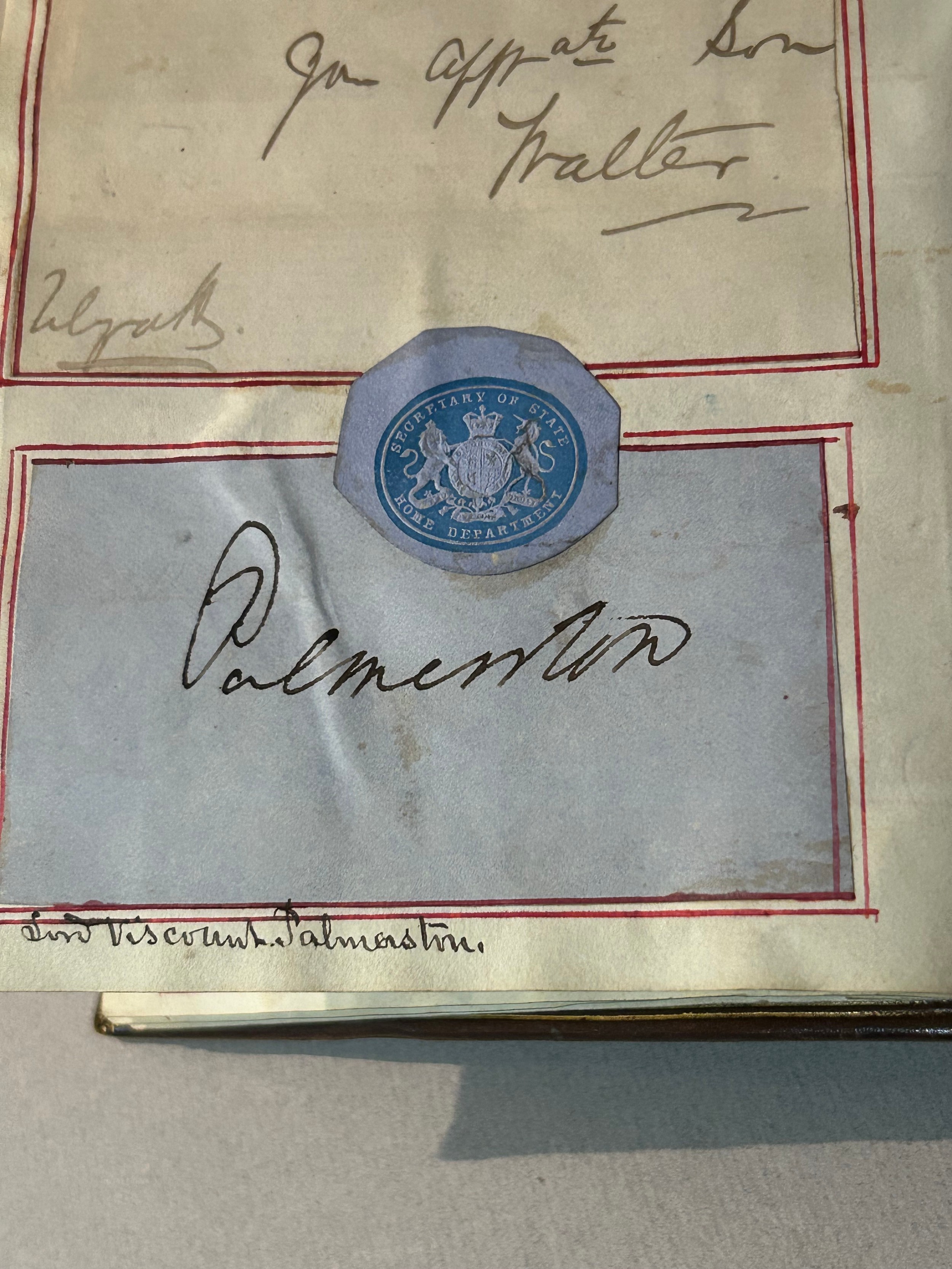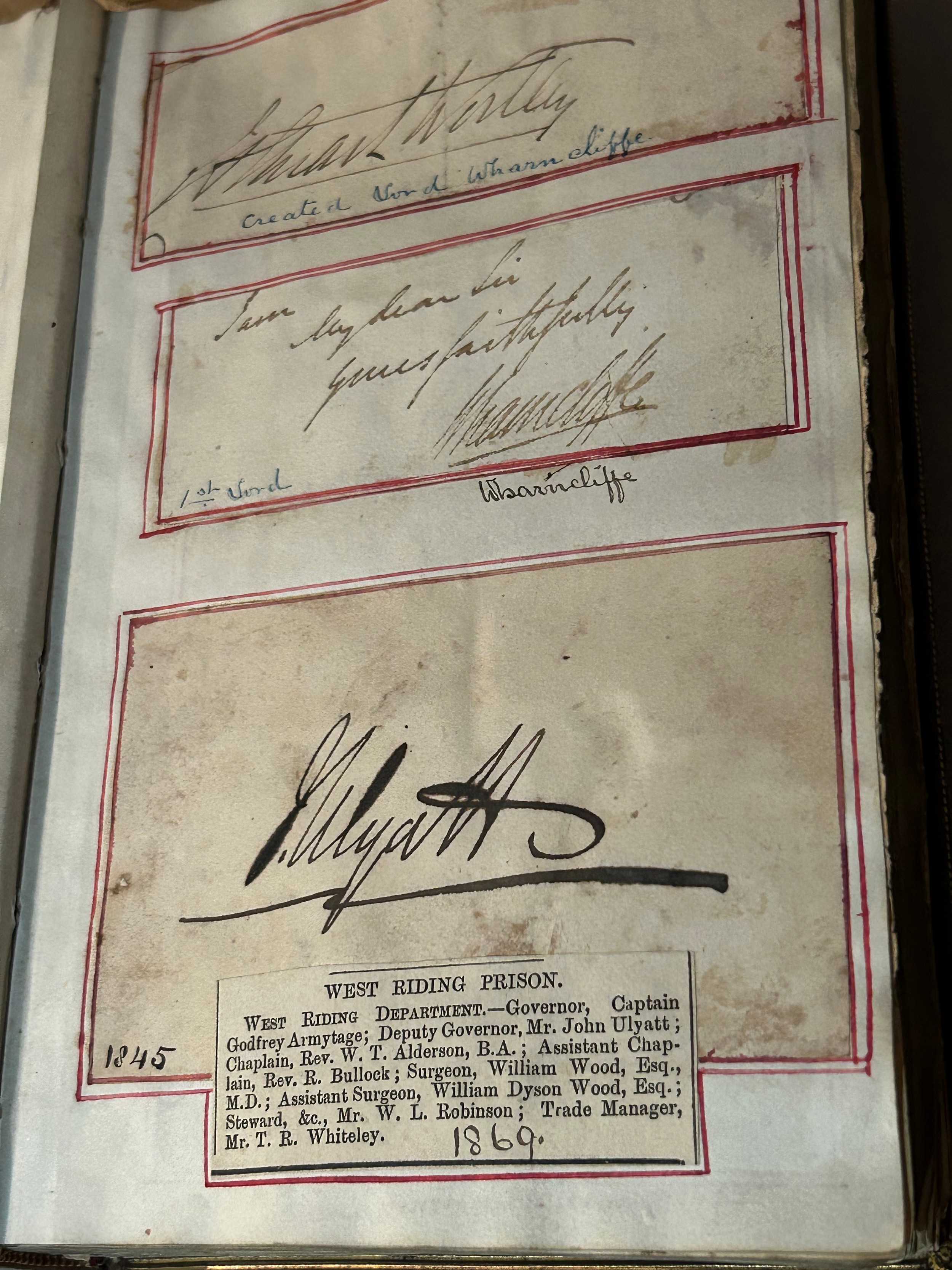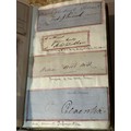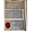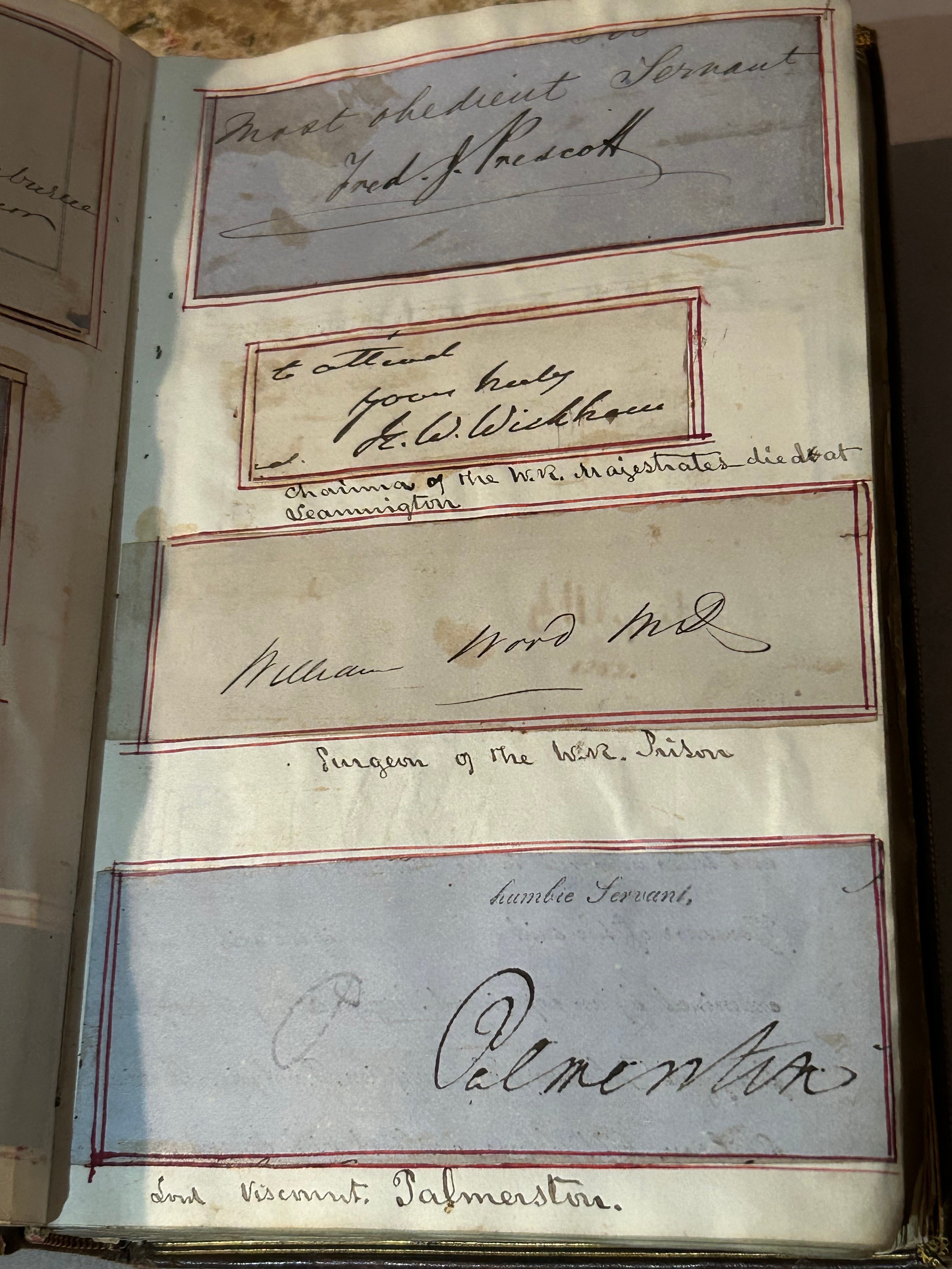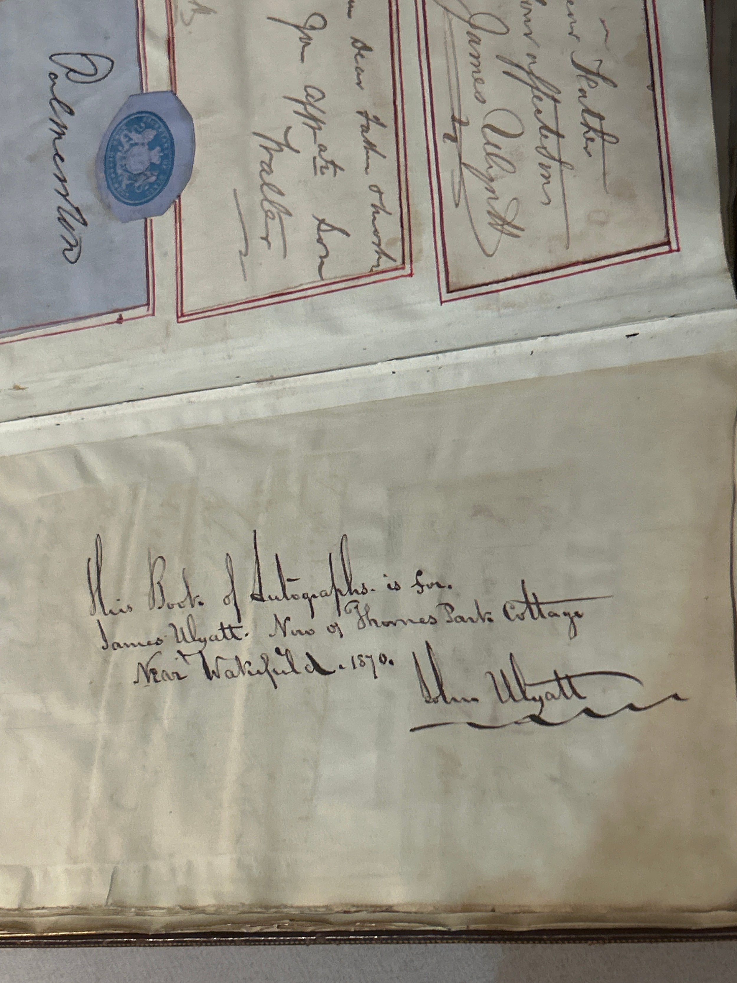 A fascinating and important leather bound autograph album compiled in the mid 19th Century by John Ulyatt, Deputy Governor of Wakefield Prison. Original Autographs:- Royalty including all 19th Century British Monarchs :- George III, Prince Regent, George IV, William IV, Queen Victoria. Politicians including Lord Viscount Palmerston (Prime Minister), Lord Melbourne (Prime Minister), 3rd Earl of Mexborough, Spencer Horatio Walpole, Sir George Grey (Home Secretary), Lord Wharncliffe, Lord Houghton (full letter), Lord Broughton (H Hobhouse friend of Lord Byron) George Cruikshank (caricaturist), Samuel Wilderspin (founded infant schools). Bank cheques for Wakefield Bank dated 1802 (the bank failed in 1825), Signatures of Prison Governors of Wakefield, Durham, Beverley, Southwell, Leeds, York Castle. Signatures of the turnkeys of Wakefield old Prison prior to 1840. A Mulready 1 Penny postal sheet circa 1840