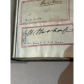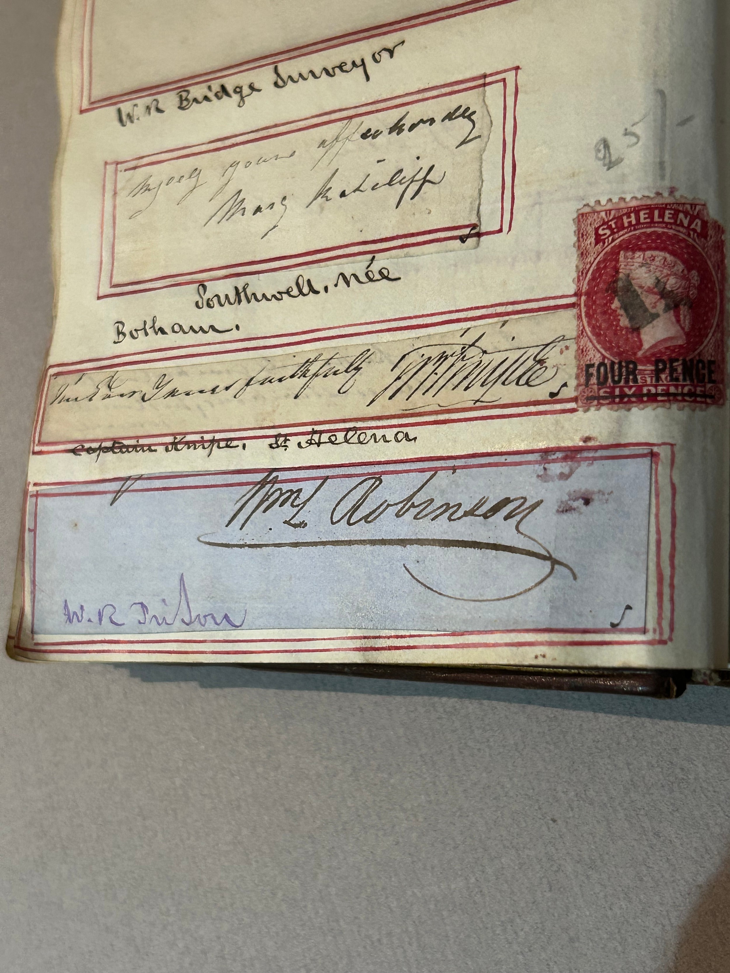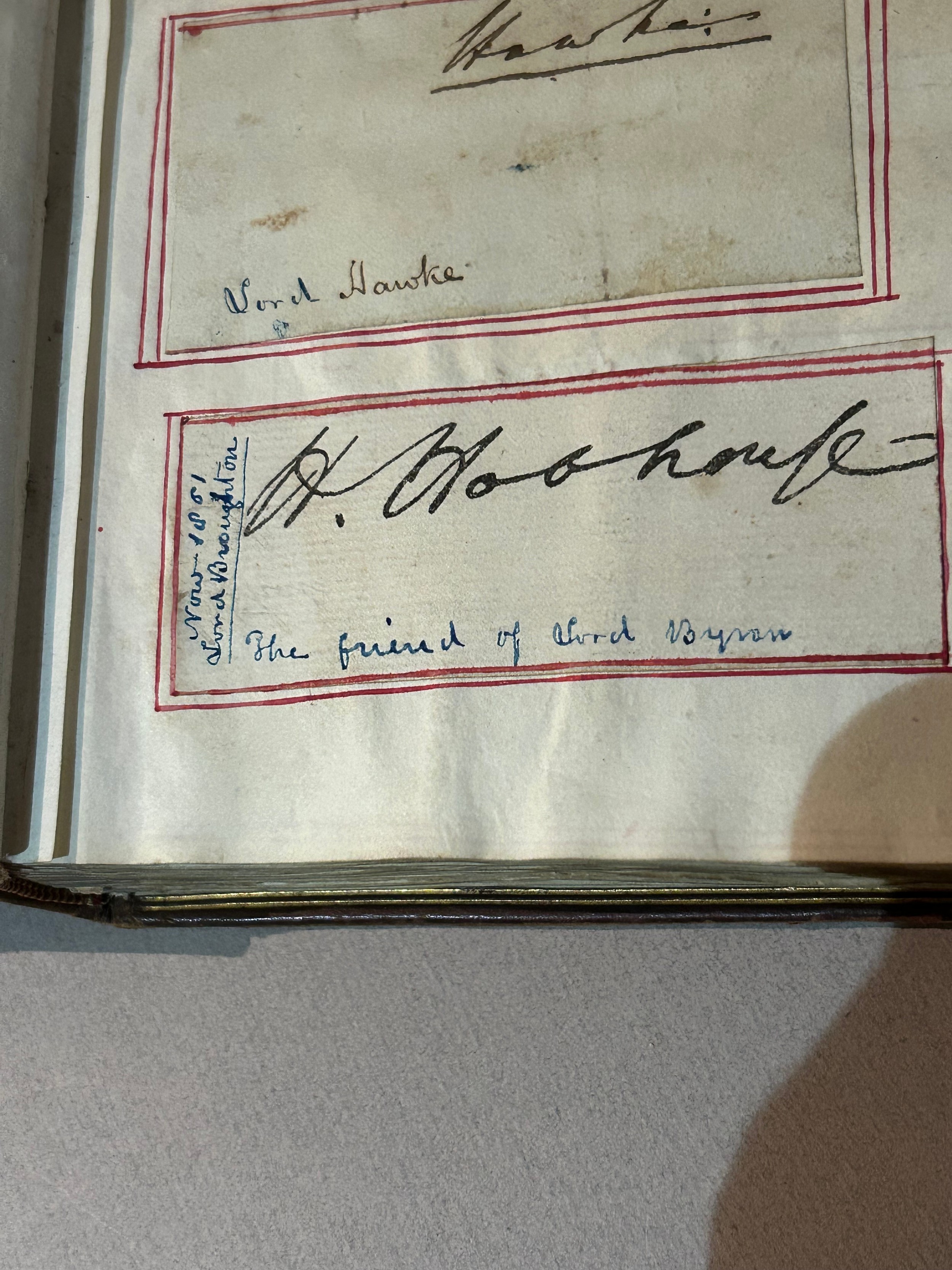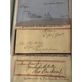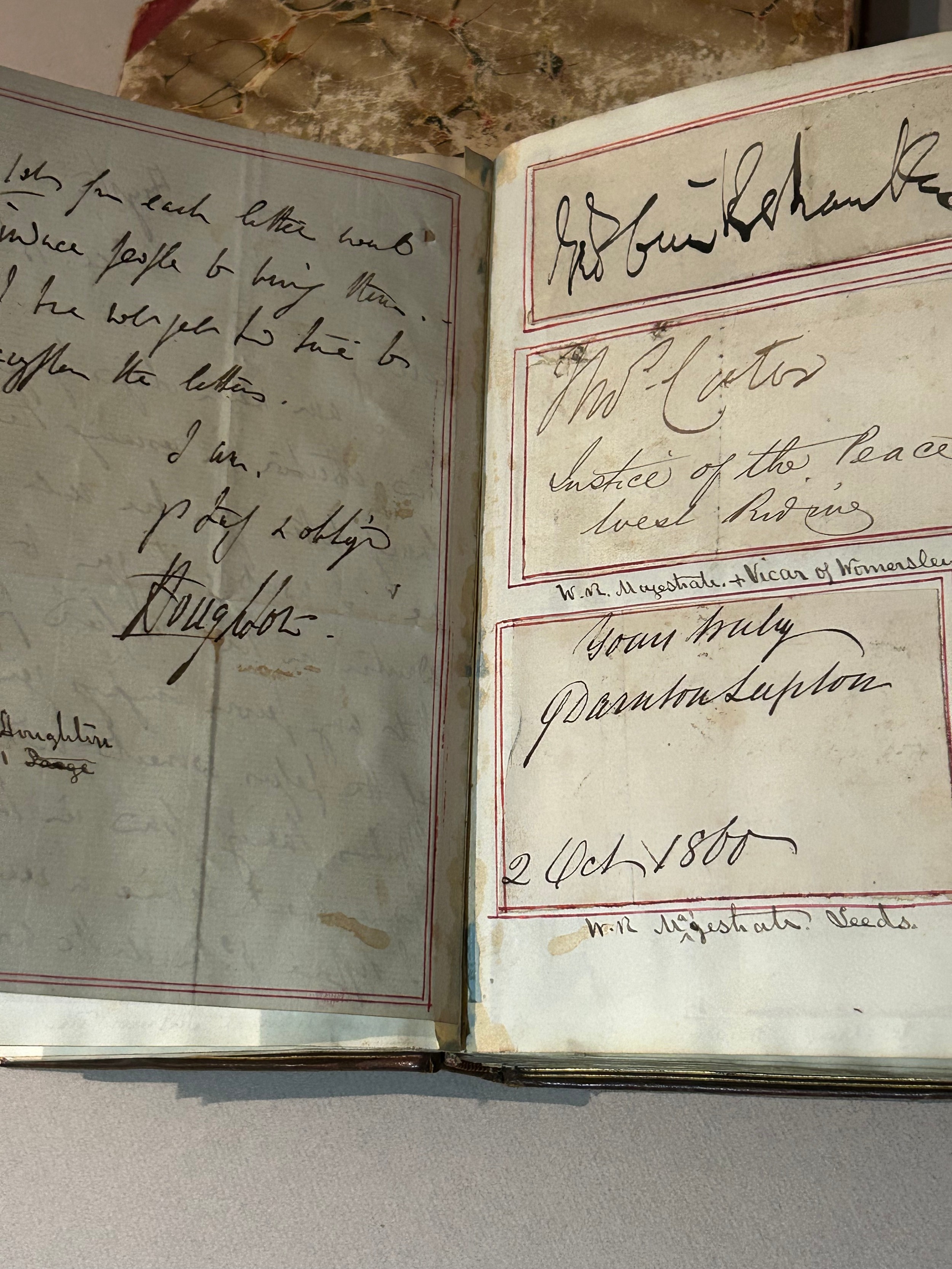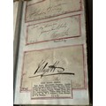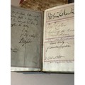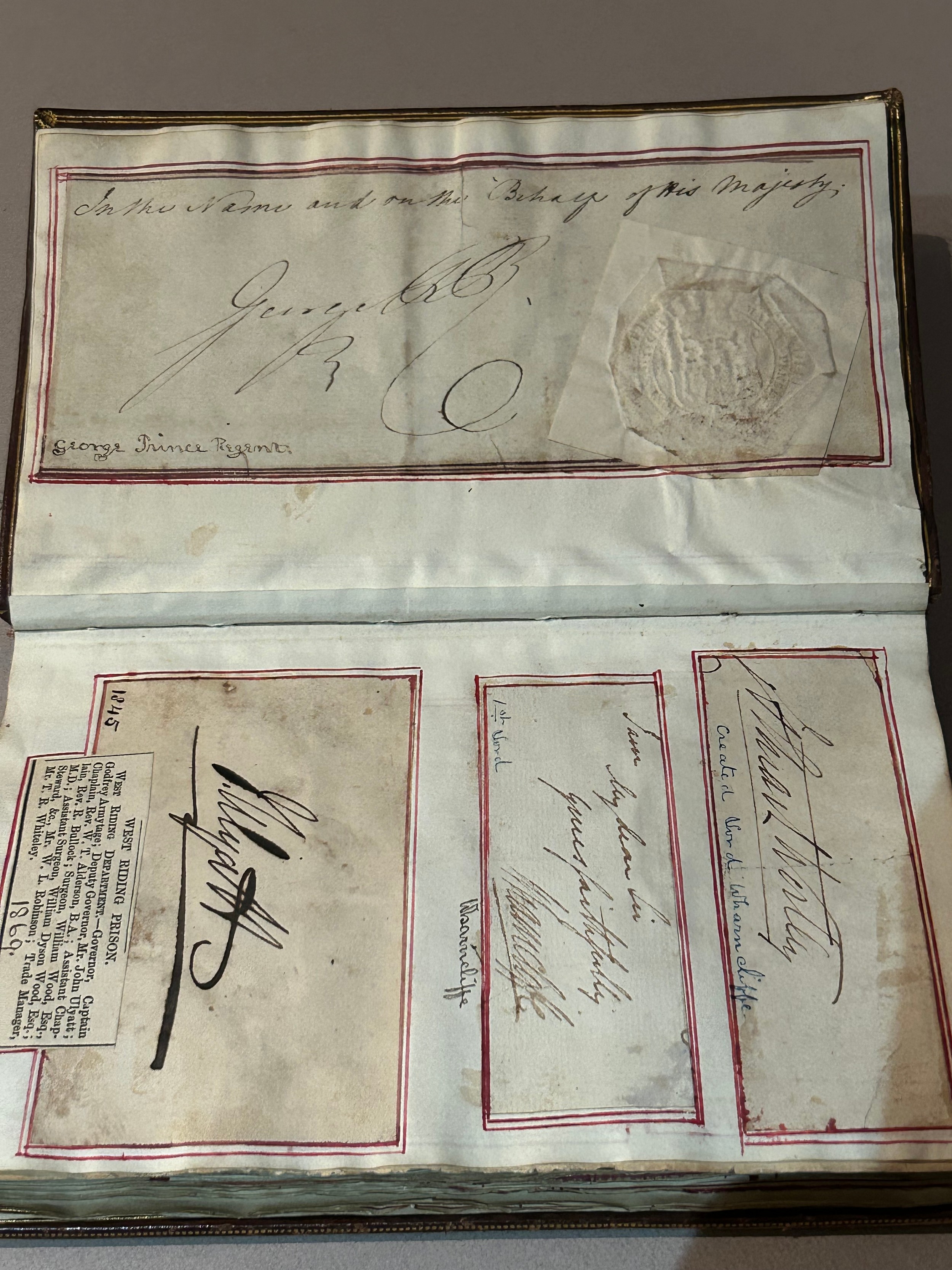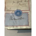 A fascinating and important leather bound autograph album compiled in the mid 19th Century by John Ulyatt, Deputy Governor of Wakefield Prison. Original Autographs:- Royalty including all 19th Century British Monarchs :- George III, Prince Regent, George IV, William IV, Queen Victoria. Politicians including Lord Viscount Palmerston (Prime Minister), Lord Melbourne (Prime Minister), 3rd Earl of Mexborough, Spencer Horatio Walpole, Sir George Grey (Home Secretary), Lord Wharncliffe, Lord Houghton (full letter), Lord Broughton (H Hobhouse friend of Lord Byron) George Cruikshank (caricaturist), Samuel Wilderspin (founded infant schools). Bank cheques for Wakefield Bank dated 1802 (the bank failed in 1825), Signatures of Prison Governors of Wakefield, Durham, Beverley, Southwell, Leeds, York Castle. Signatures of the turnkeys of Wakefield old Prison prior to 1840. A Mulready 1 Penny postal sheet circa 1840