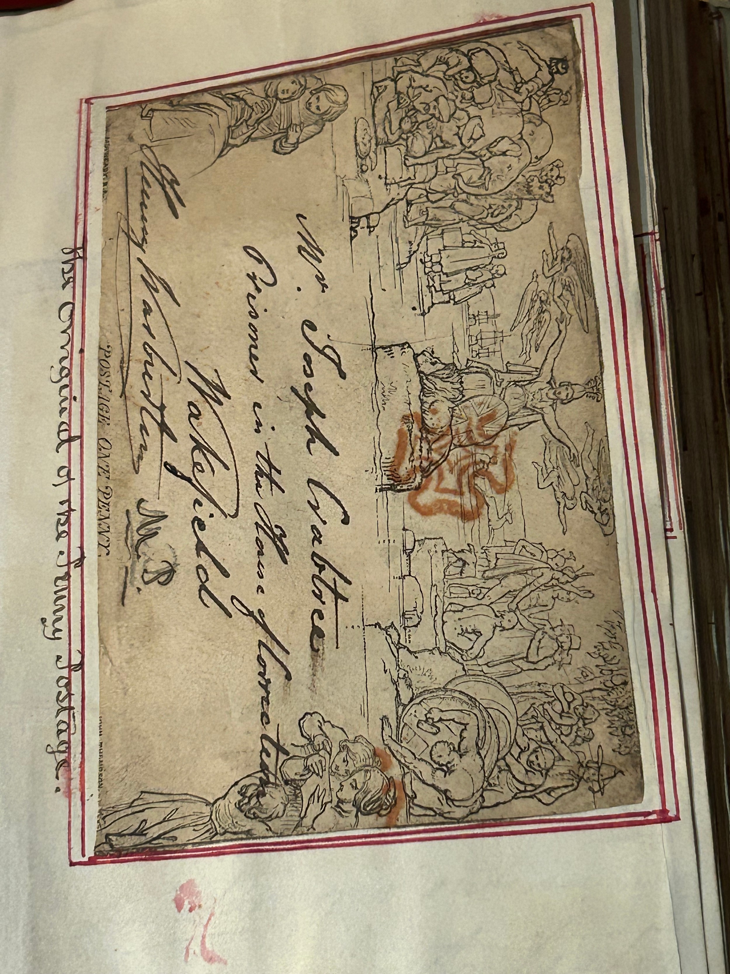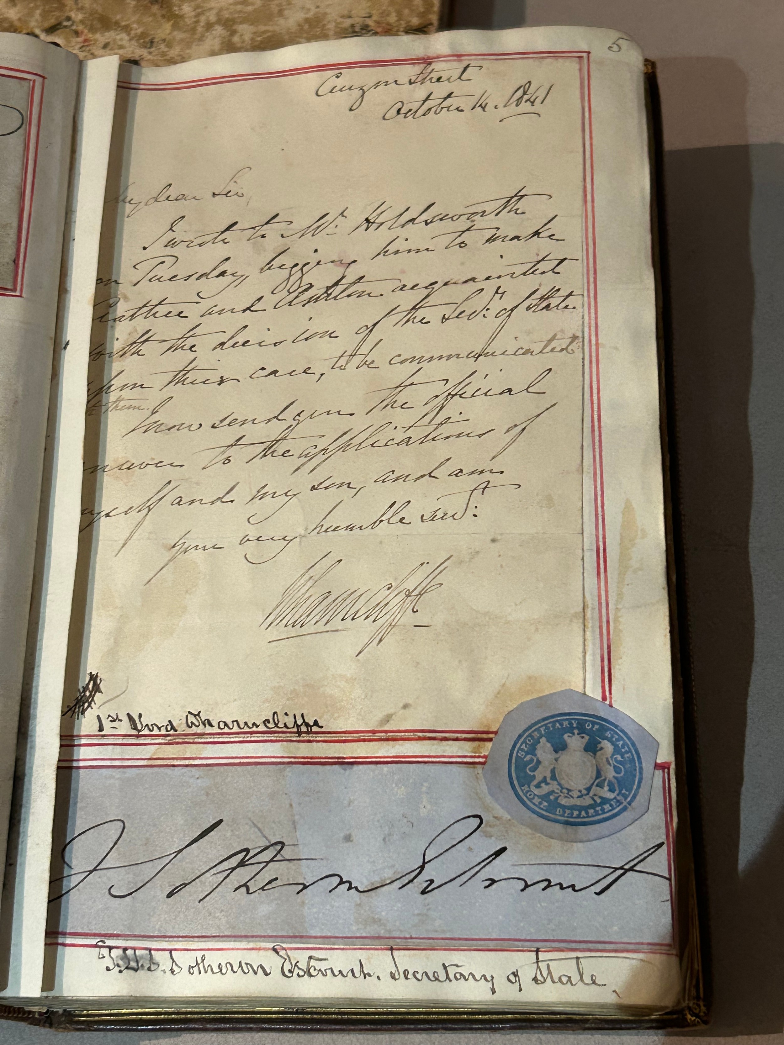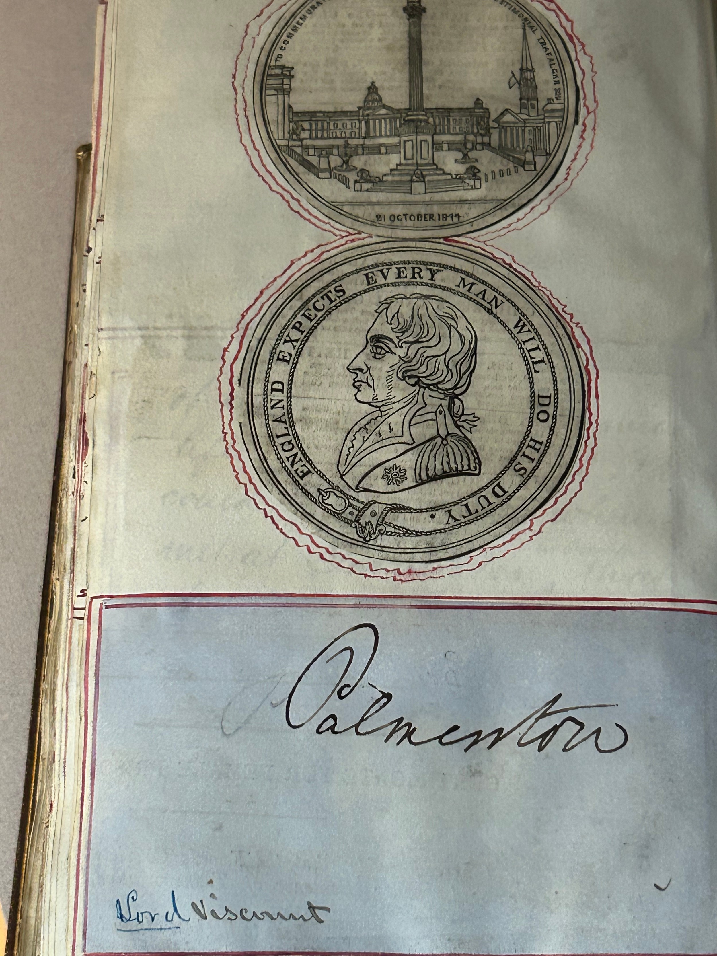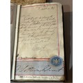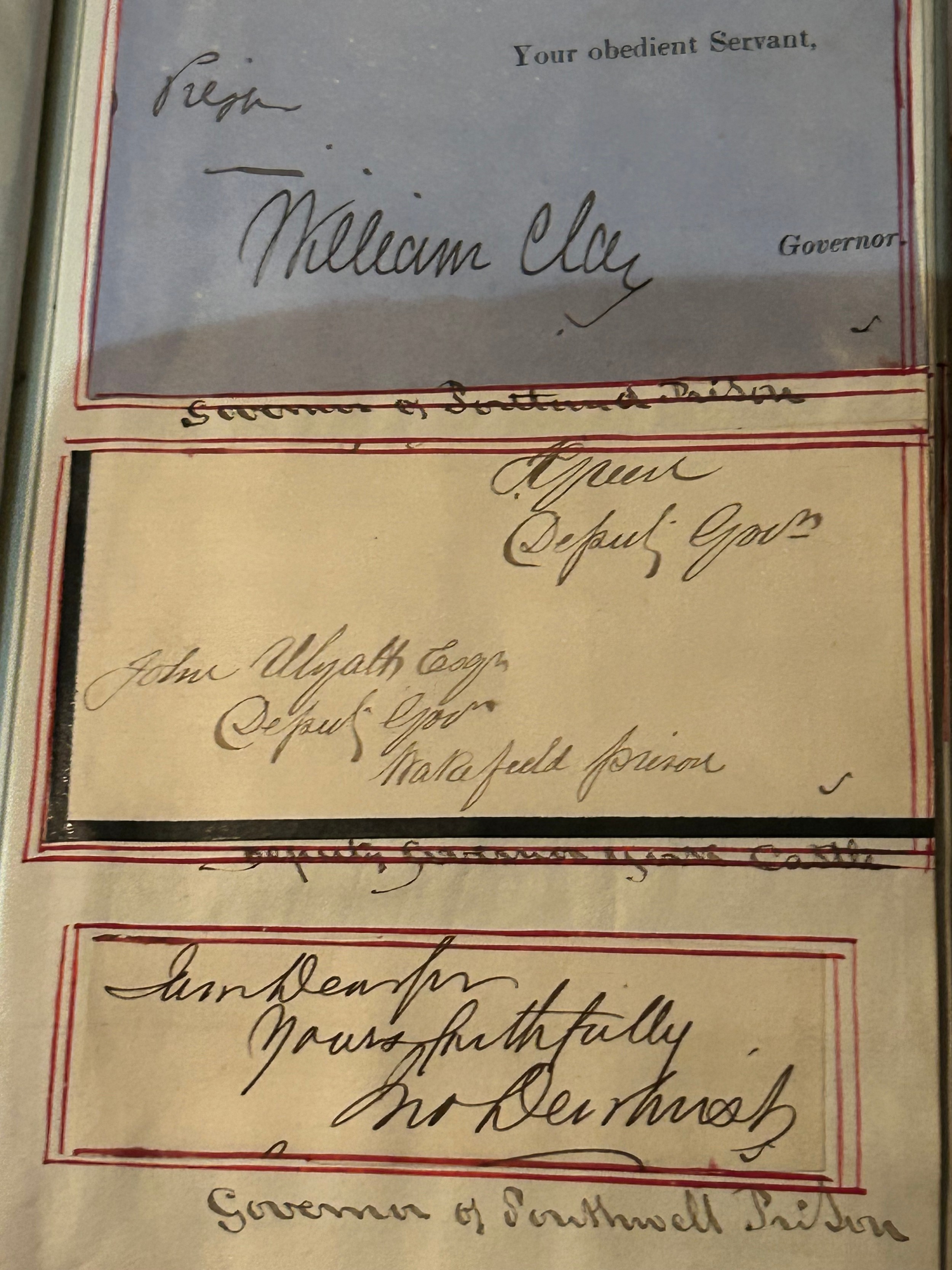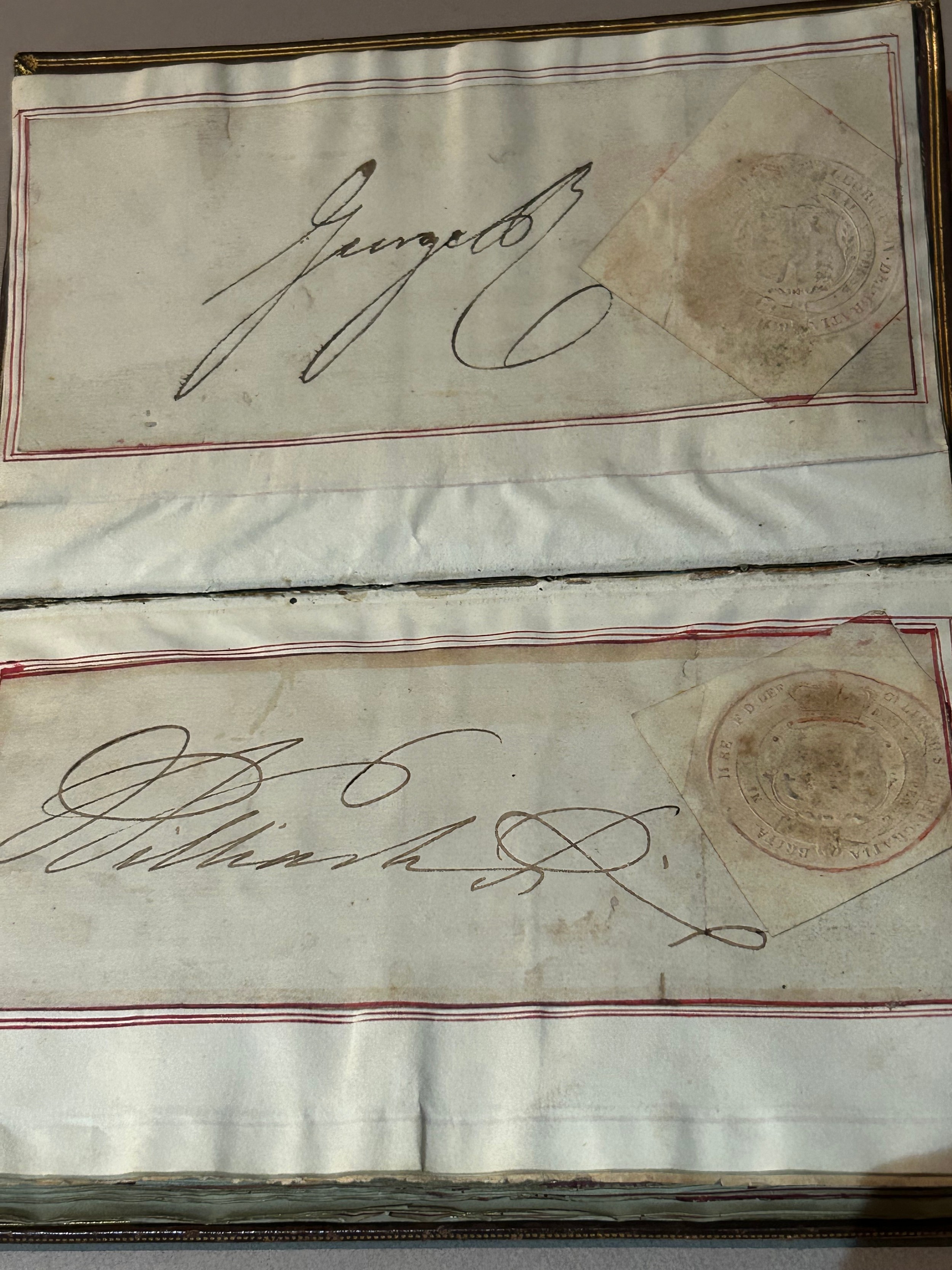 A fascinating and important leather bound autograph album compiled in the mid 19th Century by John Ulyatt, Deputy Governor of Wakefield Prison. Original Autographs:- Royalty including all 19th Century British Monarchs :- George III, Prince Regent, George IV, William IV, Queen Victoria. Politicians including Lord Viscount Palmerston (Prime Minister), Lord Melbourne (Prime Minister), 3rd Earl of Mexborough, Spencer Horatio Walpole, Sir George Grey (Home Secretary), Lord Wharncliffe, Lord Houghton (full letter), Lord Broughton (H Hobhouse friend of Lord Byron) George Cruikshank (caricaturist), Samuel Wilderspin (founded infant schools). Bank cheques for Wakefield Bank dated 1802 (the bank failed in 1825), Signatures of Prison Governors of Wakefield, Durham, Beverley, Southwell, Leeds, York Castle. Signatures of the turnkeys of Wakefield old Prison prior to 1840. A Mulready 1 Penny postal sheet circa 1840