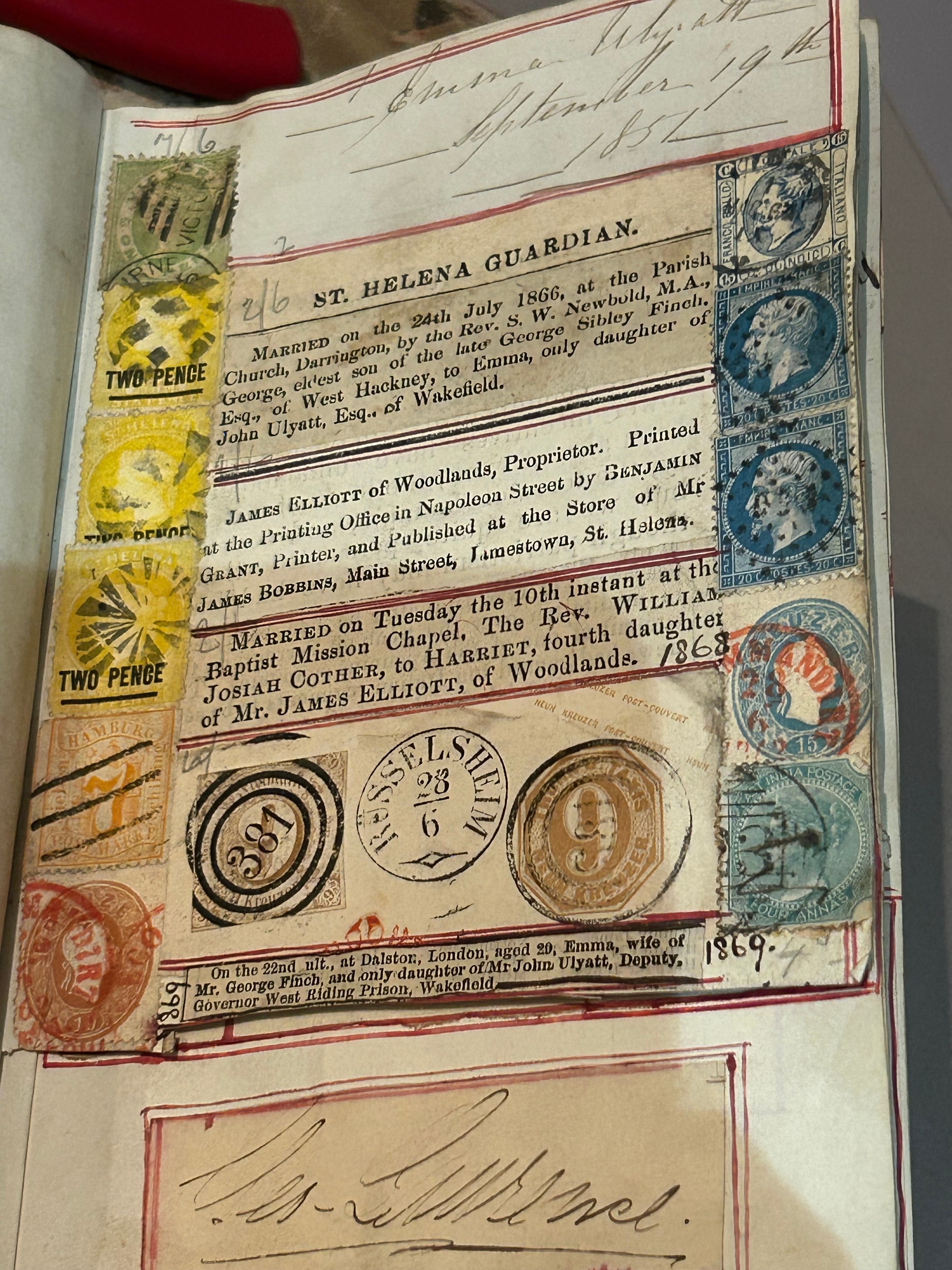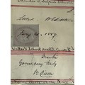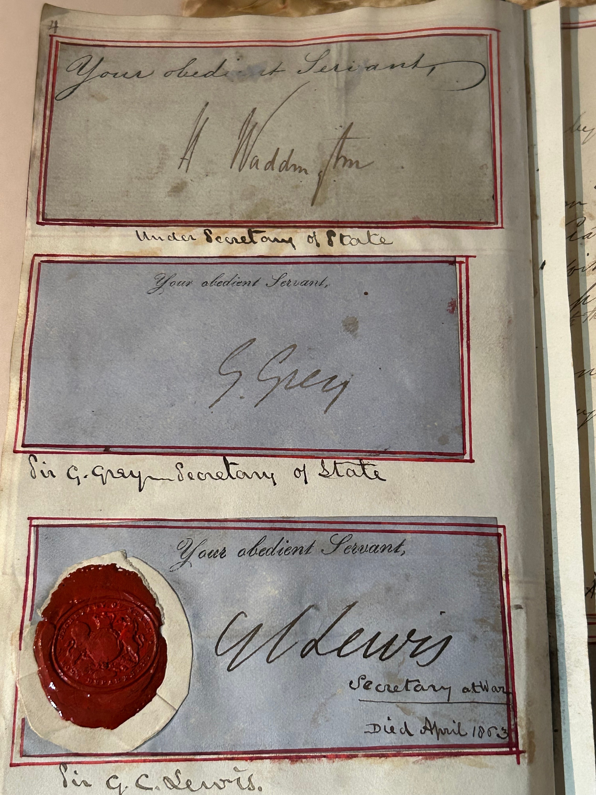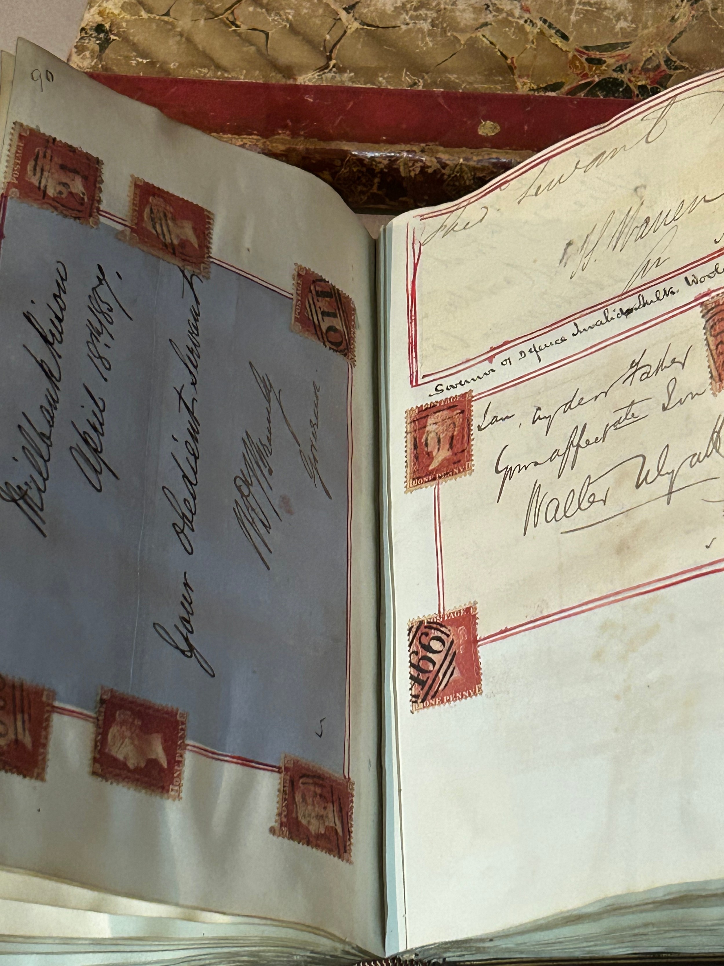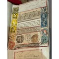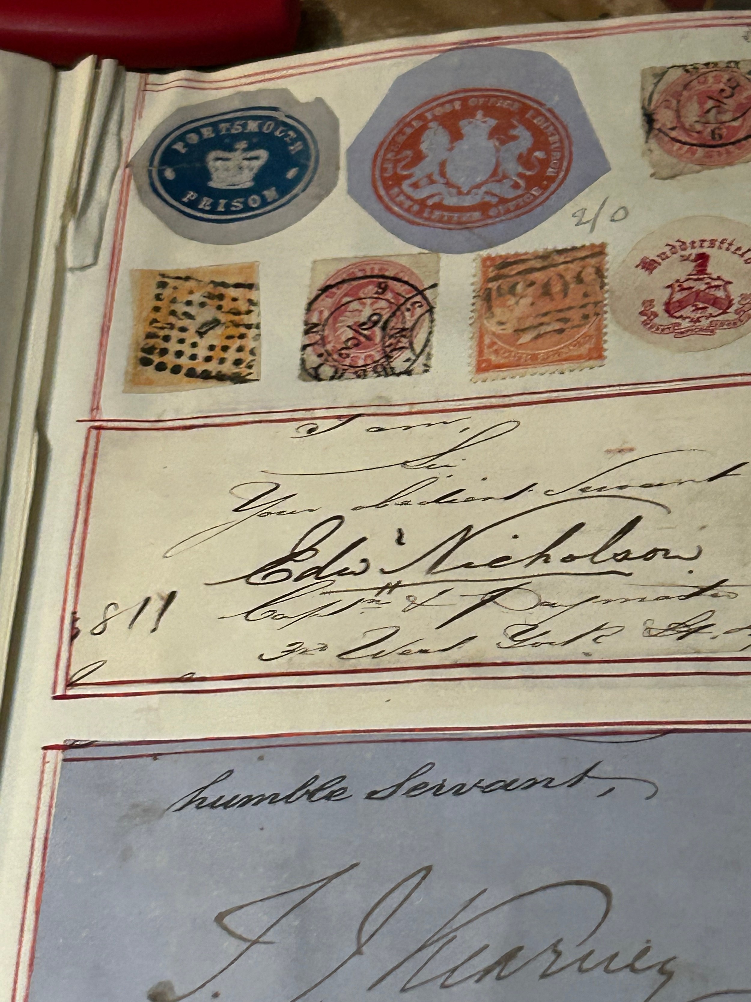 A fascinating and important leather bound autograph album compiled in the mid 19th Century by John Ulyatt, Deputy Governor of Wakefield Prison. Original Autographs:- Royalty including all 19th Century British Monarchs :- George III, Prince Regent, George IV, William IV, Queen Victoria. Politicians including Lord Viscount Palmerston (Prime Minister), Lord Melbourne (Prime Minister), 3rd Earl of Mexborough, Spencer Horatio Walpole, Sir George Grey (Home Secretary), Lord Wharncliffe, Lord Houghton (full letter), Lord Broughton (H Hobhouse friend of Lord Byron) George Cruikshank (caricaturist), Samuel Wilderspin (founded infant schools). Bank cheques for Wakefield Bank dated 1802 (the bank failed in 1825), Signatures of Prison Governors of Wakefield, Durham, Beverley, Southwell, Leeds, York Castle. Signatures of the turnkeys of Wakefield old Prison prior to 1840. A Mulready 1 Penny postal sheet circa 1840