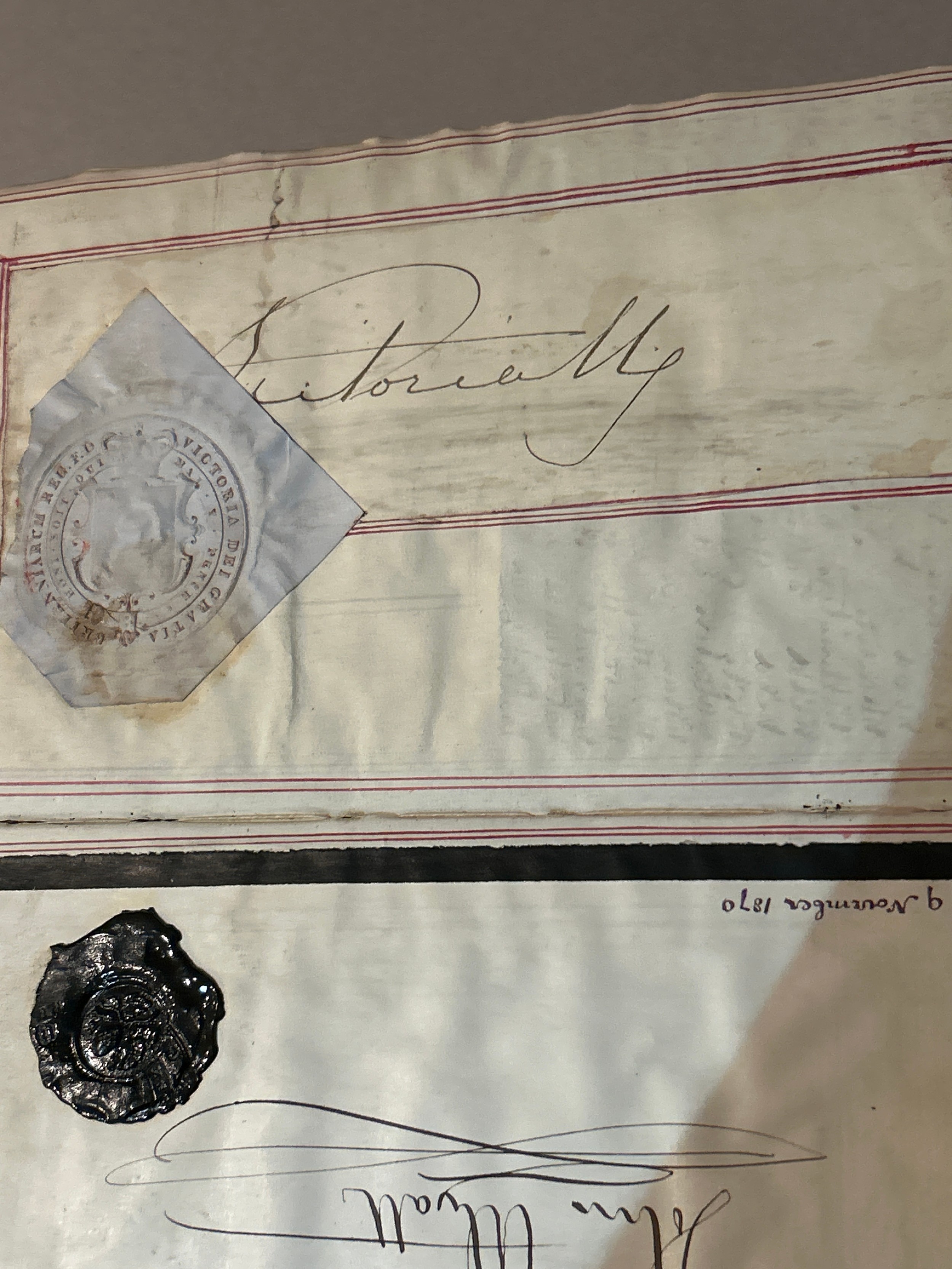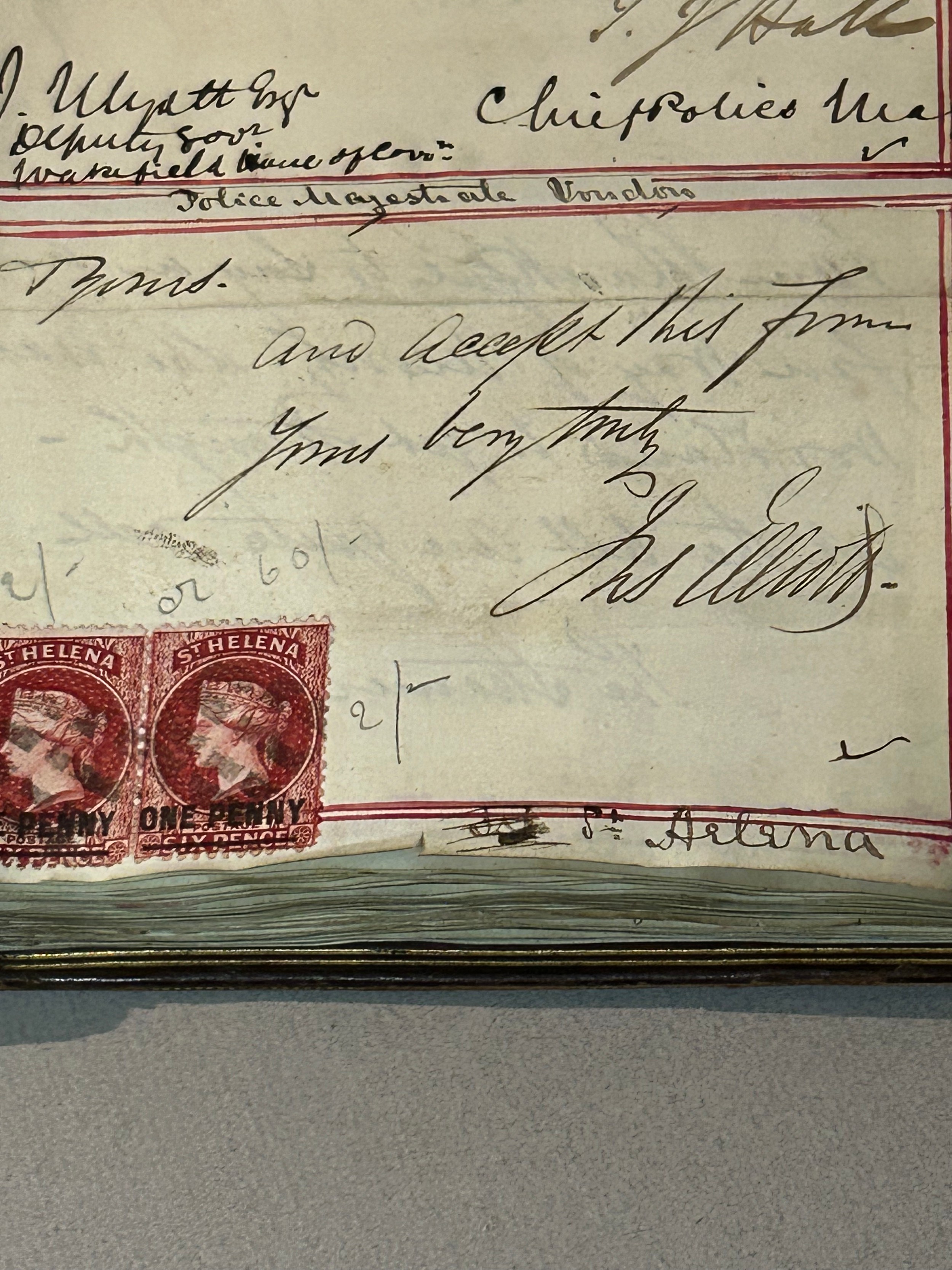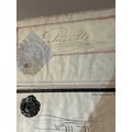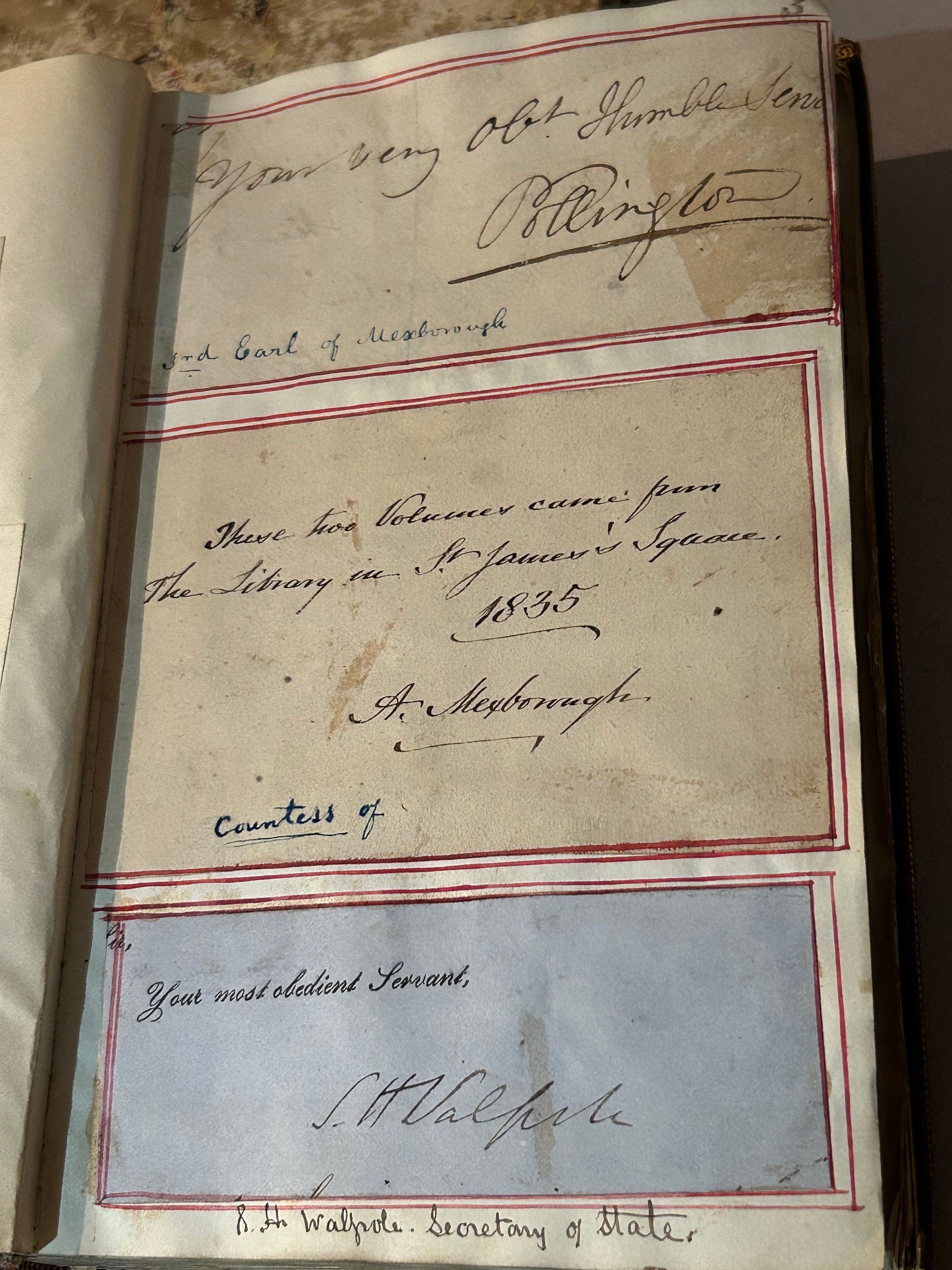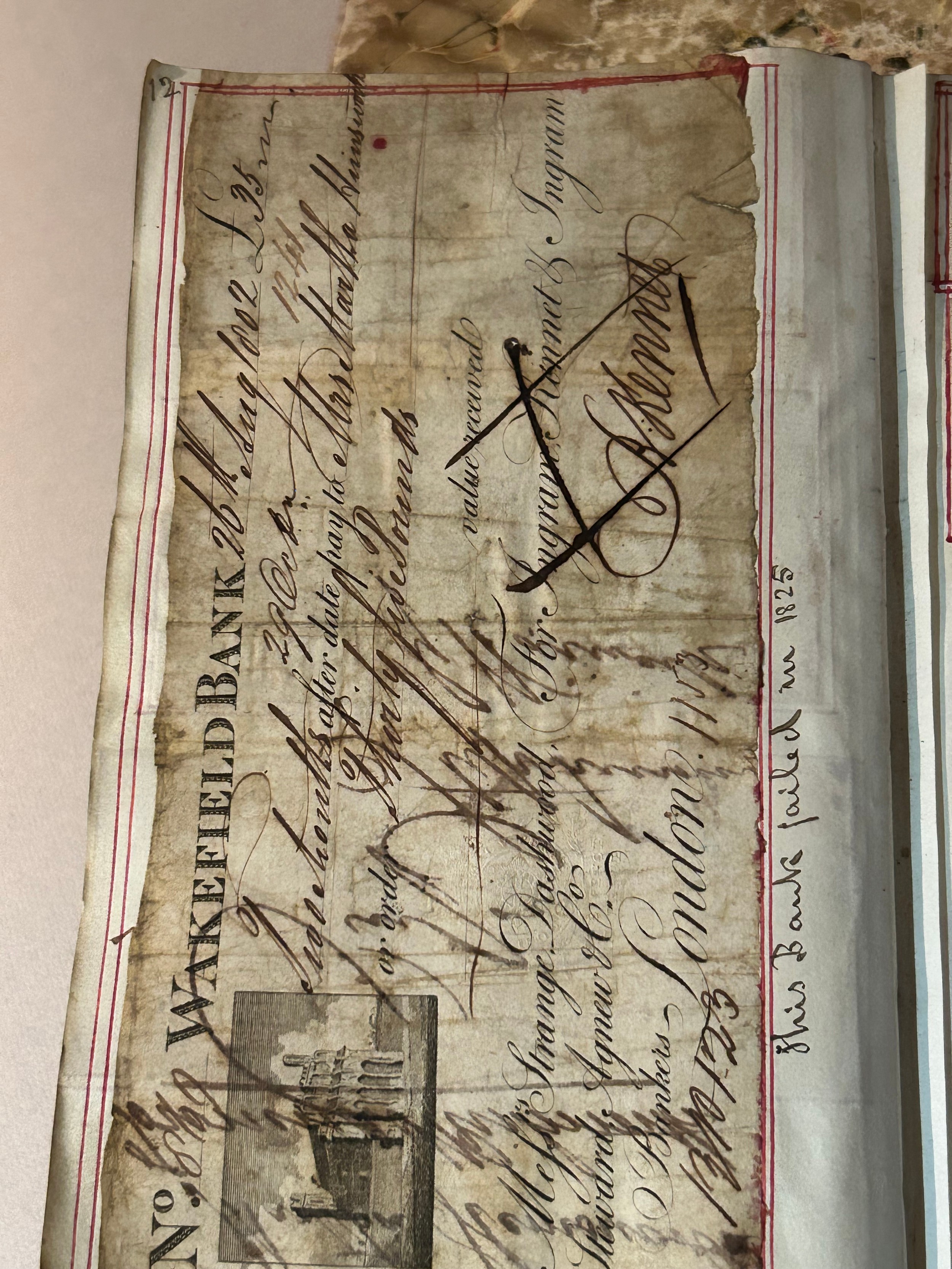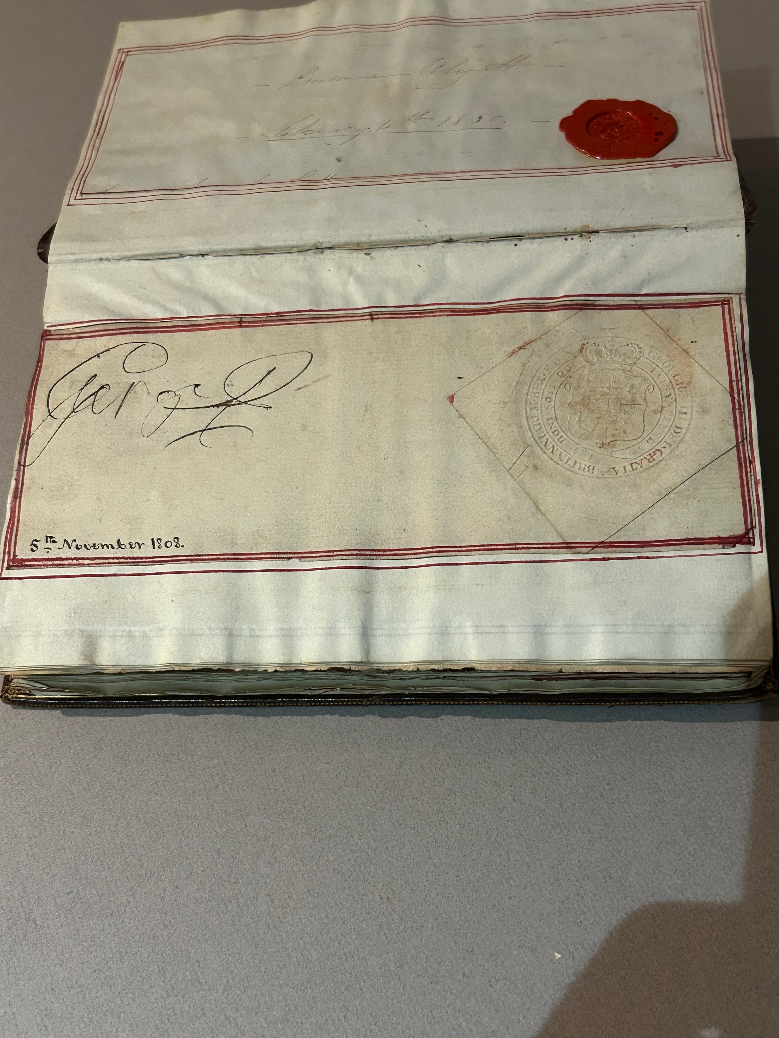 A fascinating and important leather bound autograph album compiled in the mid 19th Century by John Ulyatt, Deputy Governor of Wakefield Prison. Original Autographs:- Royalty including all 19th Century British Monarchs :- George III, Prince Regent, George IV, William IV, Queen Victoria. Politicians including Lord Viscount Palmerston (Prime Minister), Lord Melbourne (Prime Minister), 3rd Earl of Mexborough, Spencer Horatio Walpole, Sir George Grey (Home Secretary), Lord Wharncliffe, Lord Houghton (full letter), Lord Broughton (H Hobhouse friend of Lord Byron) George Cruikshank (caricaturist), Samuel Wilderspin (founded infant schools). Bank cheques for Wakefield Bank dated 1802 (the bank failed in 1825), Signatures of Prison Governors of Wakefield, Durham, Beverley, Southwell, Leeds, York Castle. Signatures of the turnkeys of Wakefield old Prison prior to 1840. A Mulready 1 Penny postal sheet circa 1840