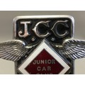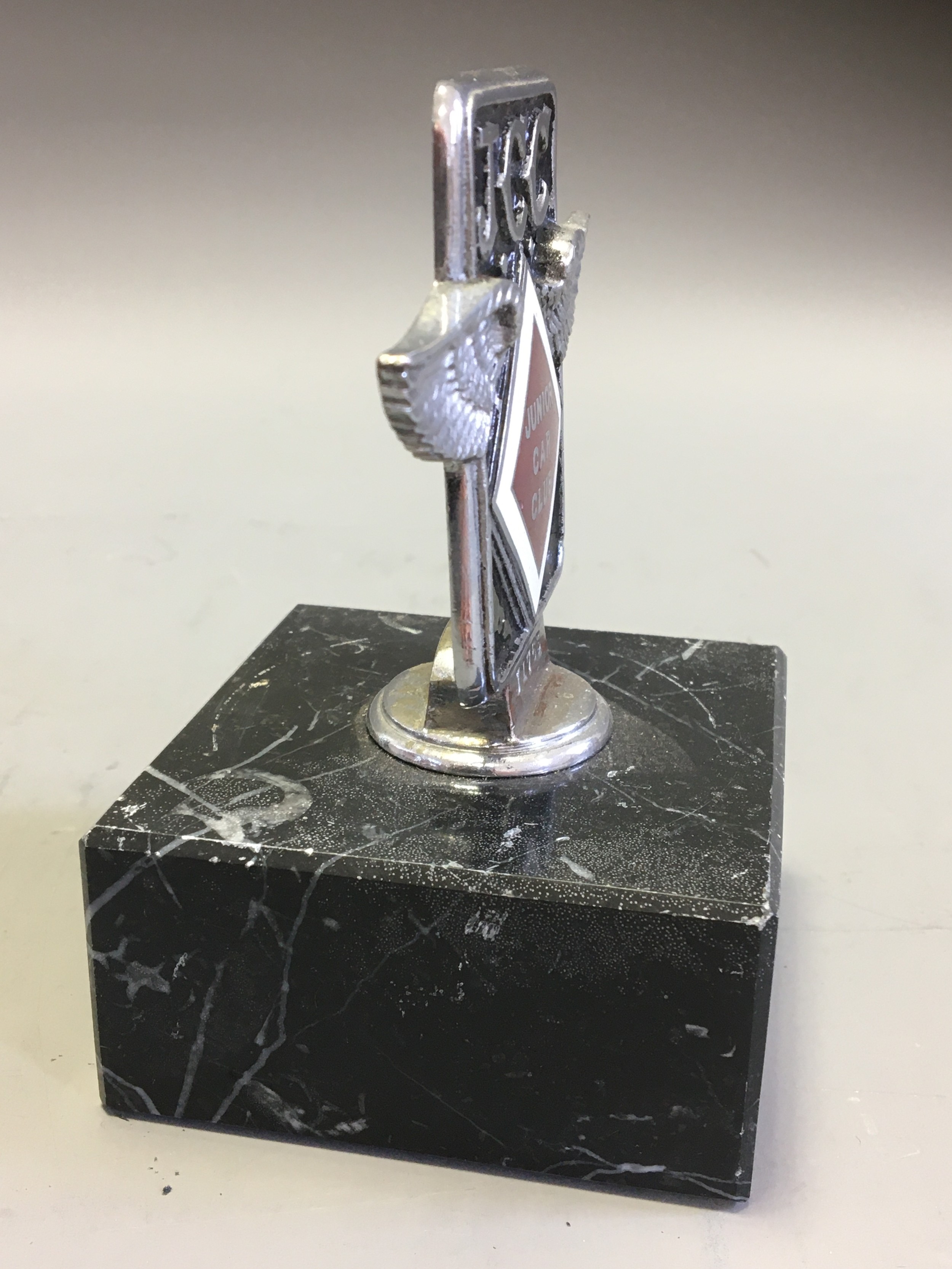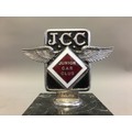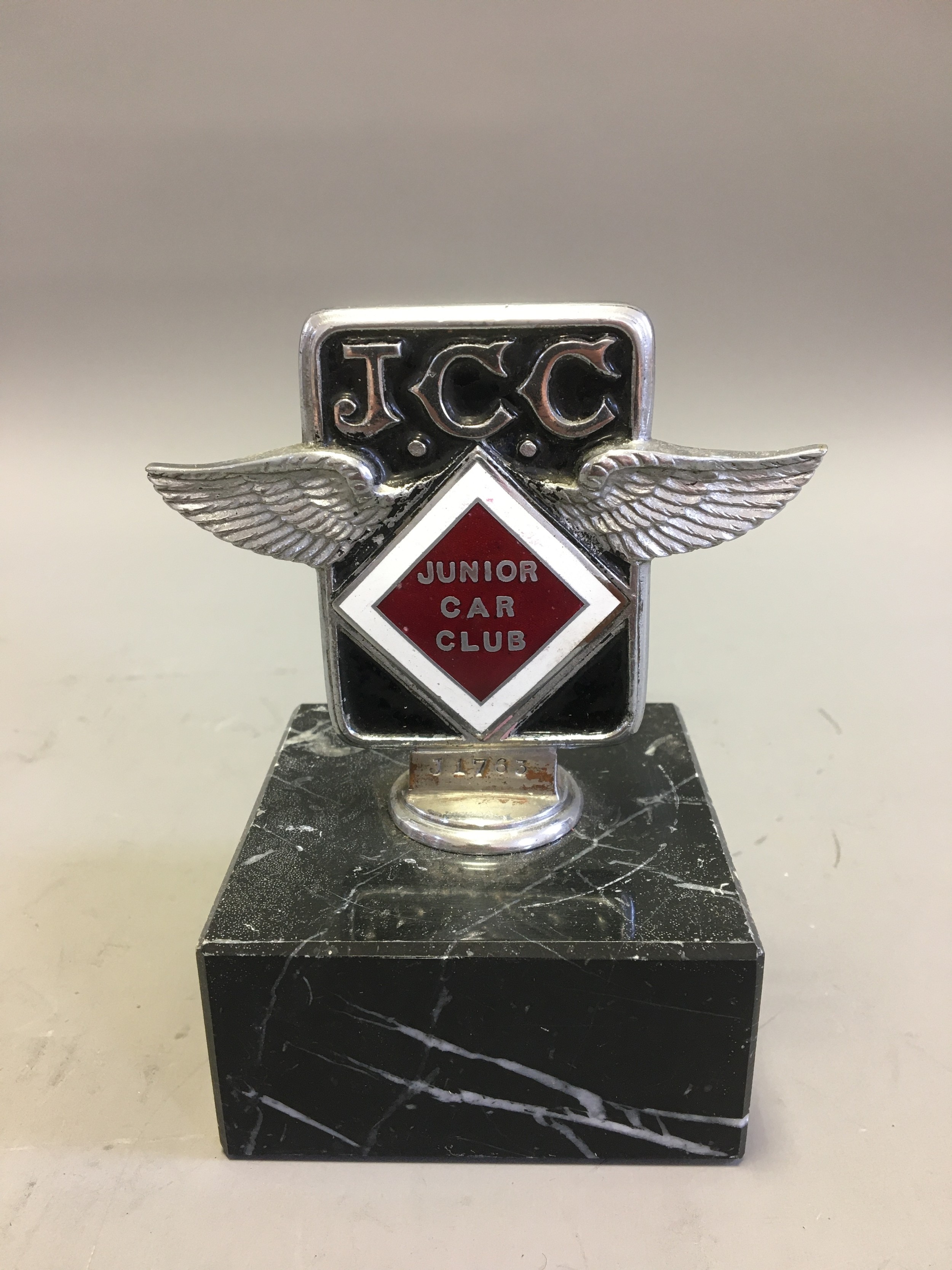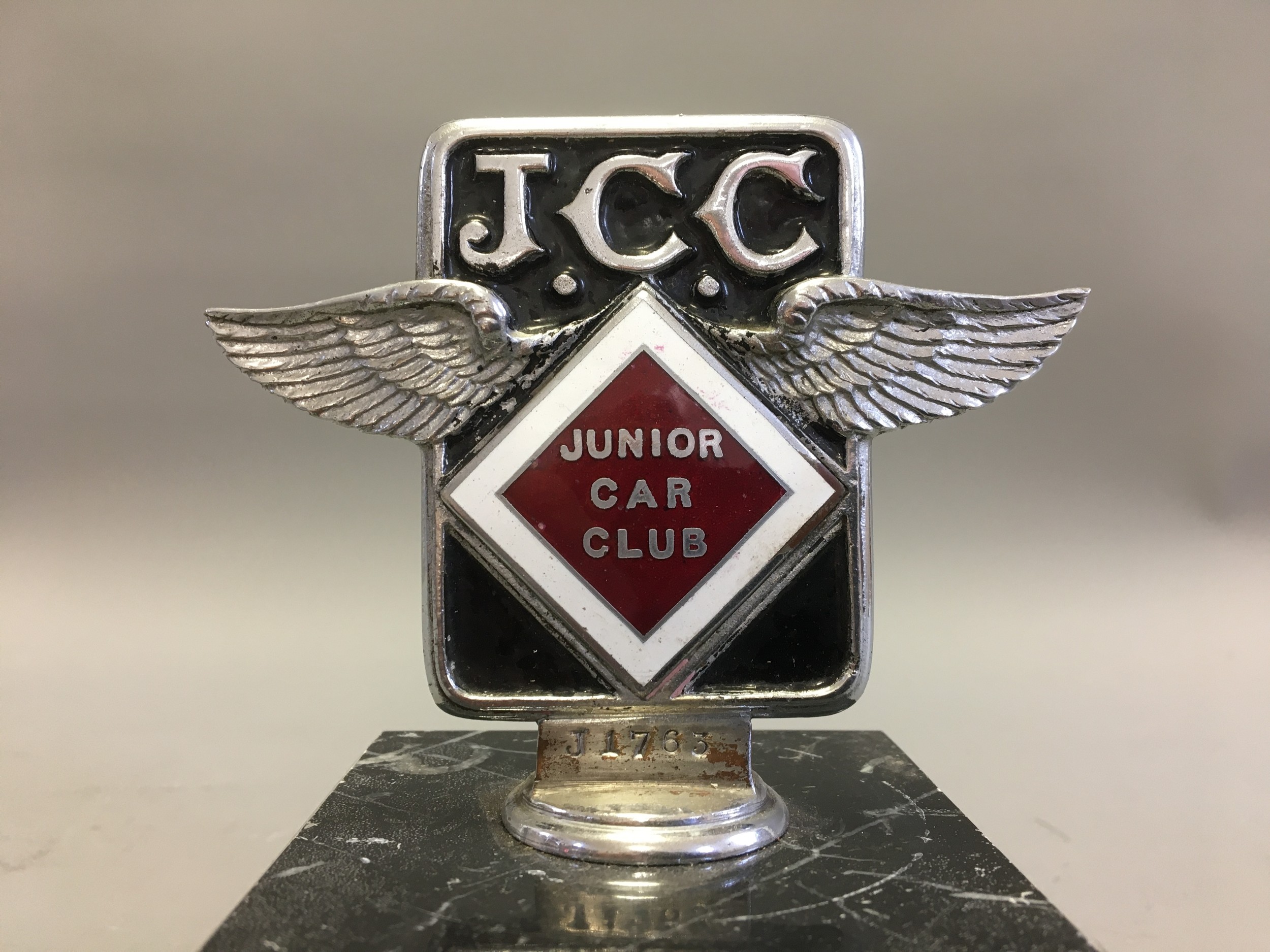 Circa 1930 J.C.C Junior Car Club Ser No J1763 Elkington & Co Chrome and Enamel Car Badge/Mascot. An early pre-war member's car badge; enamel on chromed brass with diamond format badge motif to centre. Mounted on a Marble Base