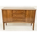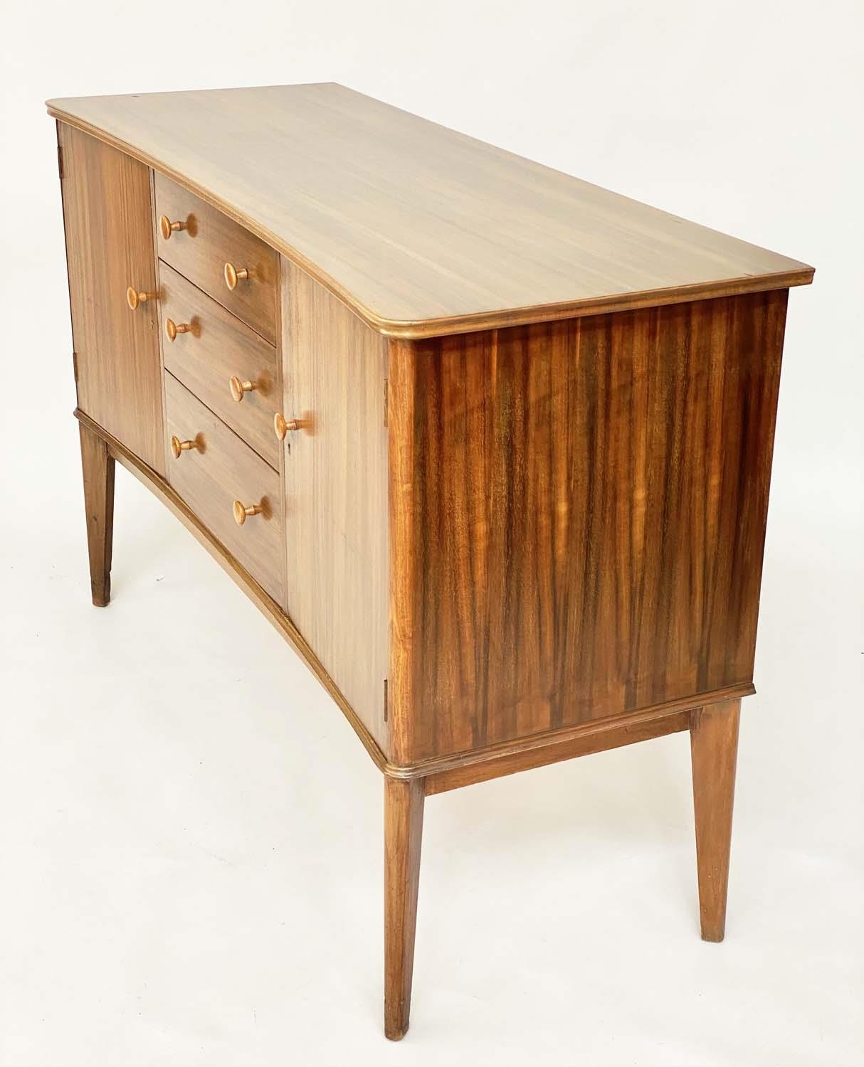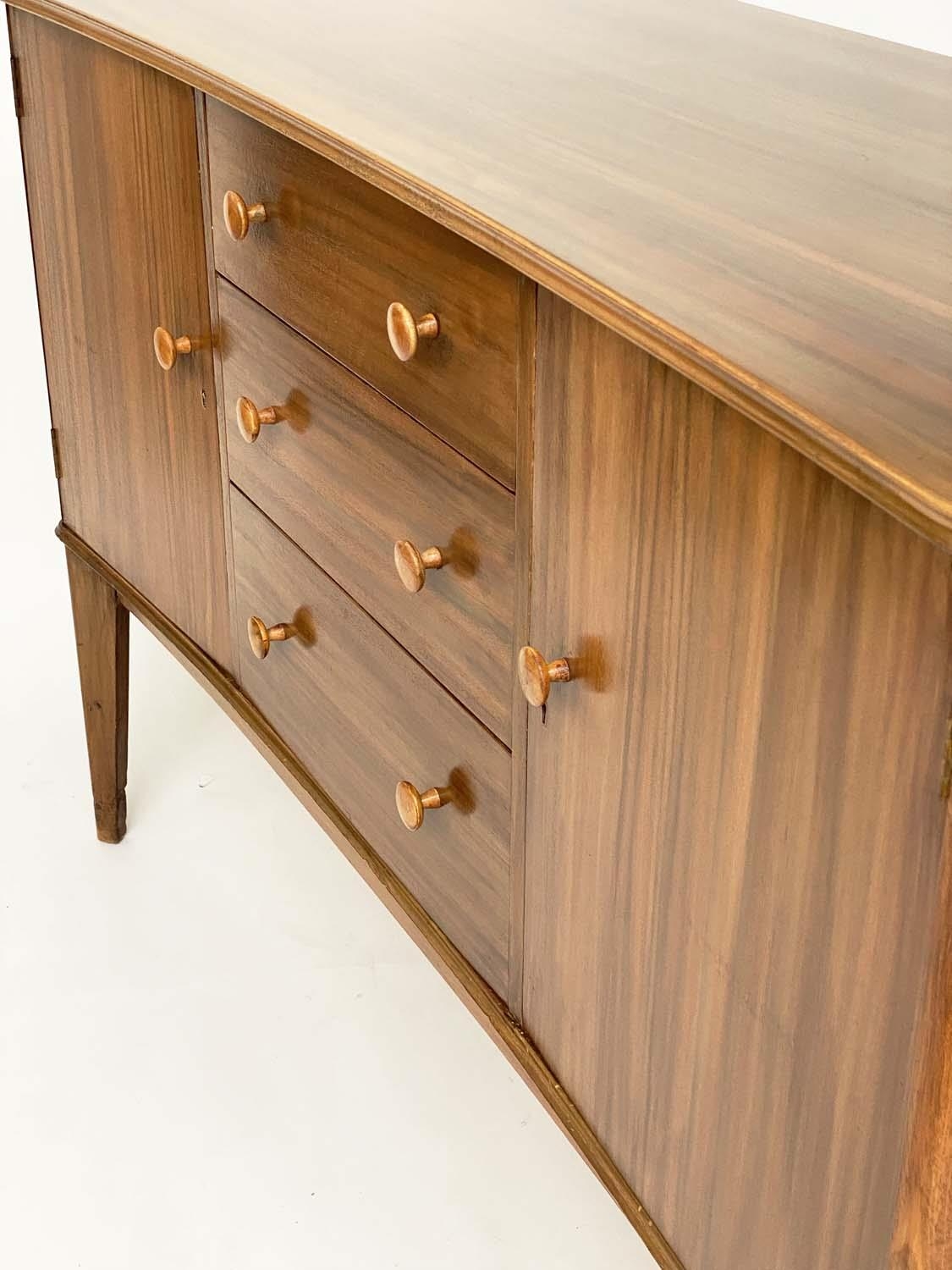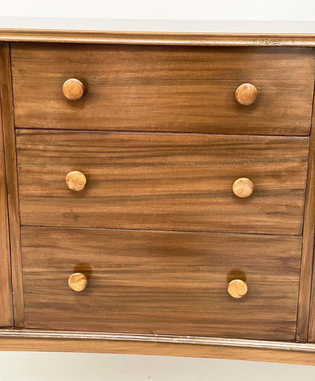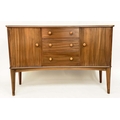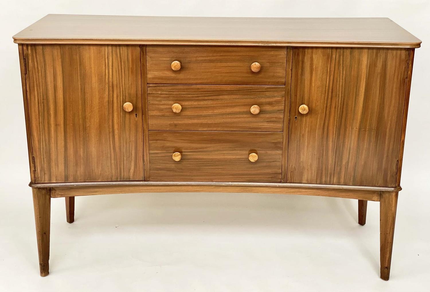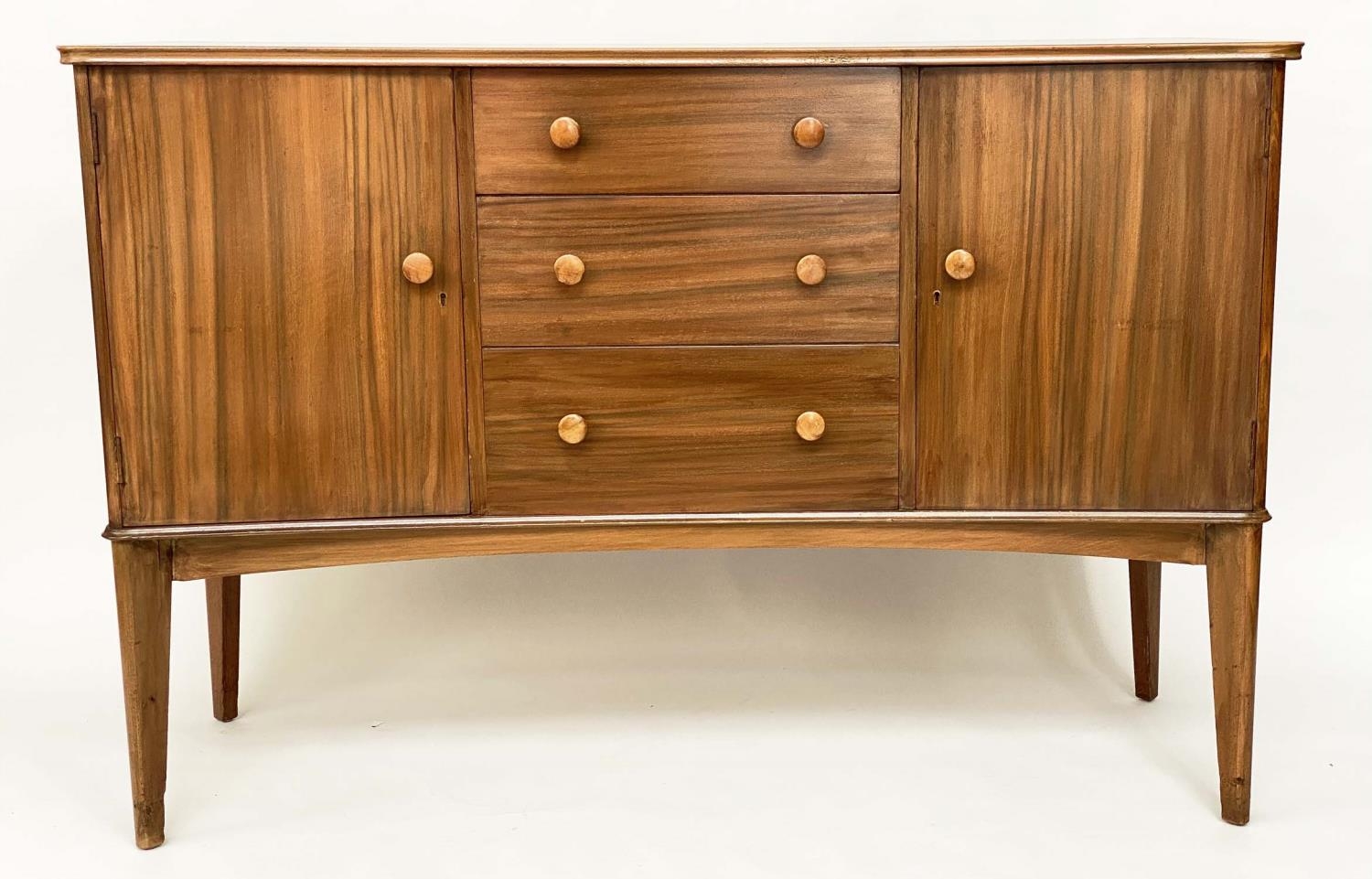 SIDEBOARD, 1970s Indian Laurel, with three drawers flanked by cupboards on splayed supports, 137cm W x 91cm H x 52cm D.