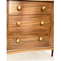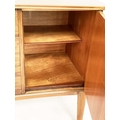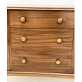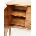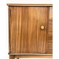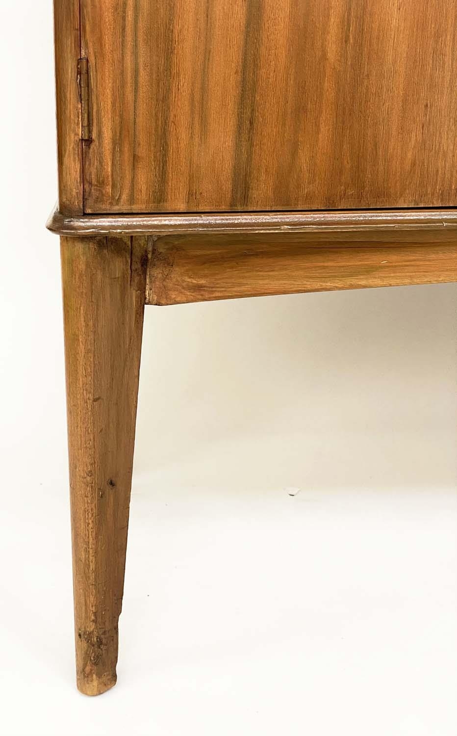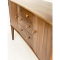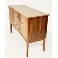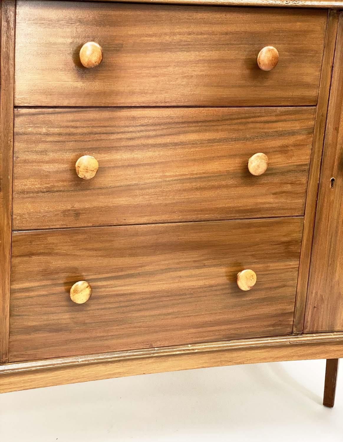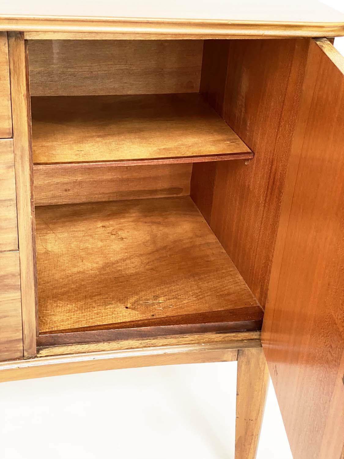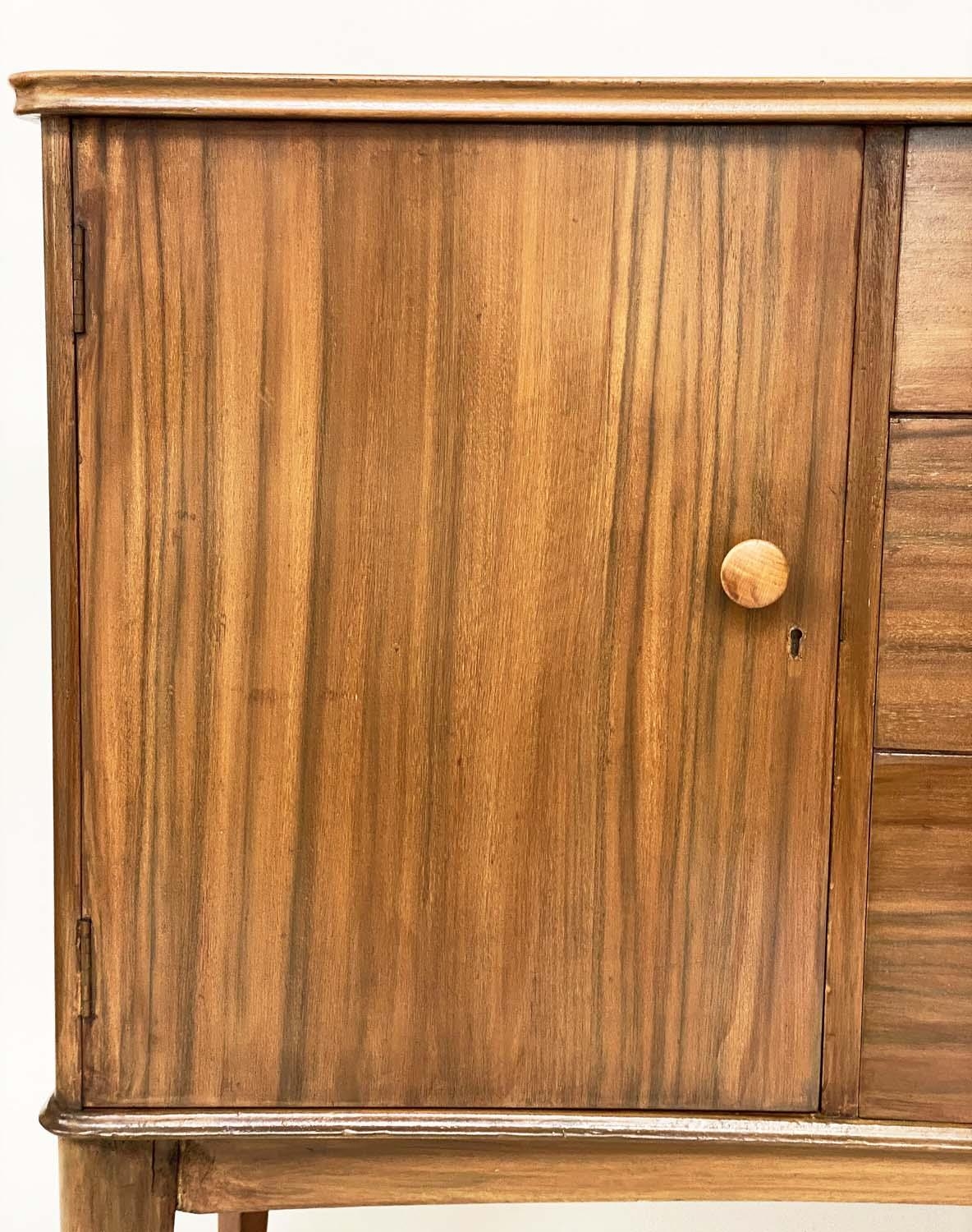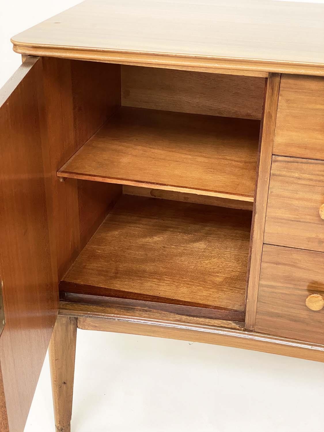 SIDEBOARD, 1970s Indian Laurel, with three drawers flanked by cupboards on splayed supports, 137cm W x 91cm H x 52cm D.
