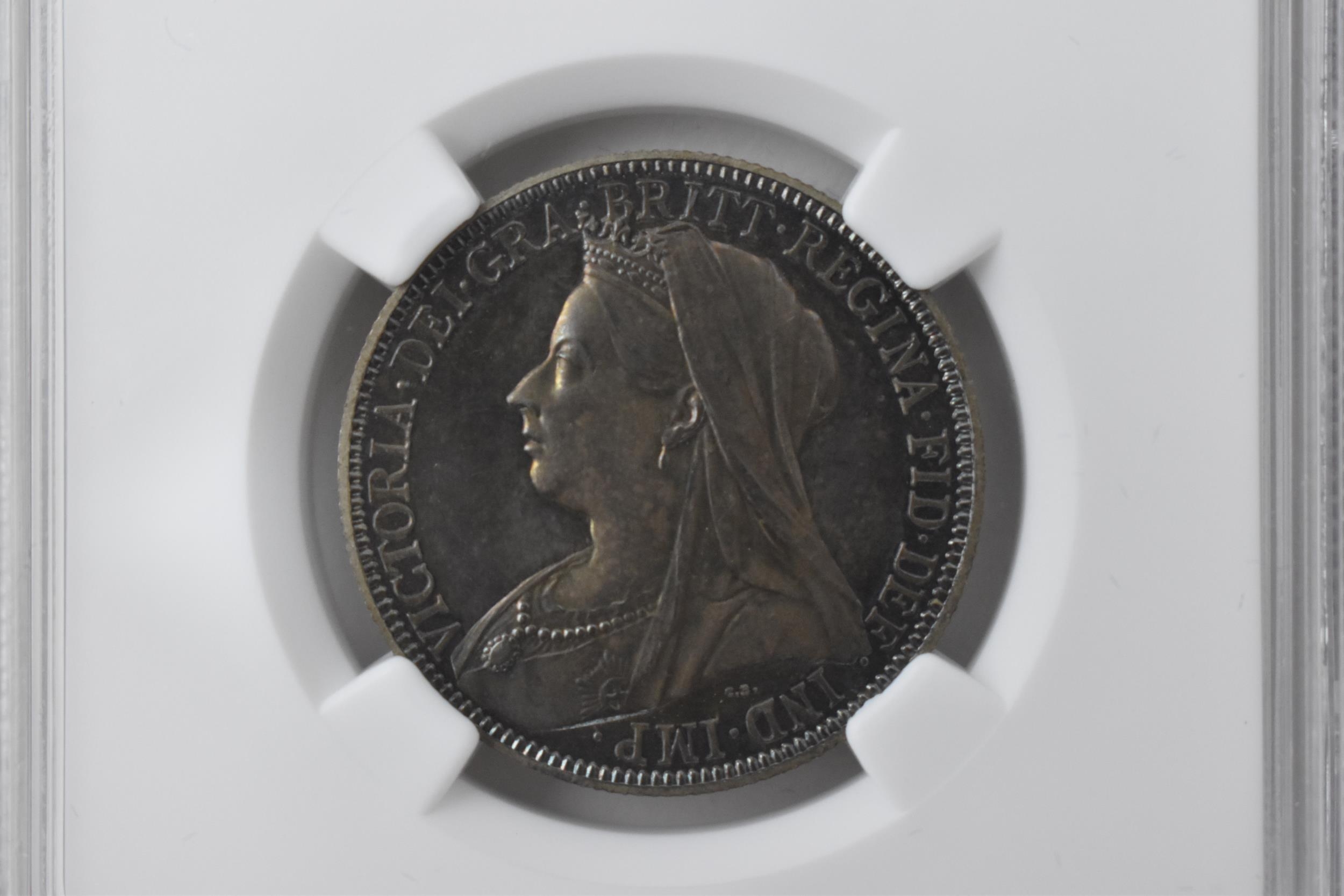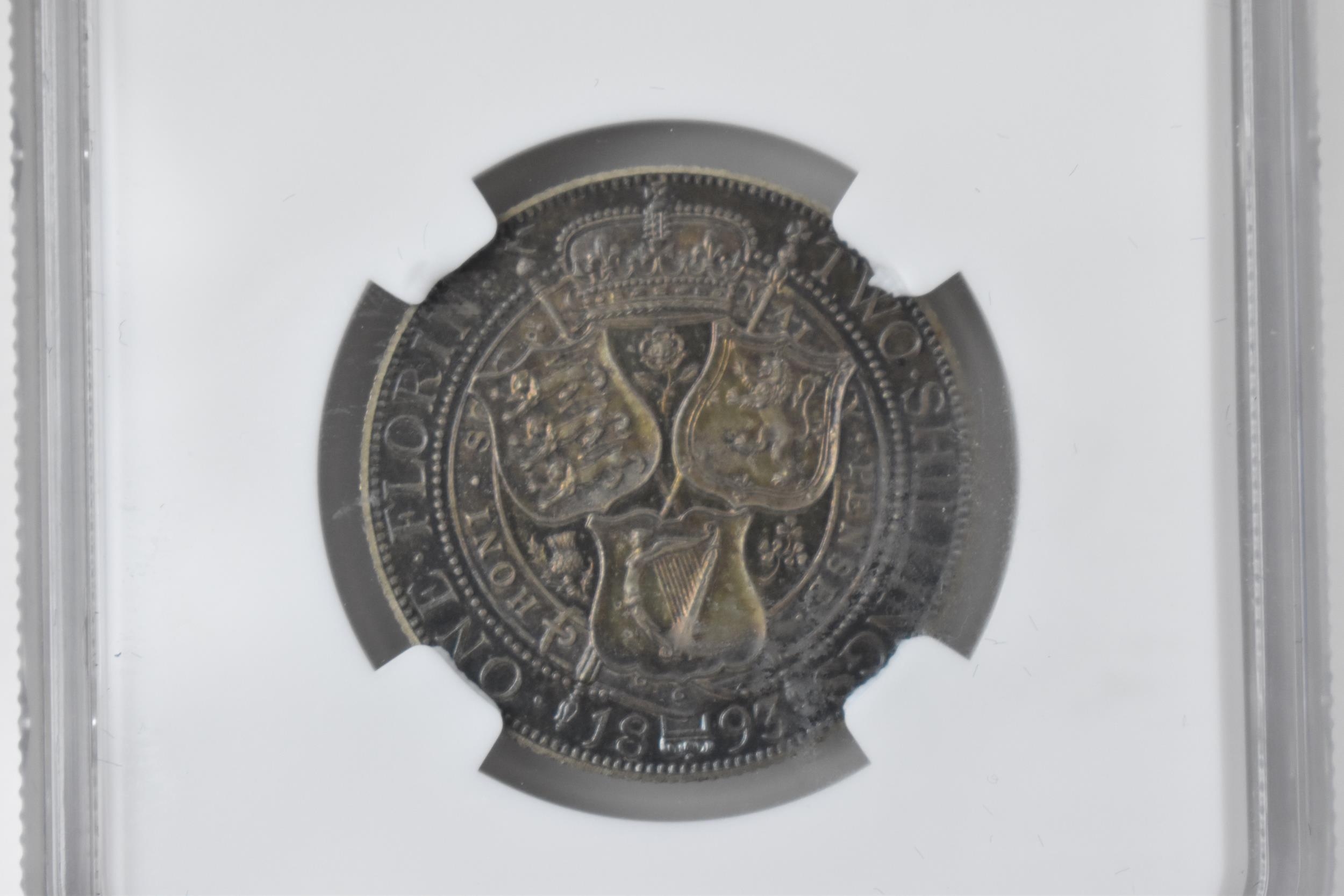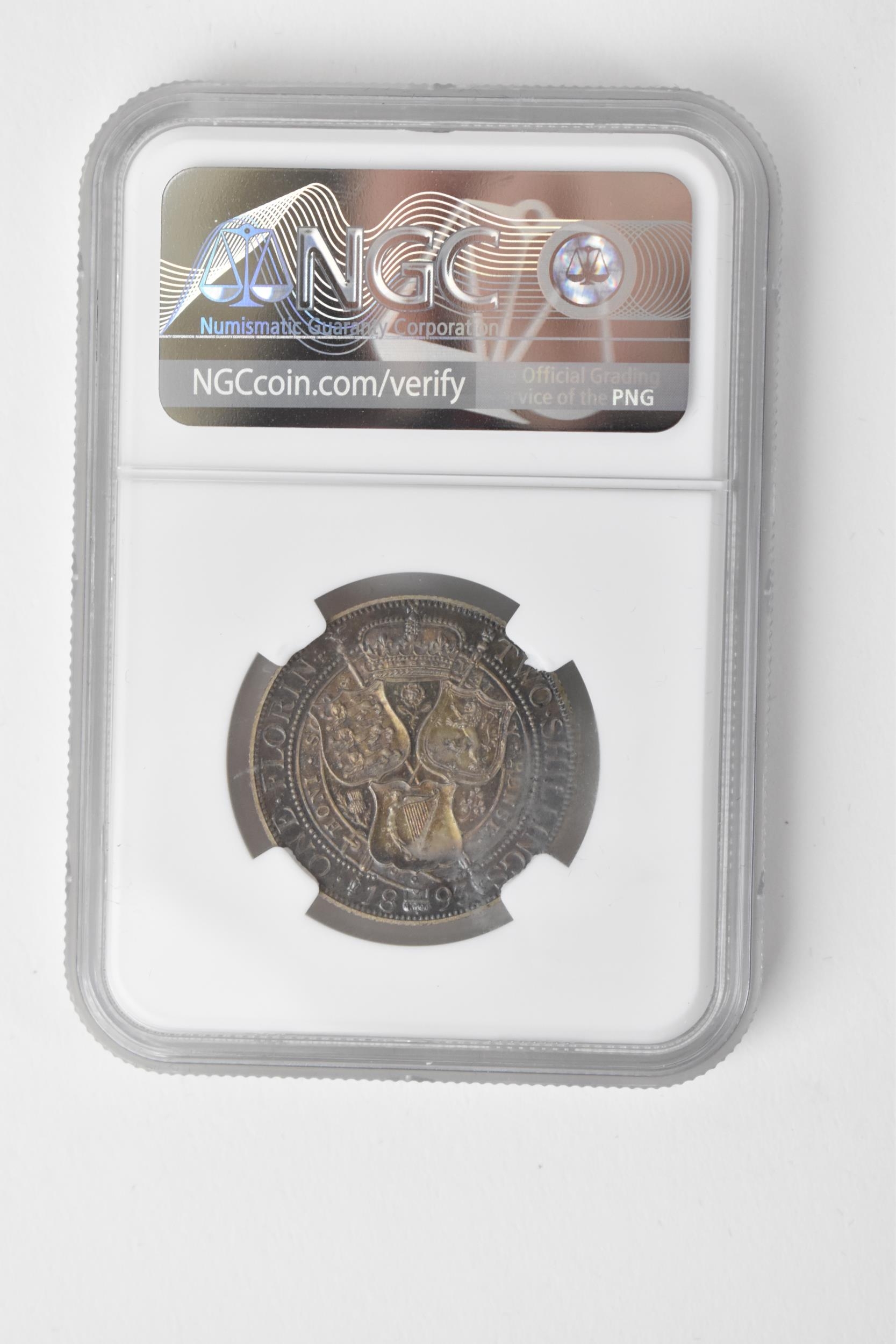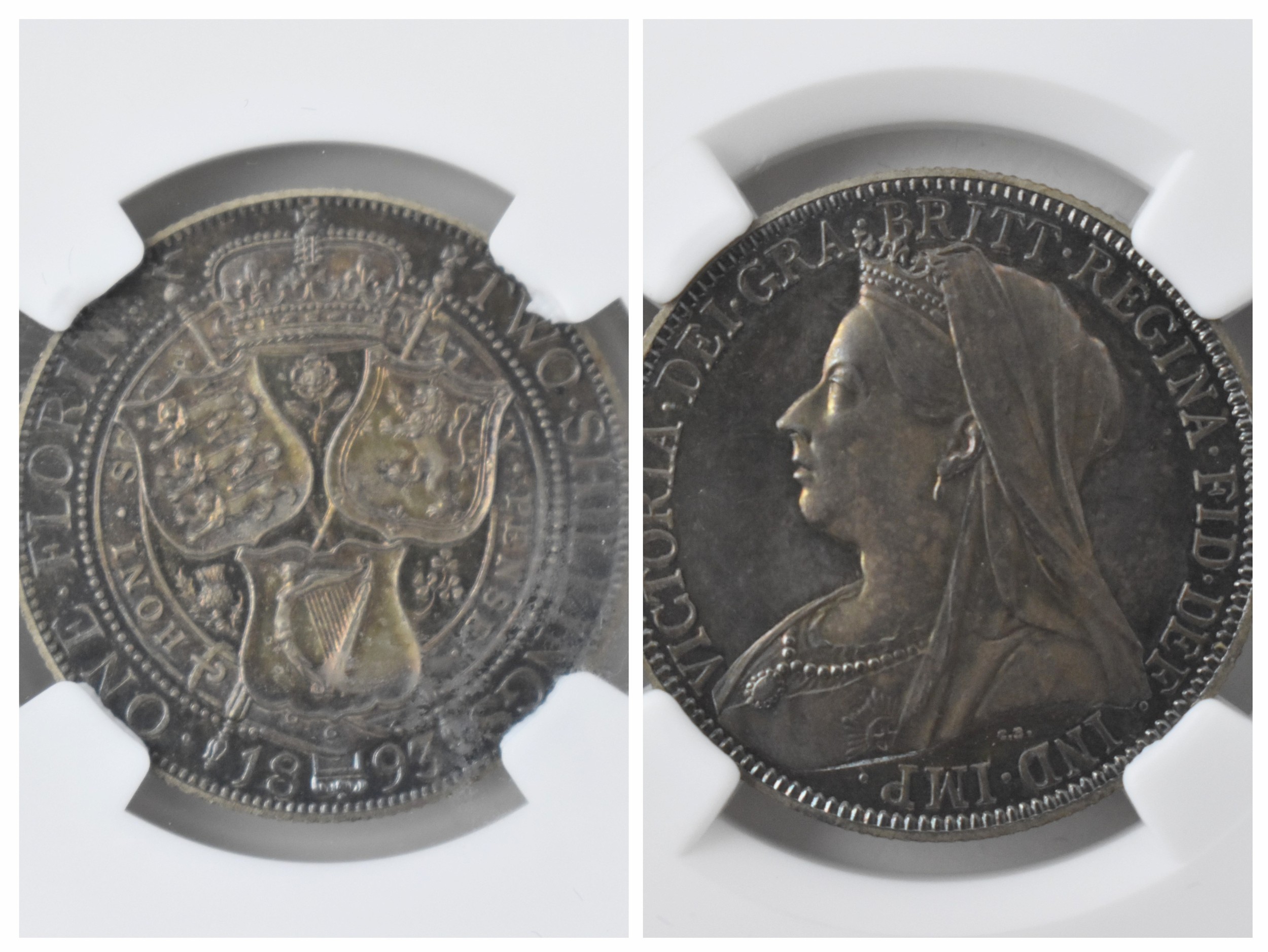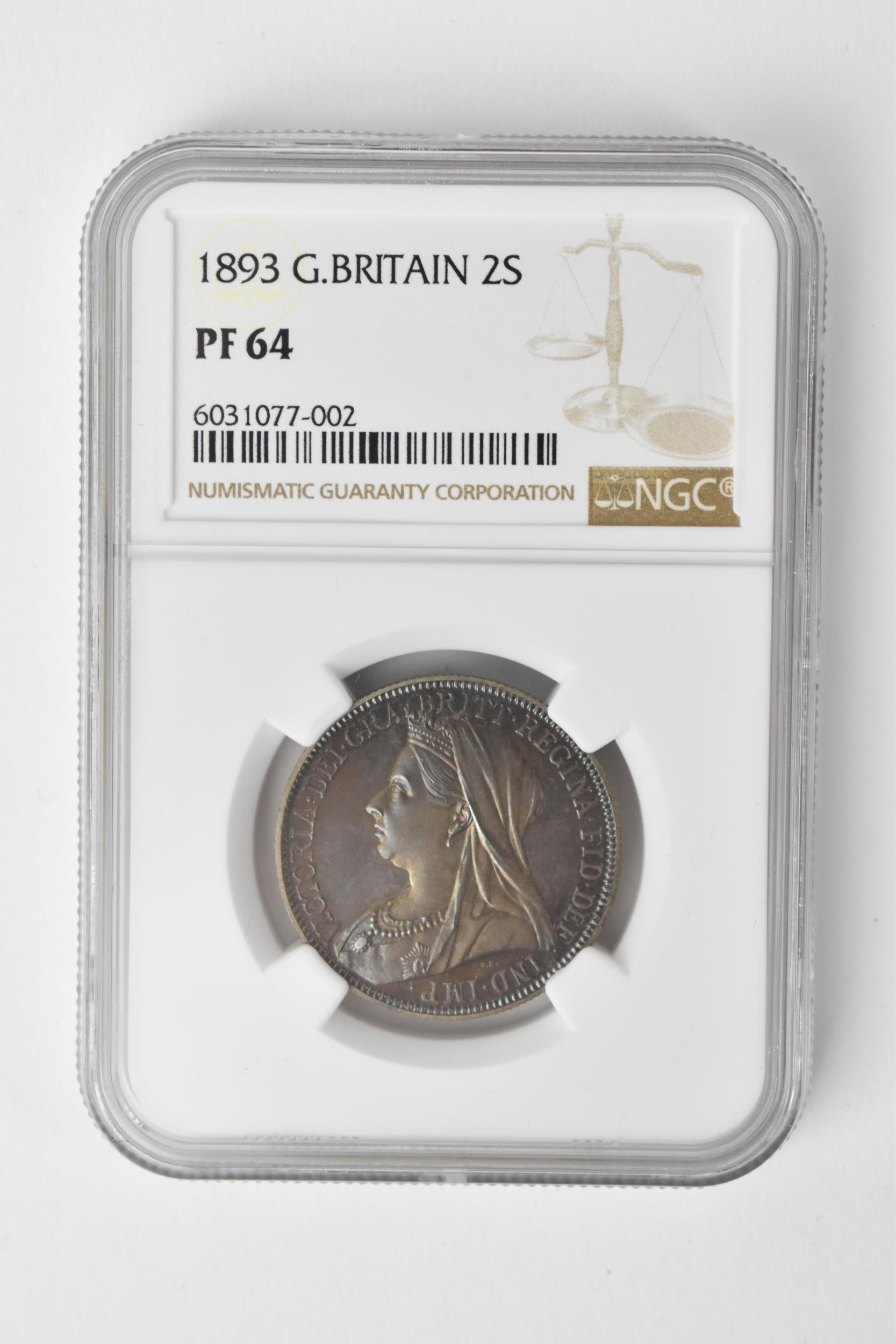 United Kingdom - Victoria (1837-1901) One Florin, dated 1893, 3rd portrait, crowned and veiled bust, Queen Victoria, left, VICTORIA.DEI.GRA.BRITT.REGINA.FID.DEF.IND.IMP/. crown above shields of England, Scotland and Ireland, with national flowers, ONE FLORIN TWO SHILLING, in secure plastic holder, graded NGC PF 64, certification number 6031077-002