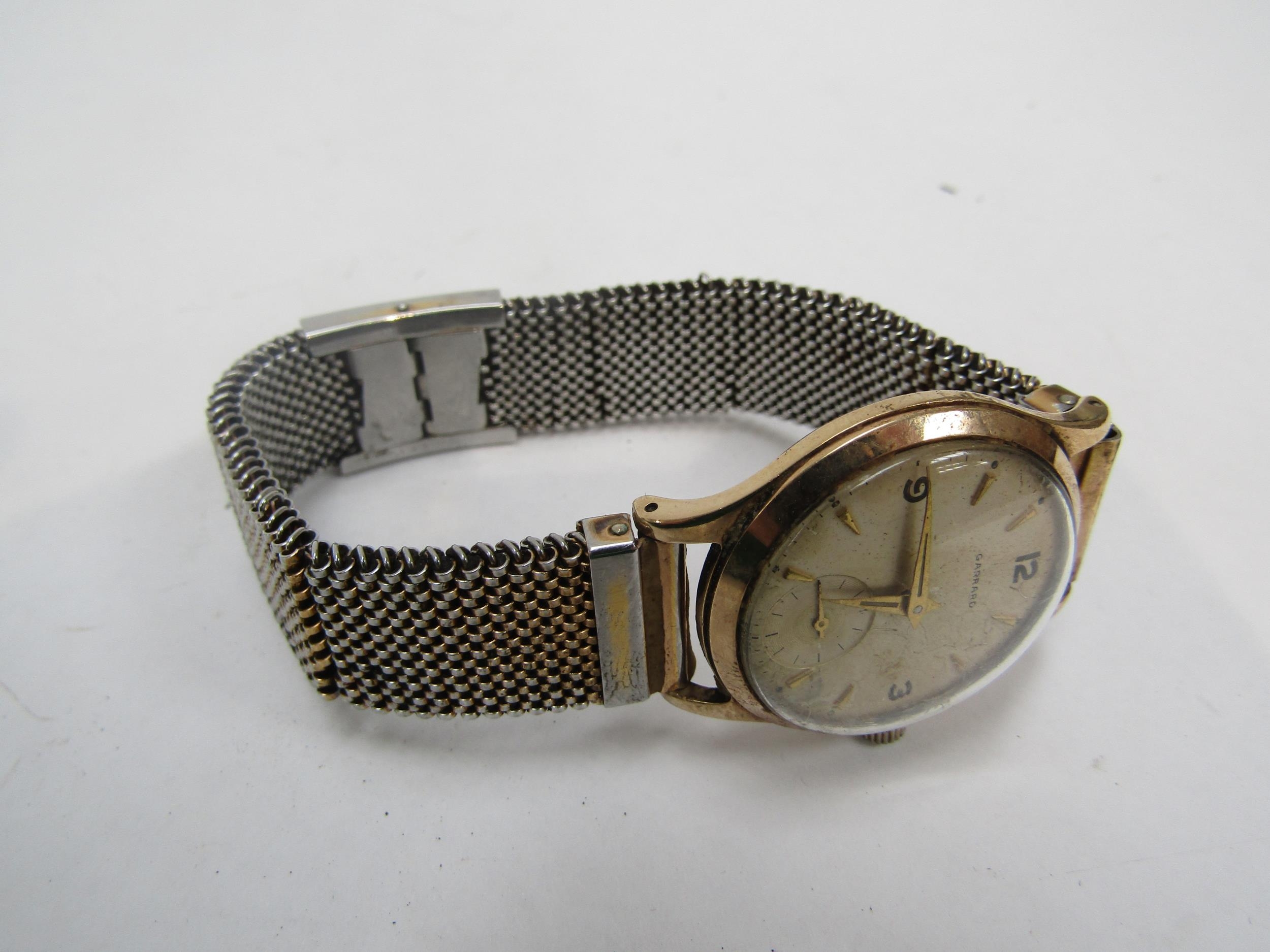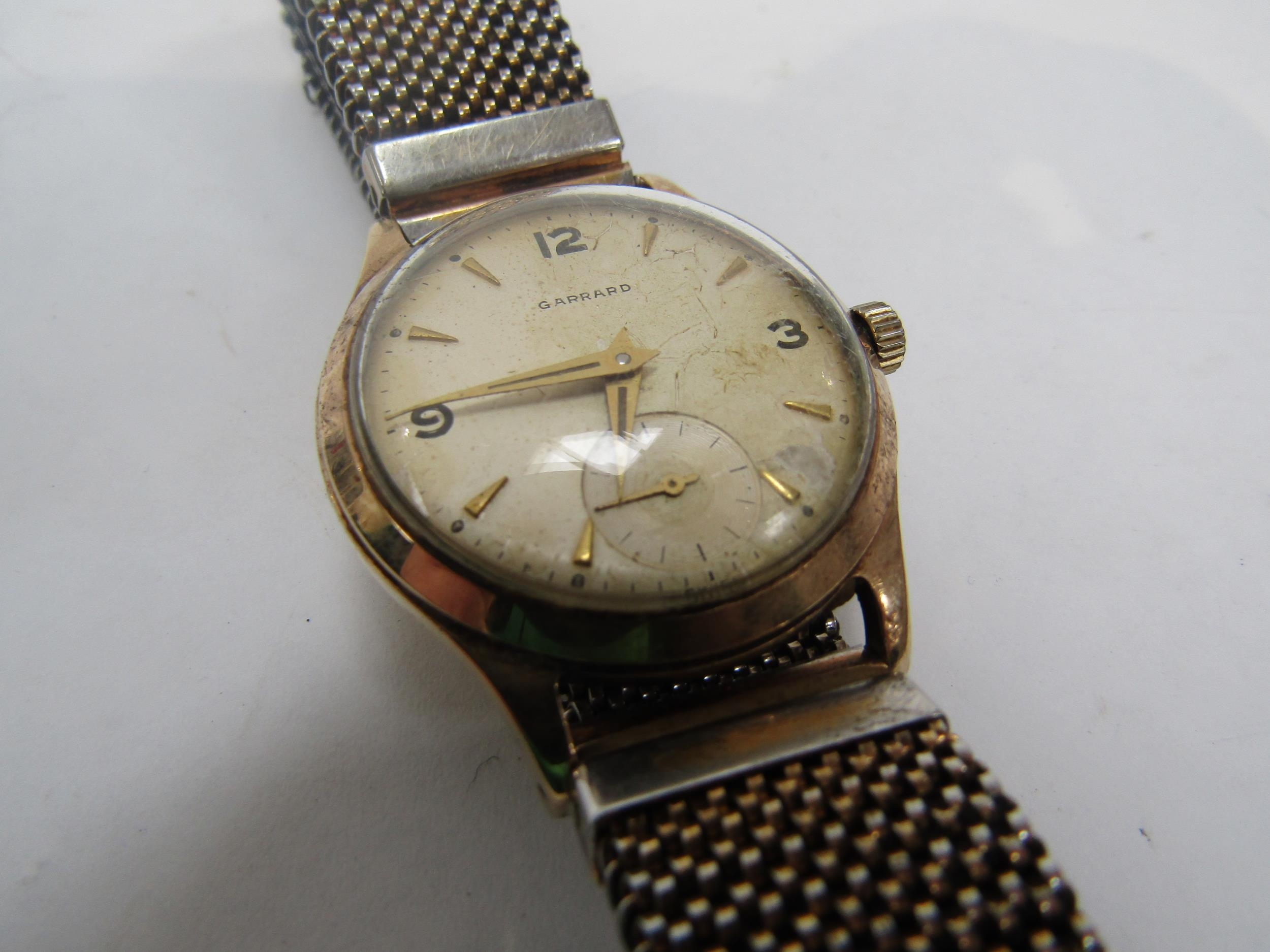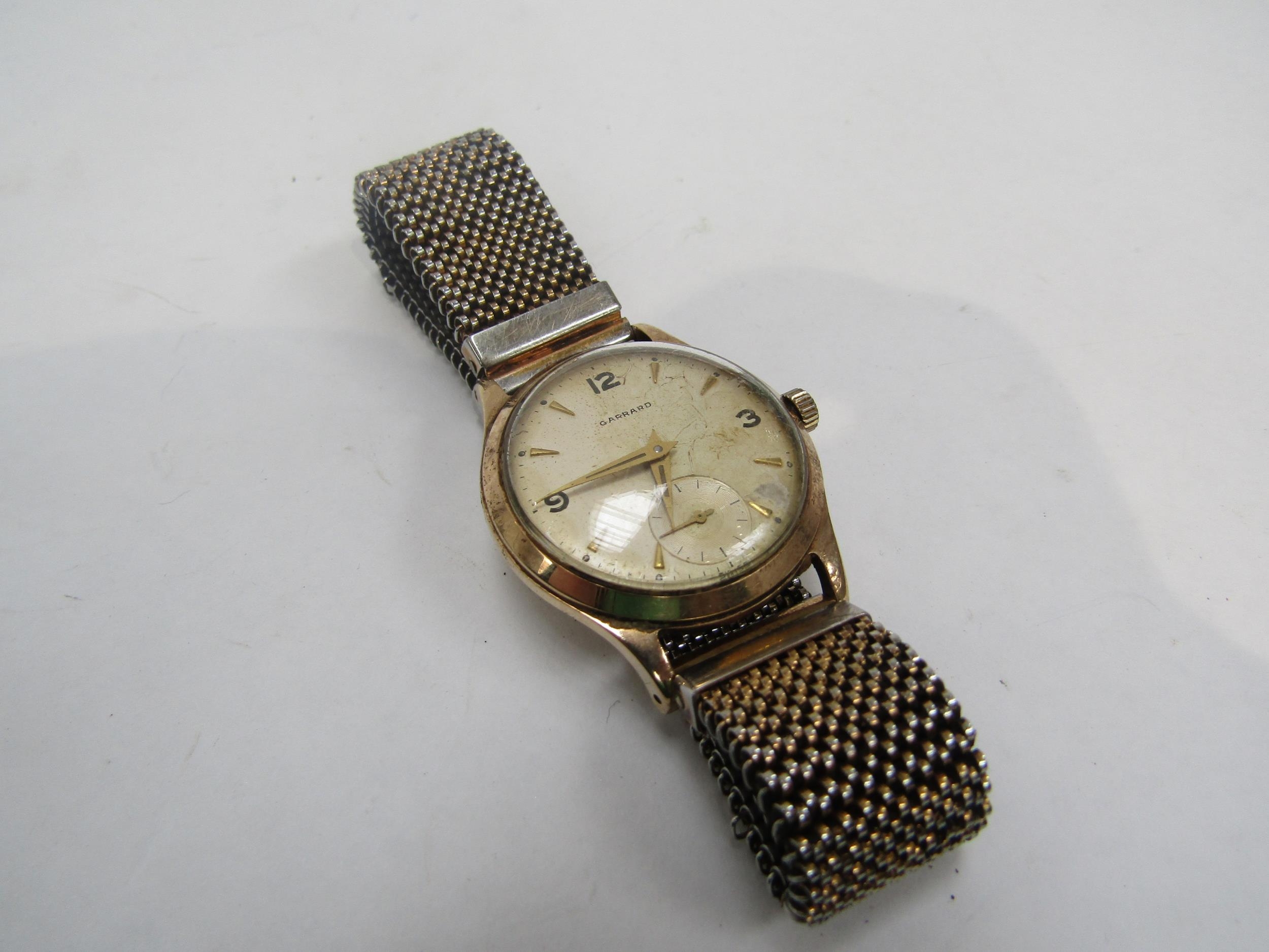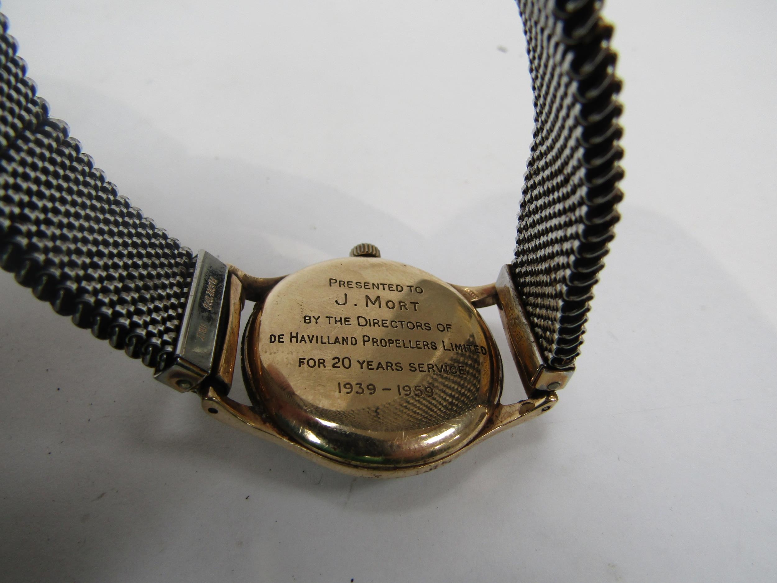 GARRARDS 1950's gents 9ct gold wristwatch with interesting Havilland propeller hands. Inscription to reverse, Garrards box, box a/f (R) £150 CLOCKS AND WATCHES