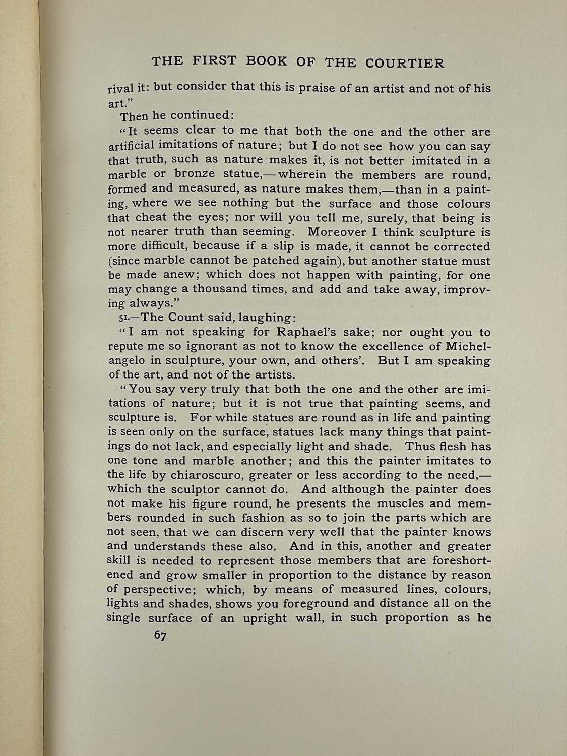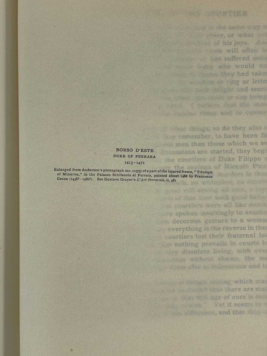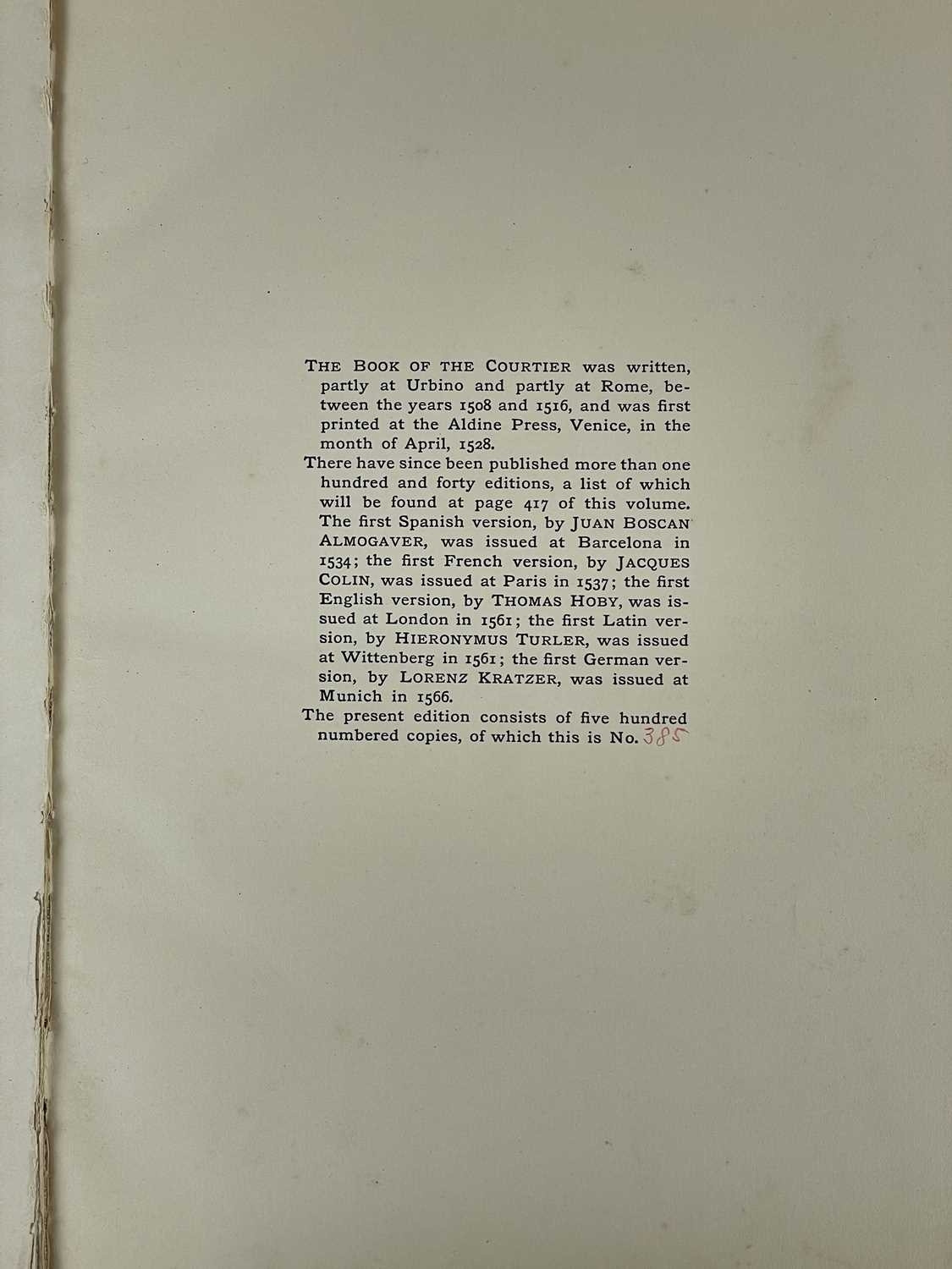 (Limited Edition) Leonard Eckstein Opdyke (translated) The Book of the Courtier by Count Baldesar Castiglione (1528) Number 385 of five hundred, publishers' ivory coloured card cover, gilt tooled device to front board and lettering to spine, ex libris label Courtney Library to front pastedown, first gathering loosening from binding, medal in colour on title page and endpiece, descriptive tissue guards to 73 engraved plates, some very light instances of spotting generally to front or rear leaves, a very good copy indeed, Duckworth & Co, London, Charles Scribner's Sons, New York, with the imprint of The De Vinne Press, 1902. Baldassare Castiglione (1478–1529), a courtier to Charles V, wrote his celebrated dialogue between 1508 and 1516 in Urbino and Rome. Hugely influential, it shaped 16th-century European courtly behaviour and inspired writers such as Shakespeare. This edition was printed by Theodore Low De Vinne (1828–1914), an American printer, typographic scholar, and co-founder of the Grolier Club (est. 1884).