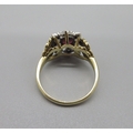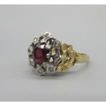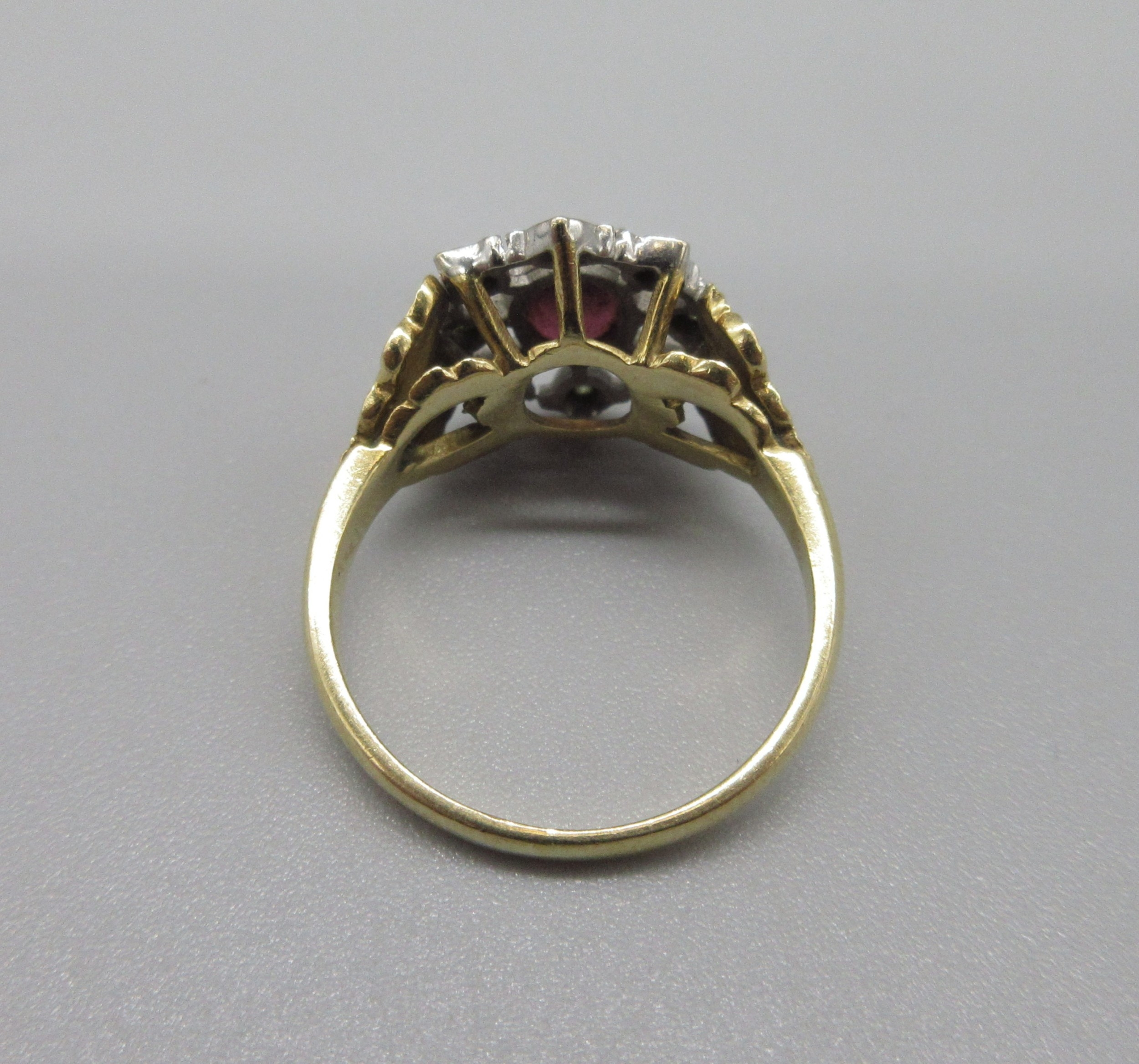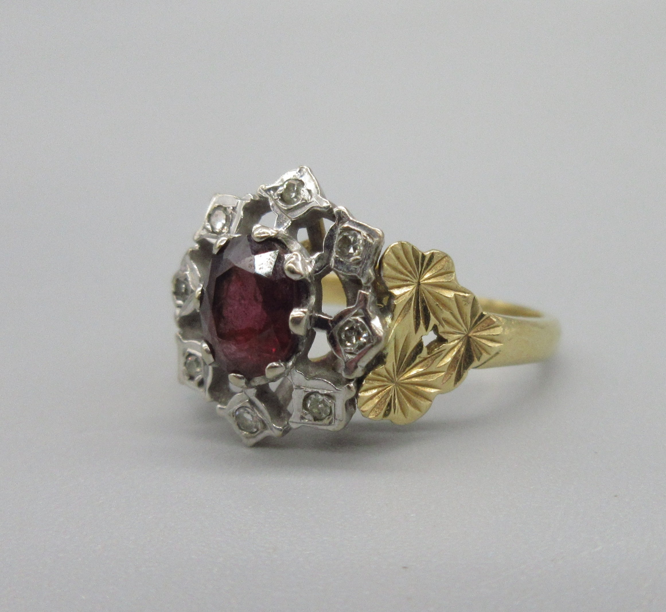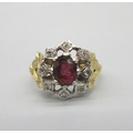 Georgian style 18ct yellow gold ruby and diamond ring, oval cut ruby with a pierced halo of diamonds, moulded shoulders with etched detail, stamped 18ct, size K1/2, 4.1g