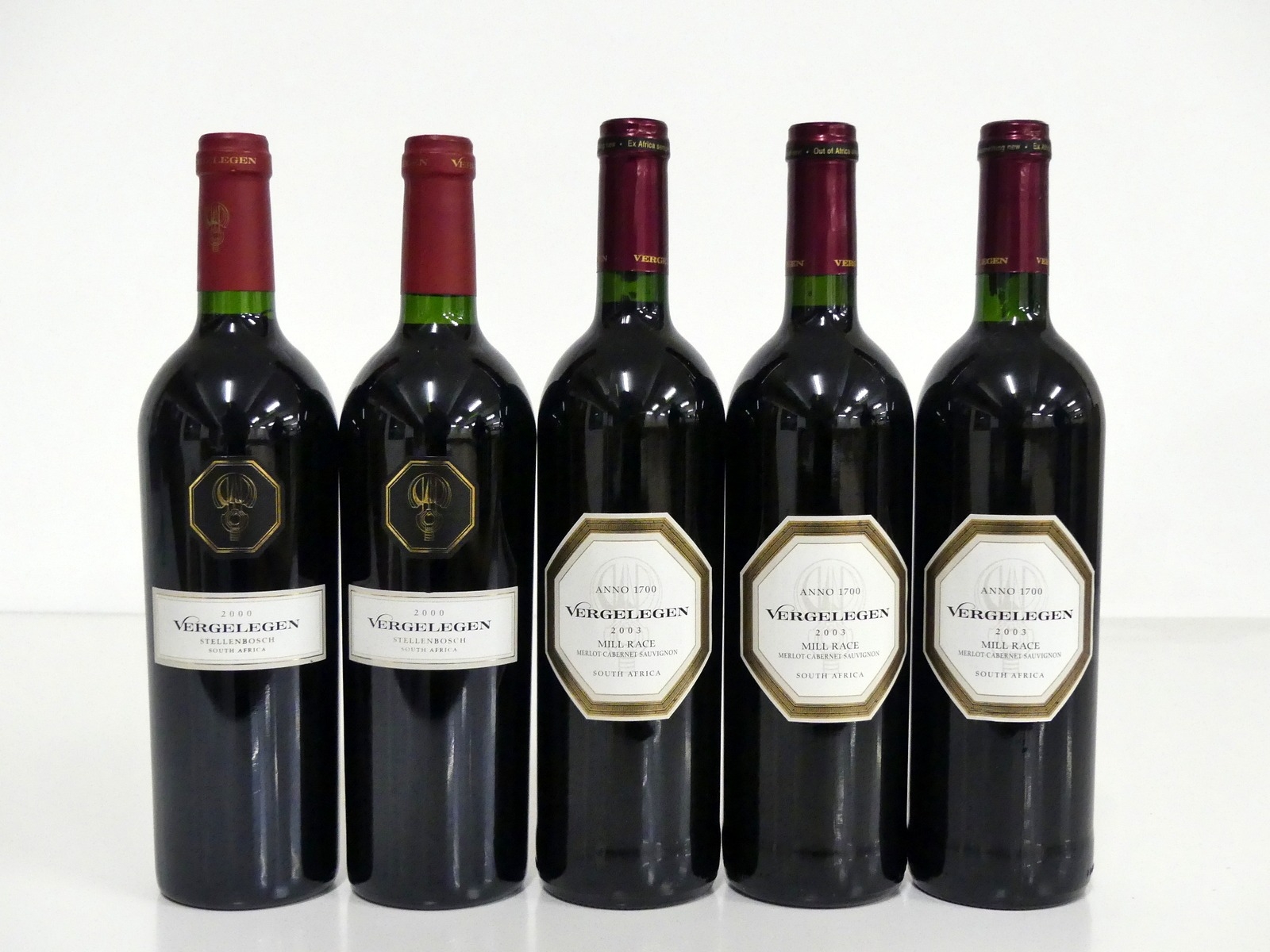 2 bts Vergelegen 2000 Stellenbosch i.n 3 bts Vergelegen Mill Race Merlot, Cabernet Sauvignon 2003 Stellenbosch 2 i.n, 1 vts Above 5 bottles