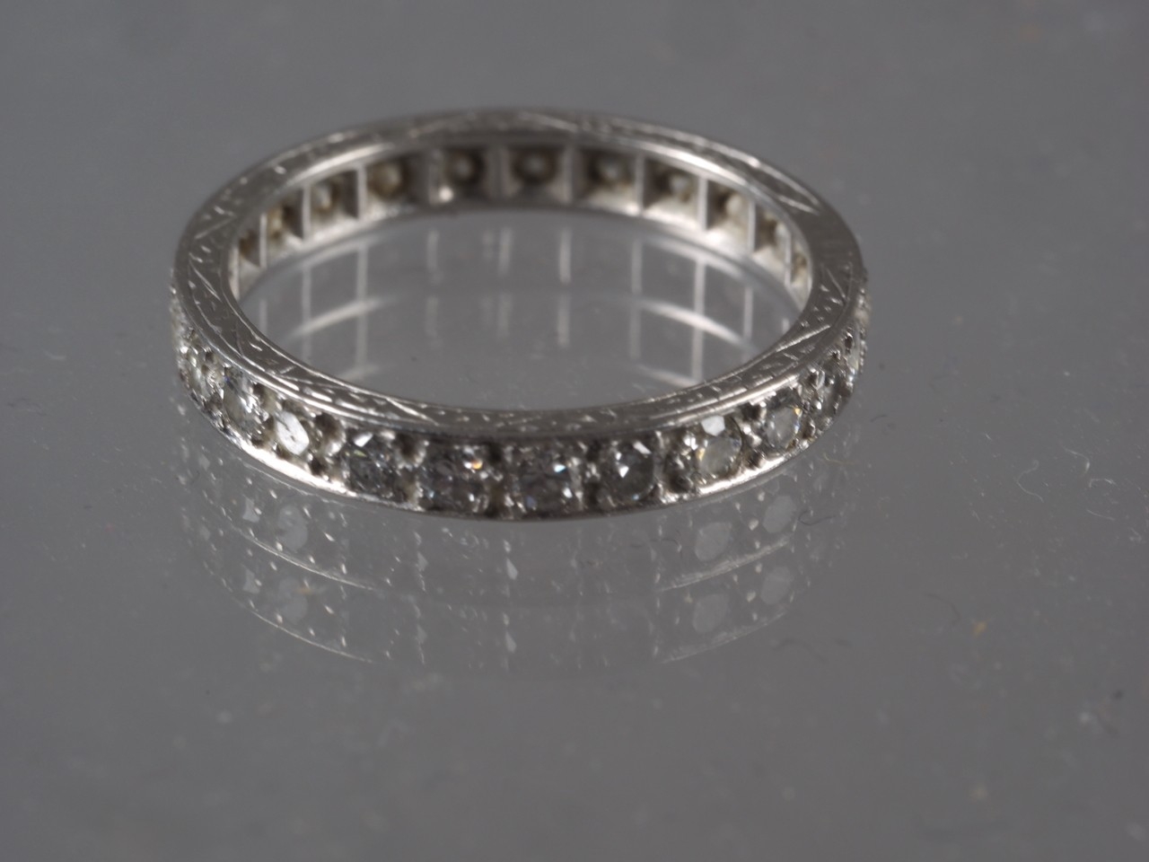 A platinum and diamond full eternity ring, setting with engraved decoration, 3.3g, ring size M 1/2