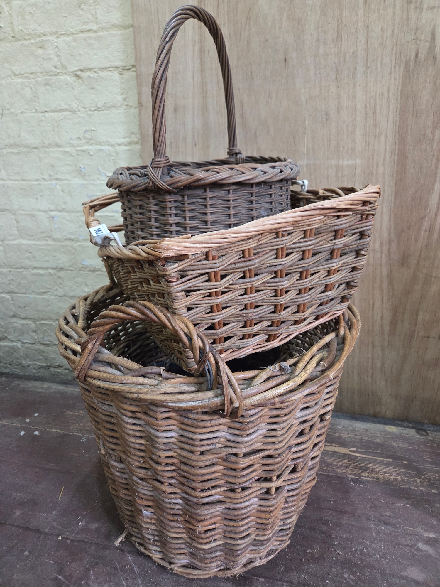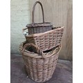 Five various vintage wicker and log carrying baskets