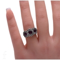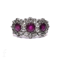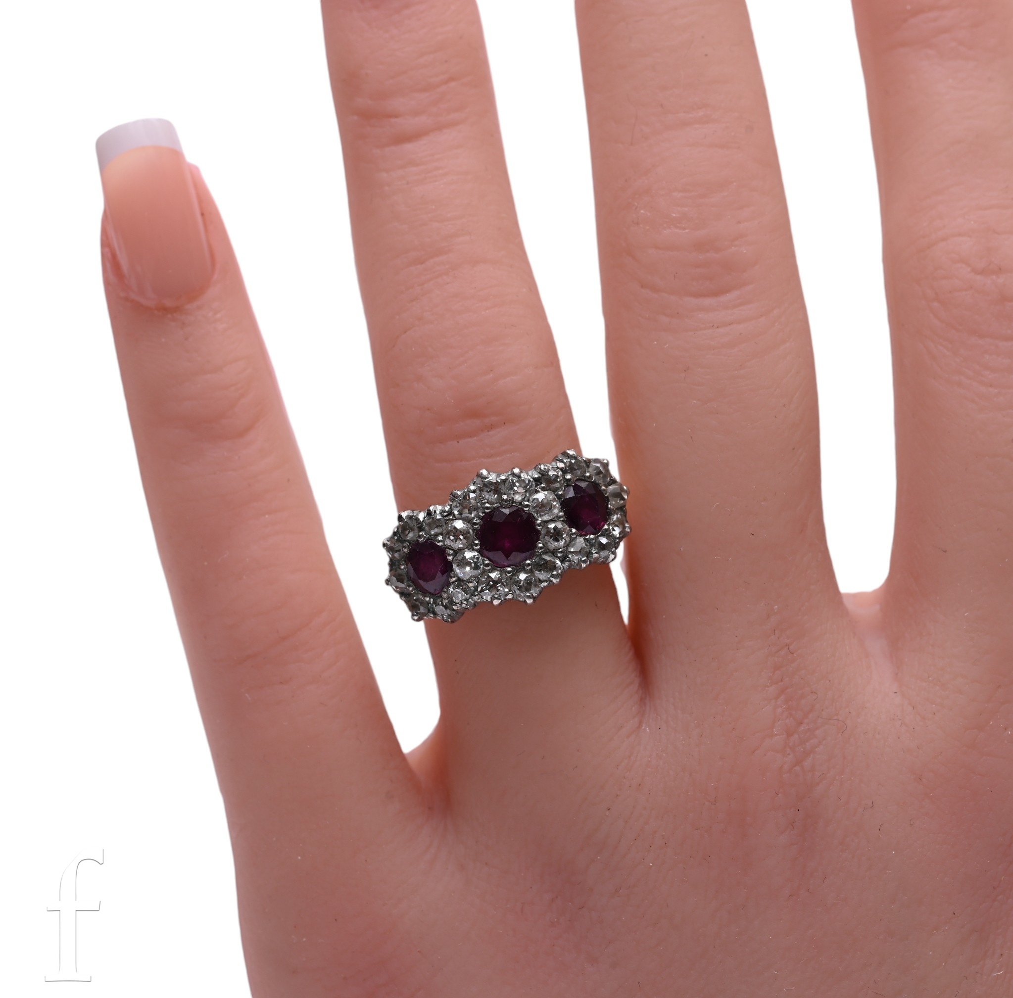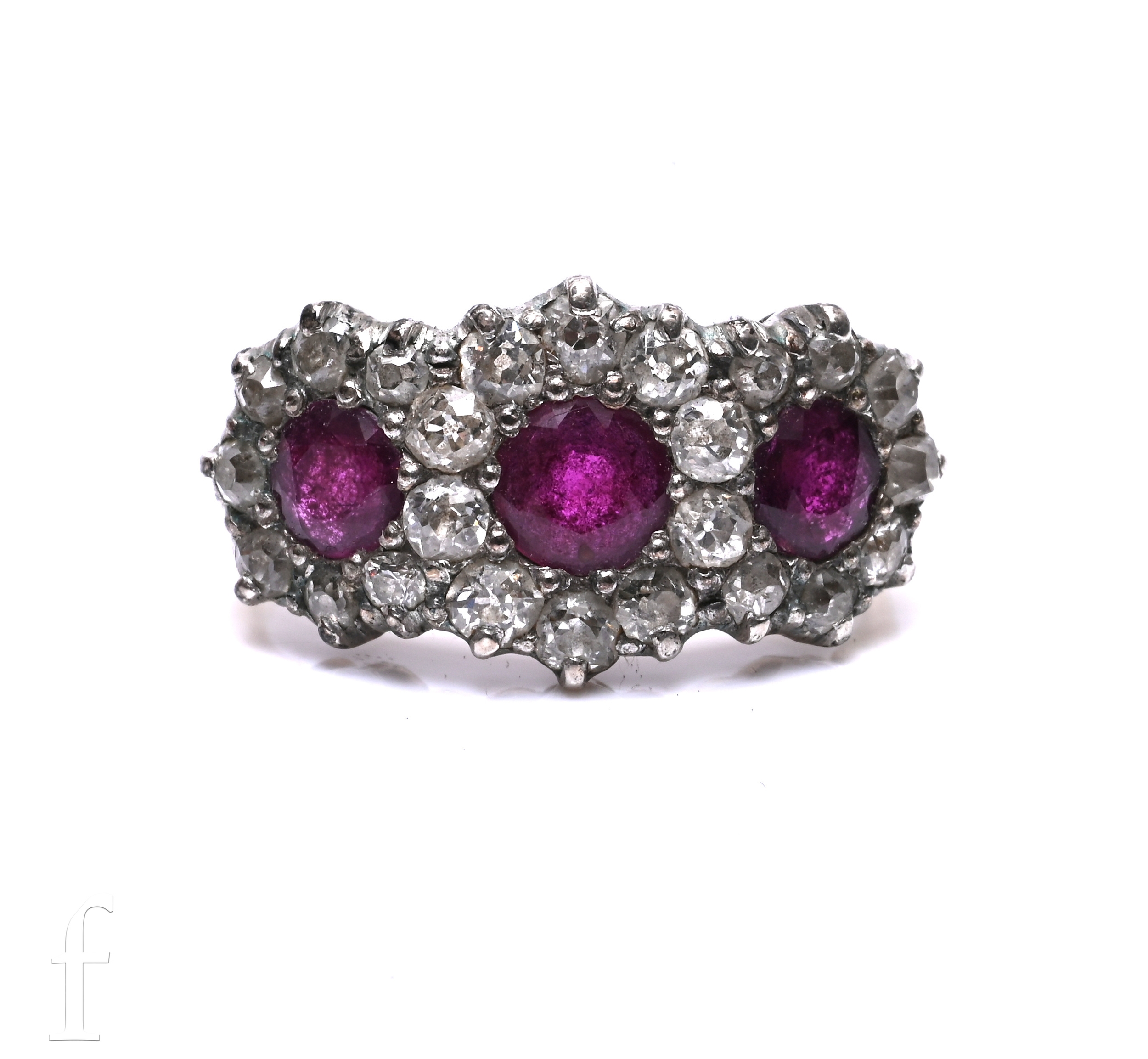 A ruby and diamond ring, circa 1900, the three circular mixed-cut rubies, set with old brilliant-cut diamonds, above pierced mounts, tapering plain shoulders, total weight 3.6g, ring size M1/2.