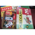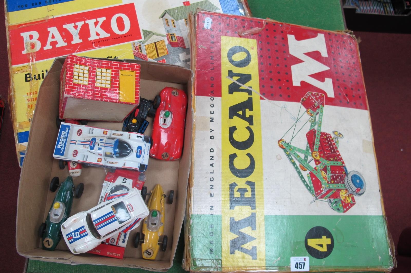 Eight Tri-ang/Scalextric Slot Cars, spares/repairs to include Jaguar D-Type, F Porsche; together with a Meccano Set No.4 and Bayko Building Outfit 14 (both unchecked for completeness).